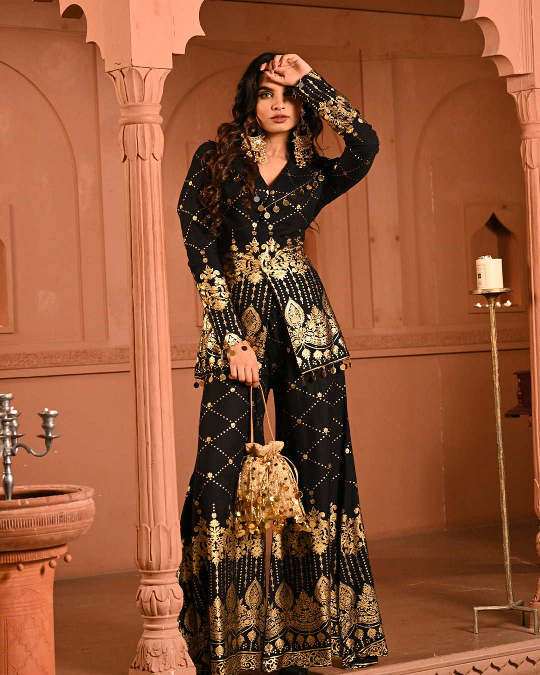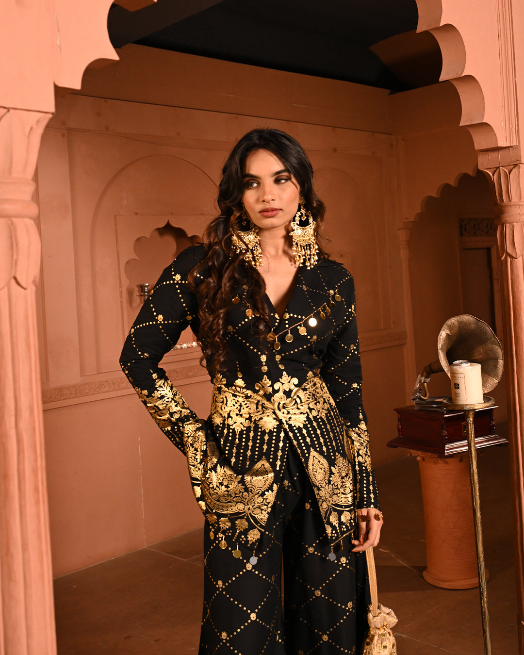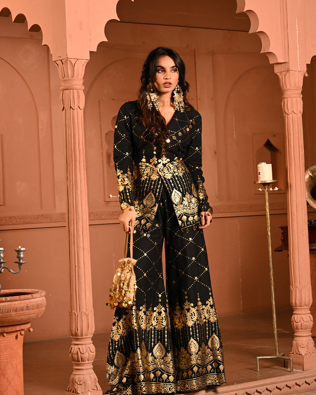 This blazer and pant co-ord is a striking fusion of festive grandeur and contemporary tailoring, designed to make an effortless statement. Crafted on a lightweight rayon base, the ensemble carries the signature foil detailing that defines the collection, creating a gleaming surface that reflects light with every move and enhances its luxurious character.The blazer is designed with a classic notch lapel collar, elevated with intricate mirror tassel lace that adds both shimmer and artisanal charm. The back-side dori detailing along the seams not only lends adjustability for a customized fit but also introduces a layer of festive playfulness. Full-length sleeves maintain an elegant, polished silhouette, making the blazer versatile for celebratory evenings. The high-waist flared pants complement the blazer perfectly, creating a balanced yet dramatic silhouette. Tailored with an elasticated waistband for ease of wear, the pants feature practical side pockets on both sides, marrying comfort with design. The foil work across the fabric lends depth and festive richness, while the fluid drape of rayon ensures graceful movement.Together, the set is a seamless blend of intricate foiling artistry, thoughtful tailoring, and festive-ready elegance. With its lustrous finish and flowing silhouettes, this ensemble becomes a timeless addition for celebratory occasions where tradition and modern luxury meet.