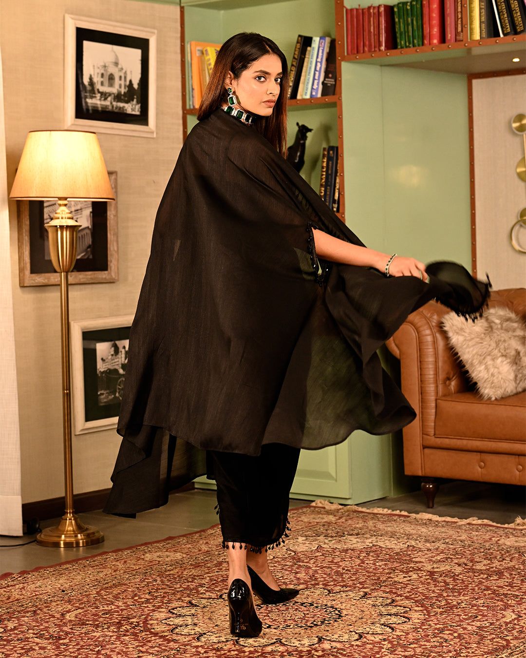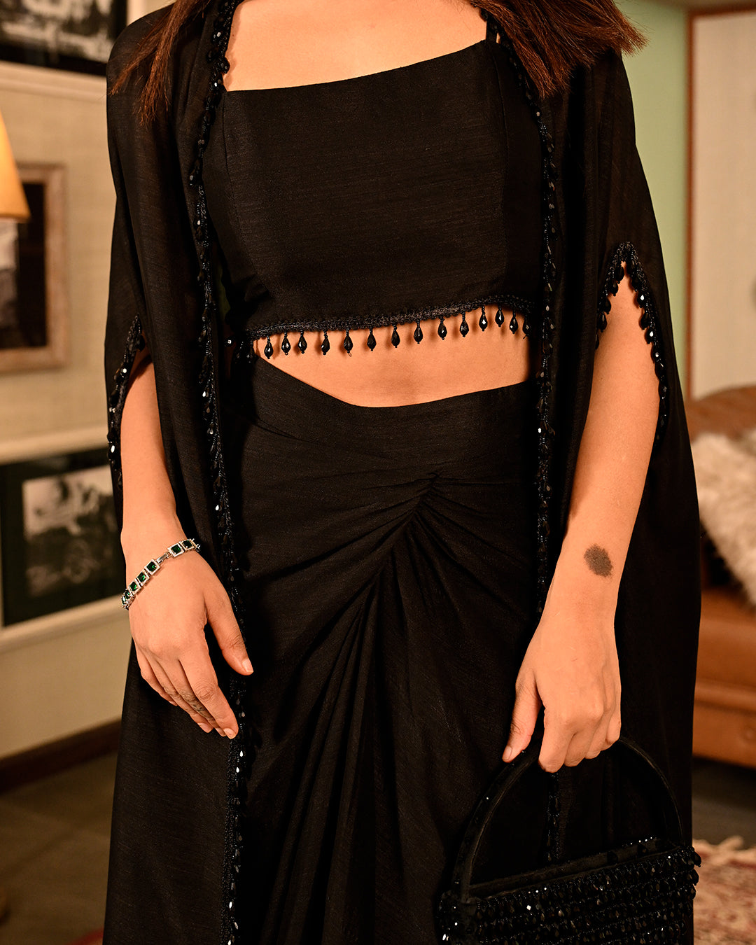 This stunning 3-piece co-ord set is the ultimate festive ensemble. Featuring a chic crop top with noodle straps, it beautifully highlights the collarbones and neckline. The flowing skirt adds an elegant touch, while the loose shrug, adorned with delicate lace, completes the look with a dash of festive flair. Perfect for any occasion, this set exudes effortless style. Pair it with a bold statement neckpiece or a stylish headband, and finish the look with a sleek clutch and heels. Whether attending a celebration or a special event, this co-ord set guarantees a head-turning appearance.