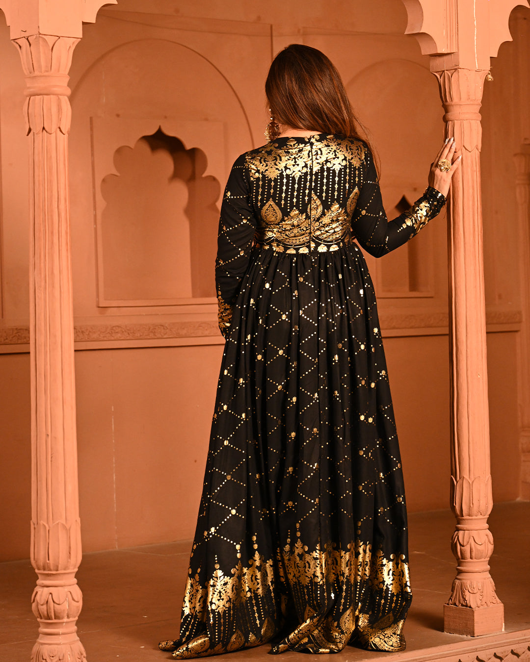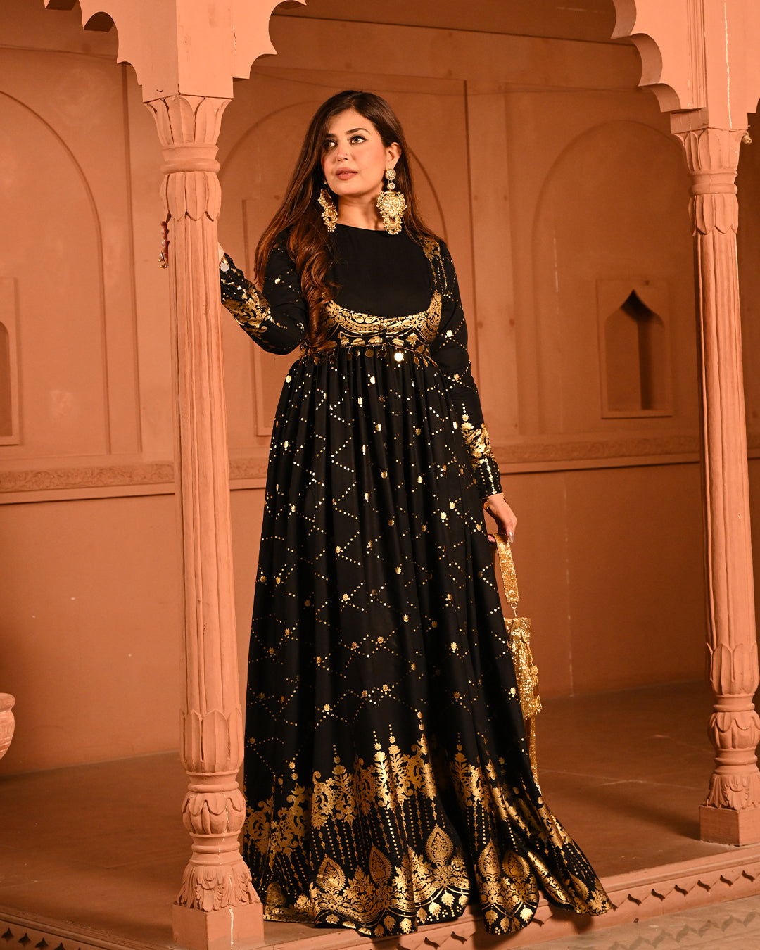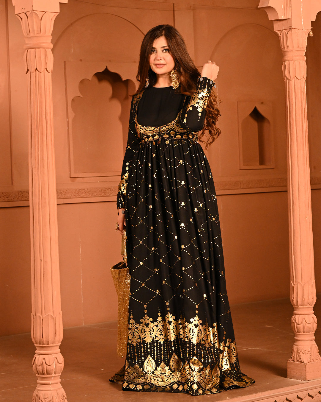 This flared Anarkali is a regal statement piece, crafted to embody festive grandeur with a seamless blend of tradition and modern refinement. Designed in a flowing Anarkali silhouette, it features an attached koti that enhances its royal appeal while providing a structured yet graceful fall. The round neckline paired with full sleeves and fitted cuffs adds to its classic charm, while the back zipper ensures a clean and easy fit. The base fabric is soft, breathable rayon, chosen for its fluid drape and comfort, making it an ideal canvas for the striking foil work. This collection is defined by its intricate foiling, and here the heavy foil detailing captures light beautifully, creating a lustrous finish that elevates the garment’s festive aura. The flowing hemline adds movement and grace, perfect for celebrations where elegance meets comfort. Thoughtful additions like side pockets and a seamless finish make this piece both functional and sophisticated. The combination of foil artistry, rayon’s lightweight ease, and the indulgent silk border makes it an exceptional choice for festive occasions, where tradition is celebrated with contemporary flair.