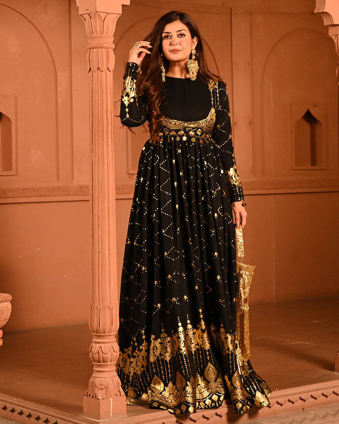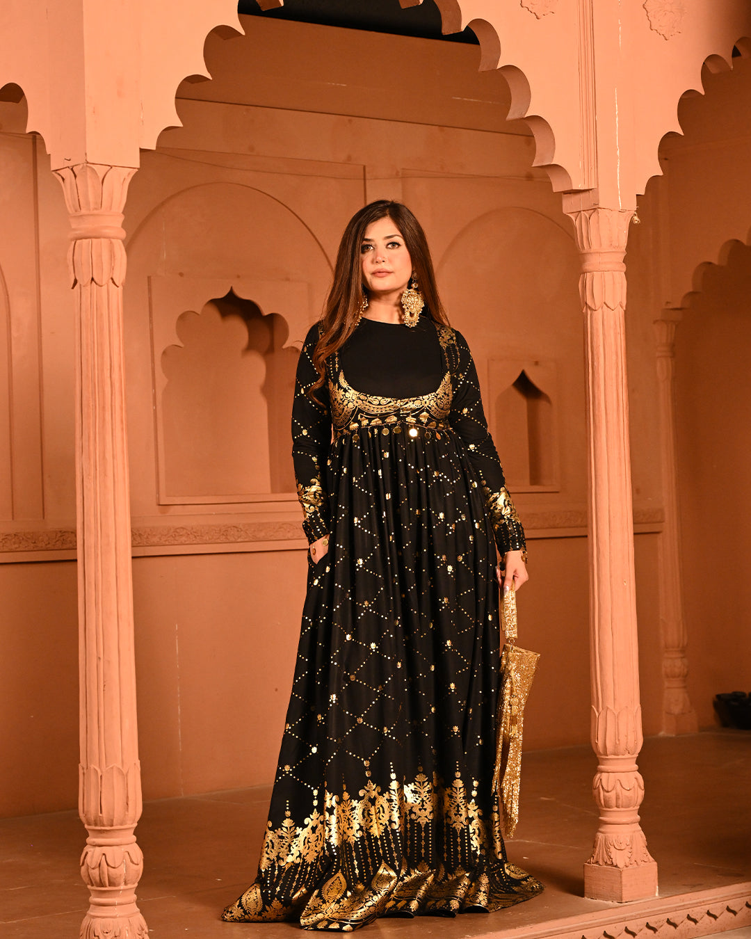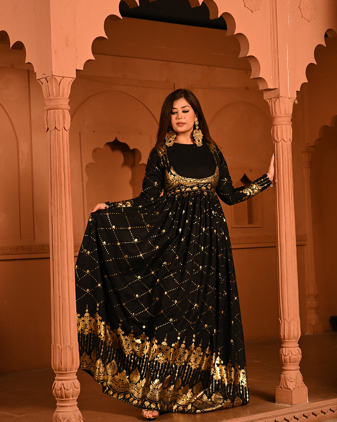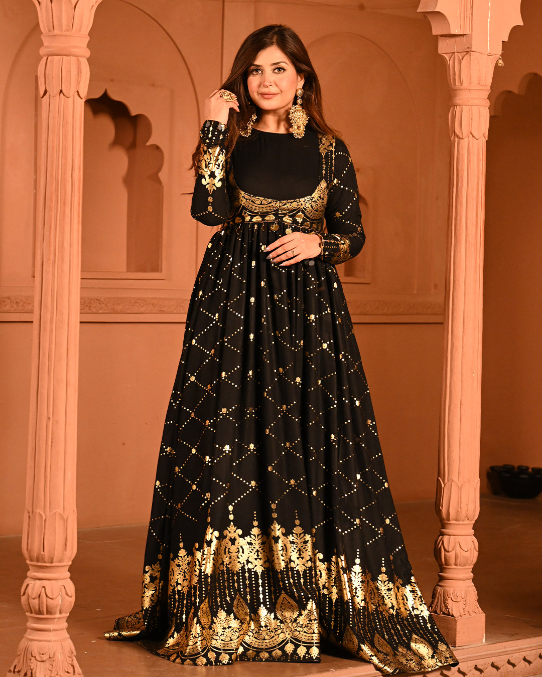 This flared Anarkali is a regal statement piece, crafted to embody festive grandeur with a seamless blend of tradition and modern refinement. Designed in a flowing Anarkali silhouette, it features an attached koti that enhances its royal appeal while providing a structured yet graceful fall. The round neckline paired with full sleeves and fitted cuffs adds to its classic charm, while the back zipper ensures a clean and easy fit. The base fabric is soft, breathable rayon, chosen for its fluid drape and comfort, making it an ideal canvas for the striking foil work. This collection is defined by its intricate foiling, and here the heavy foil detailing captures light beautifully, creating a lustrous finish that elevates the garment’s festive aura. The flowing hemline adds movement and grace, perfect for celebrations where elegance meets comfort. Thoughtful additions like side pockets and a seamless finish make this piece both functional and sophisticated. The combination of foil artistry, rayon’s lightweight ease, and the indulgent silk border makes it an exceptional choice for festive occasions, where tradition is celebrated with contemporary flair.