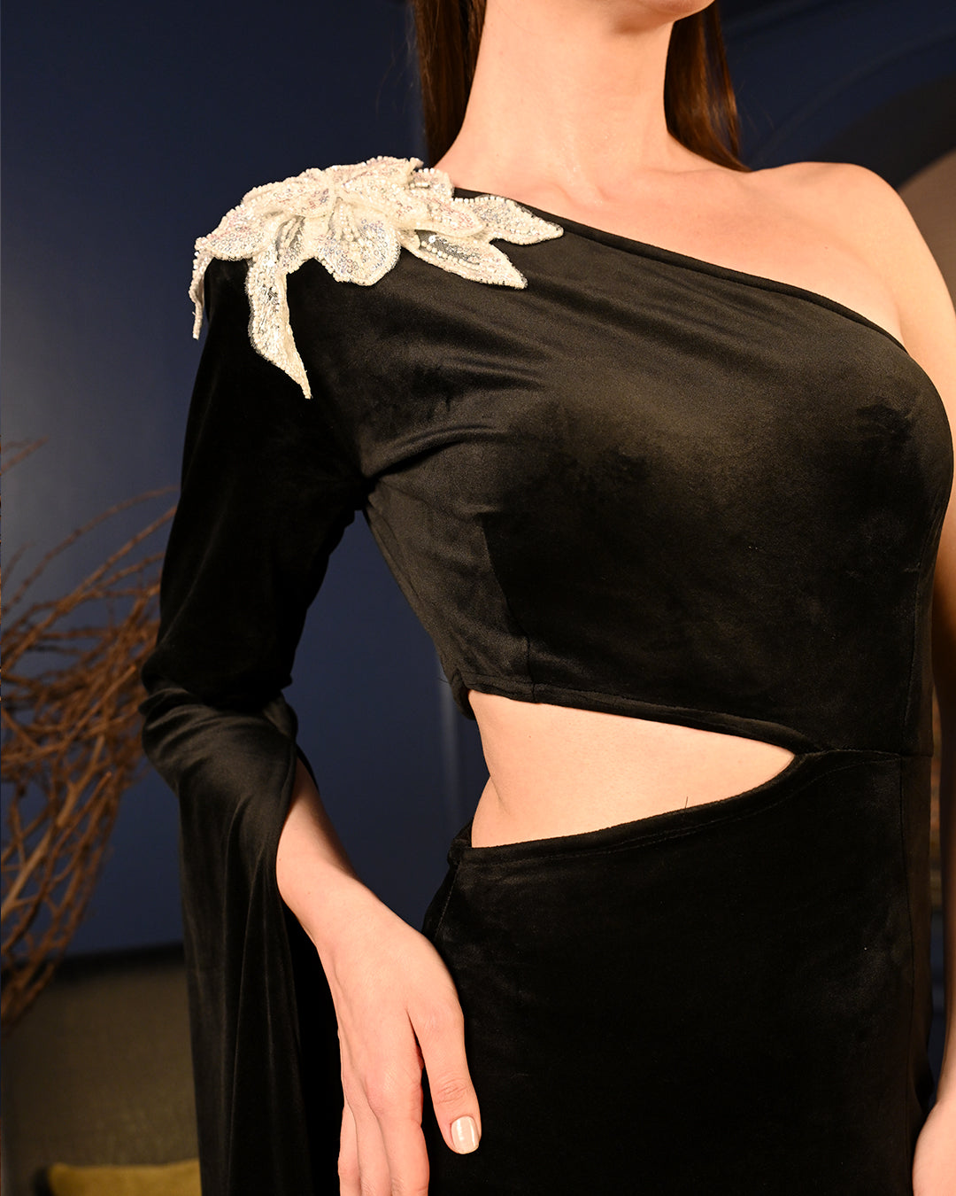 Unveil your inner goddess with the Black Velvet Eva Gown, a perfect fusion of elegance and bold design. This mesmerizing gown features a dramatic one-shoulder sleeve embellished with a snowy white beaded flower patch that draws attention and adds a touch of ethereal beauty. The asymmetrical neckline accentuates the collarbone, adding a refined, feminine allure, while the structured shoulder pad creates a statement power look.