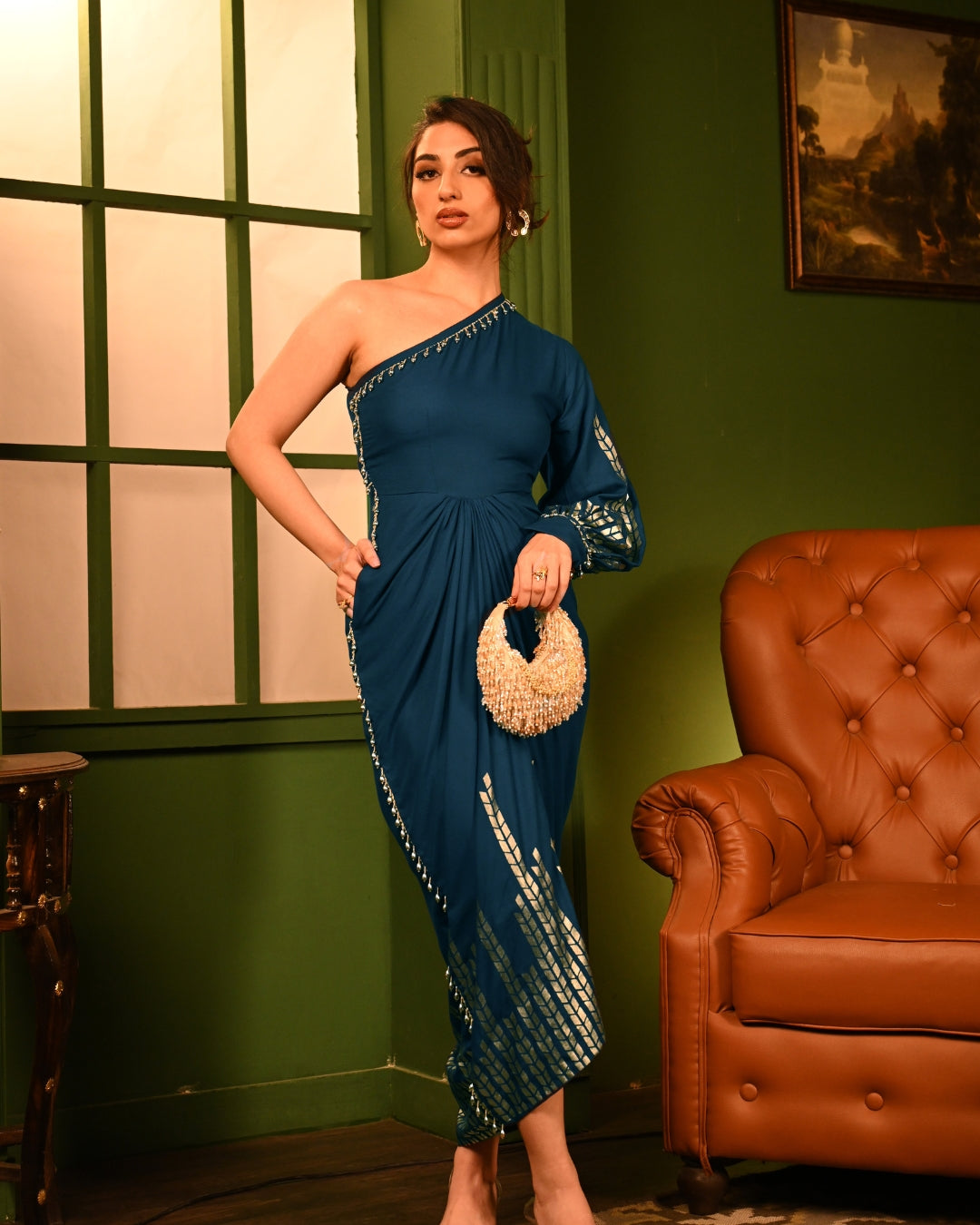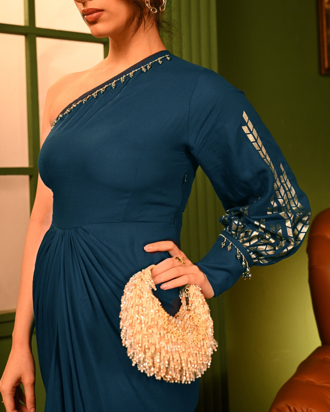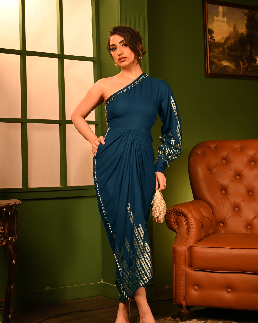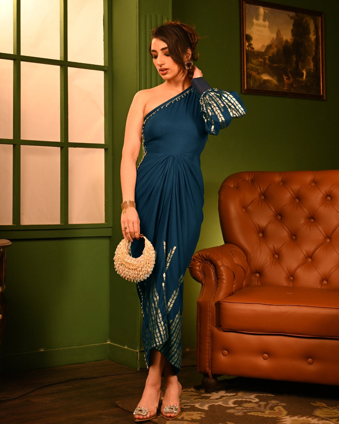 Elegance Meets Glamour – Blue Oak Foil Asymmetrical Dress