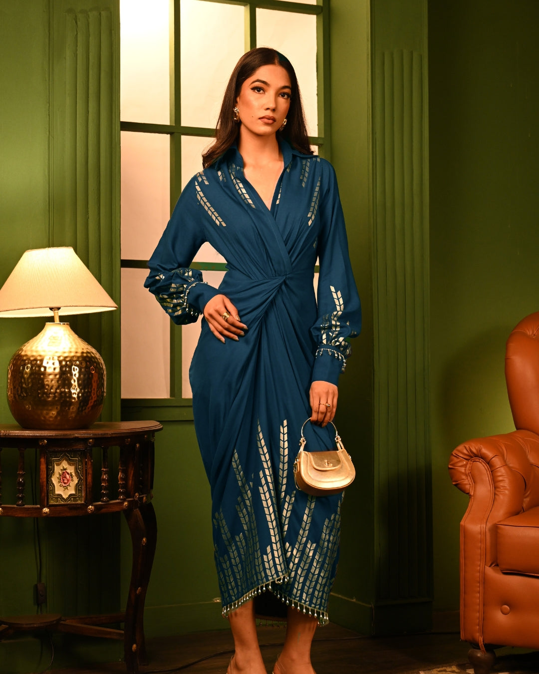 Step into the spotlight with our Blue Oak Foil Shirtdress, a bold fusion of power and elegance that reflects your inner strength and beauty. Crafted for the woman who commands attention, this mesmerizing piece drapes you in a luminous gold foil print that shimmers with every movement, radiating confidence and allure. The soft rayon fabric flows like a gentle breeze, draping gracefully to enhance every curve. The shimmering foil print adds a glamorous touch, making every outfit shine with effortless sophistication.