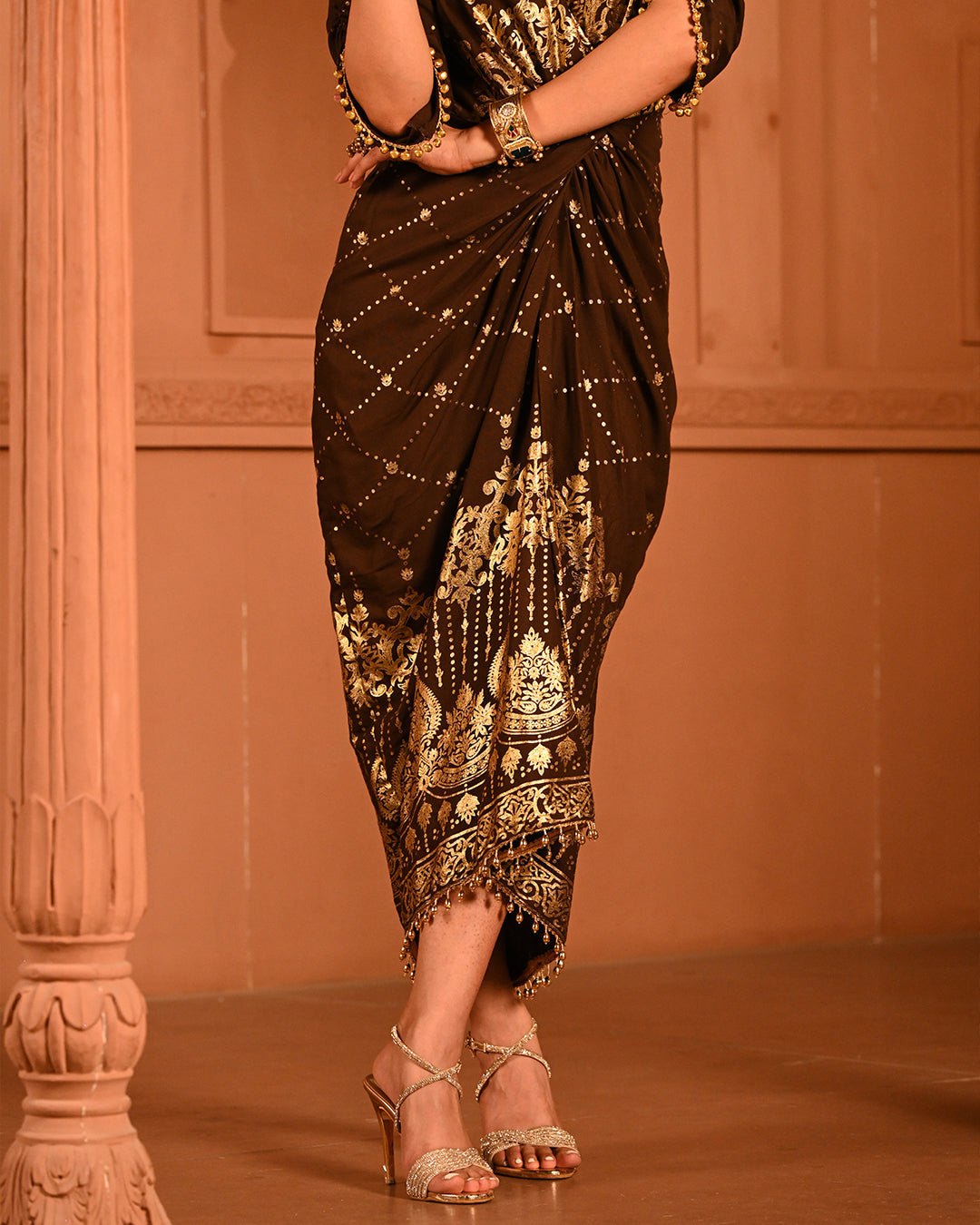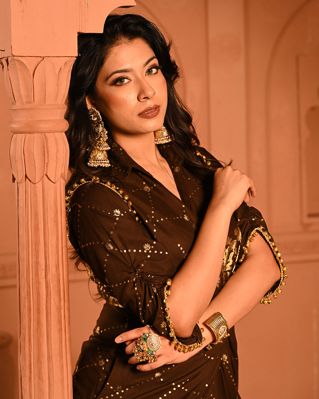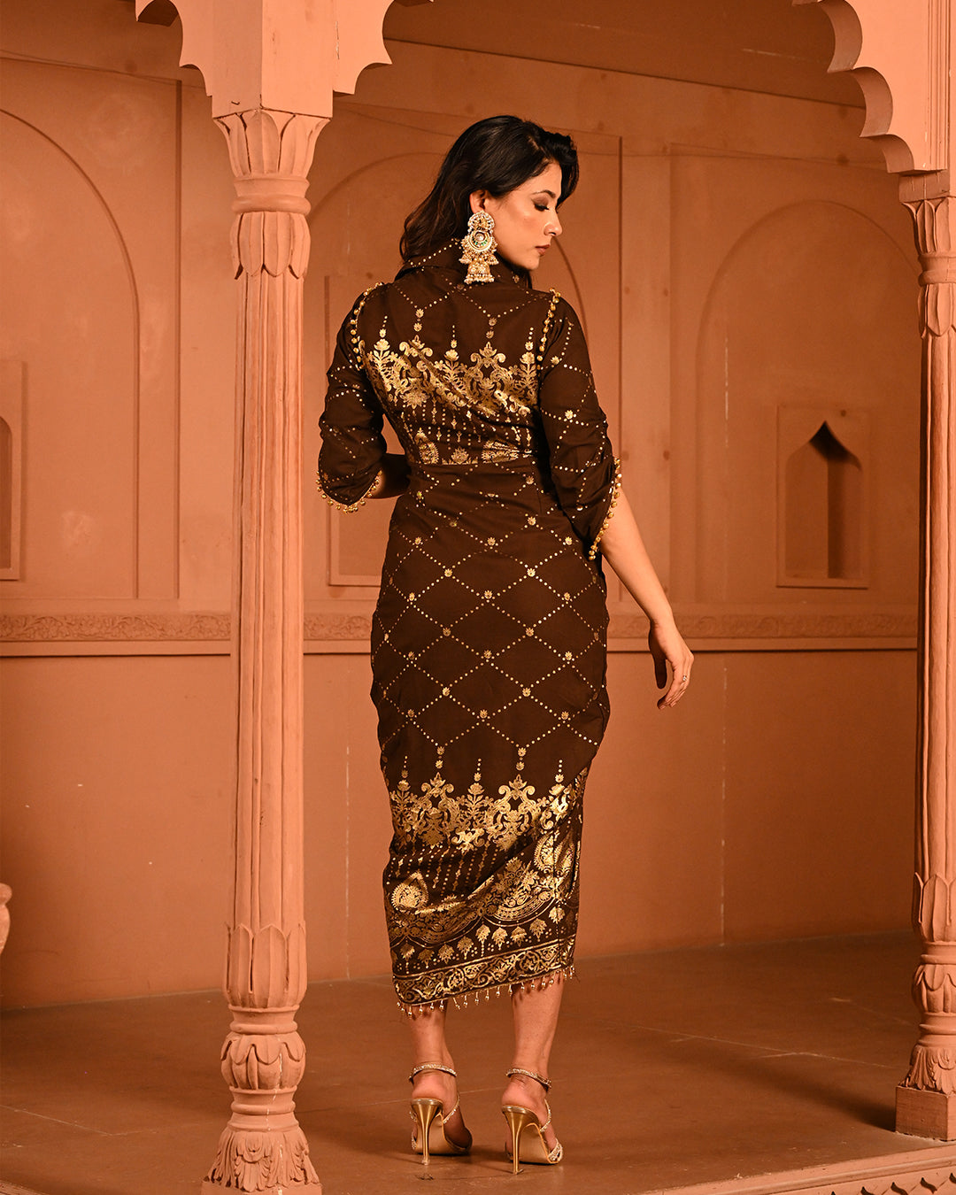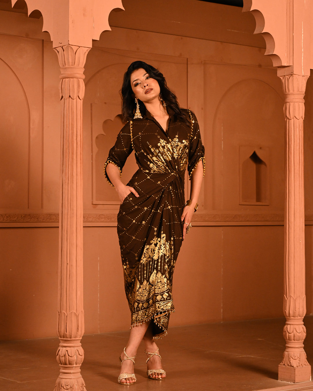 This calf-length dress is a perfect blend of contemporary elegance and festive charm, designed to celebrate the joy of special occasions. Crafted on soft, fluid rayon, it offers a luxurious drape that flatters the waist with its expertly tailored front drape style, creating a snatched, feminine silhouette. The shirt collar and V-neckline add a modern, structured touch, balancing the playful and ornate elements of the design.The standout feature of this dress lies in its intricate ghungroo embellishments on the shoulders and sleeves. Each subtle chime of the ghungroos brings a melodic, celebratory effect, enhancing the festive spirit while adding movement and texture to the ensemble. The 3/4 tulip sleeves lend a graceful finish, combining traditional charm with contemporary styling.The dress is adorned with delicate foil work, lending a lustrous finish and subtle shimmer across the fabric, elevating its festive appeal. The side zip closure ensures a seamless fit, while the lightweight rayon ensures comfort and fluidity throughout the celebrations. With its modern ethnic touch, flowing hemline, and melodic ghungroo detailing, this dress is designed to make every moment unforgettable, effortlessly blending craftsmanship, style, and festivity.
