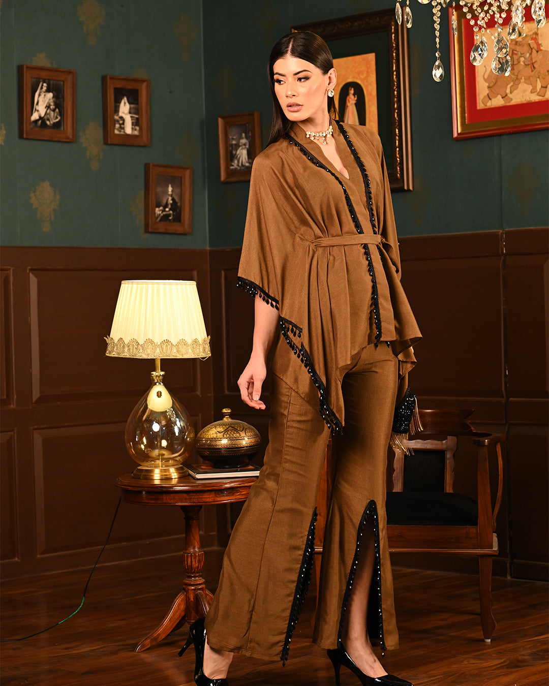 This chic kimono set effortlessly transitions from festive celebrations to semi-formal events. The loose kaftan offers comfort and grace, while the embellished belt adds a touch of structure, creating a flattering silhouette. Paired with flared pants featuring knee-high slits, the ensemble strikes the perfect balance between flowy elegance and modern flair. The outfit exudes understated glamour and can be styled with minimal accessories and light makeup to maintain a sophisticated yet relaxed vibe. Whether for a festive occasion or a semi-formal gathering, this kimono set ensures you stand out with ease and style.