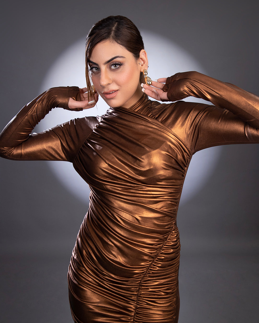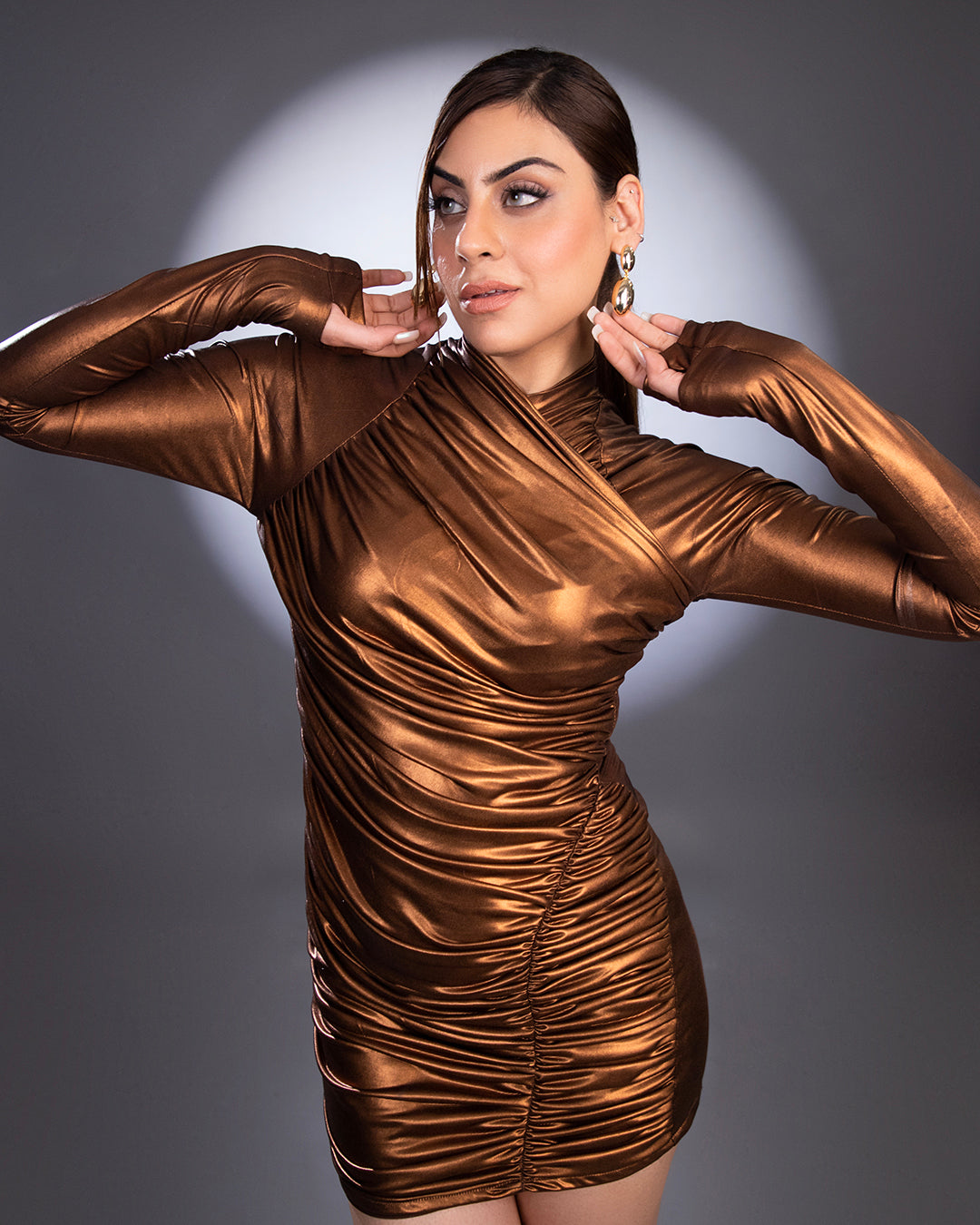 Introducing our stunning Body-Hugging Brown Metallic Short Dress, the epitome of sophistication and glamour. Elevate your wardrobe with this exquisite piece that seamlessly blends bold style with timeless elegance.