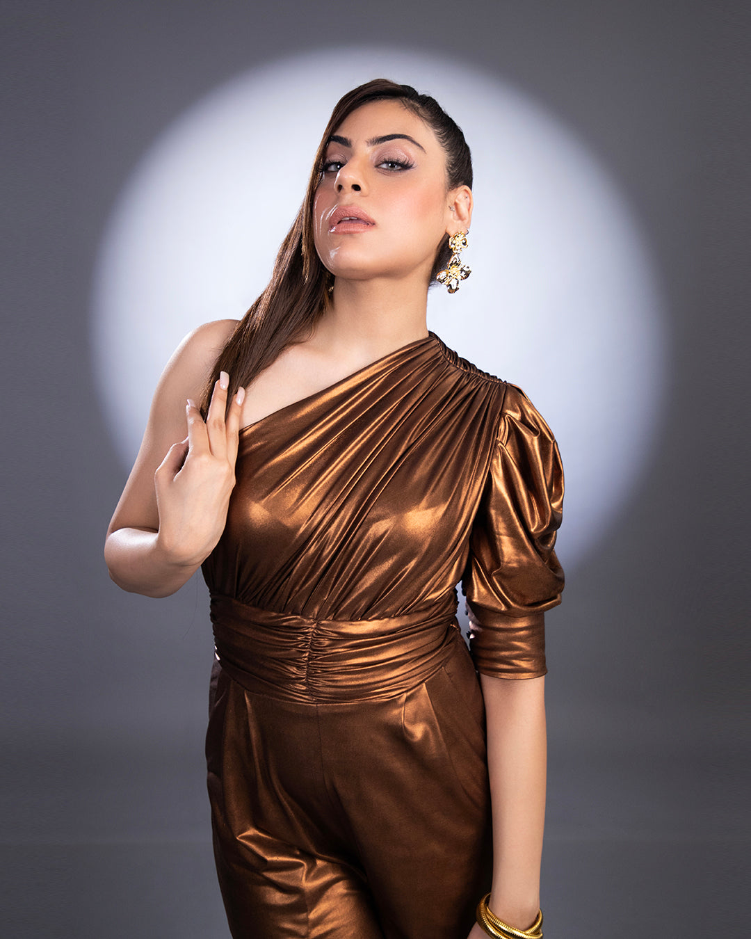 Enhance your wardrobe with the Posh Elegance Brown Metallic Jumpsuit – where full sleeves meet a one-shoulder design and puff sleeves, creating a jumpsuit that's as versatile as it is glamorous.