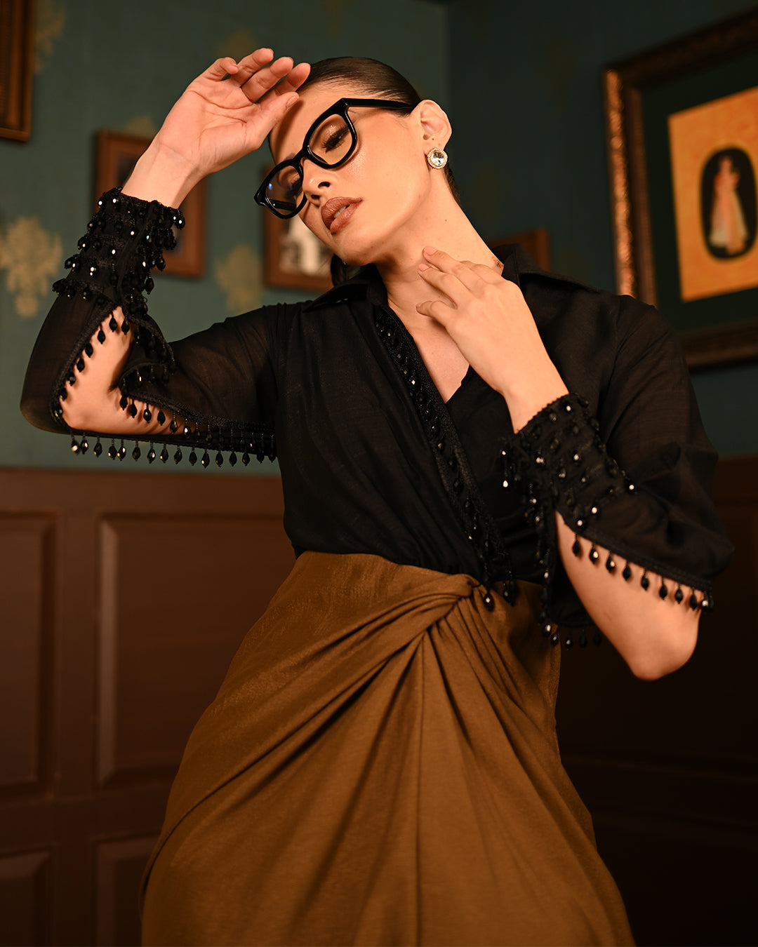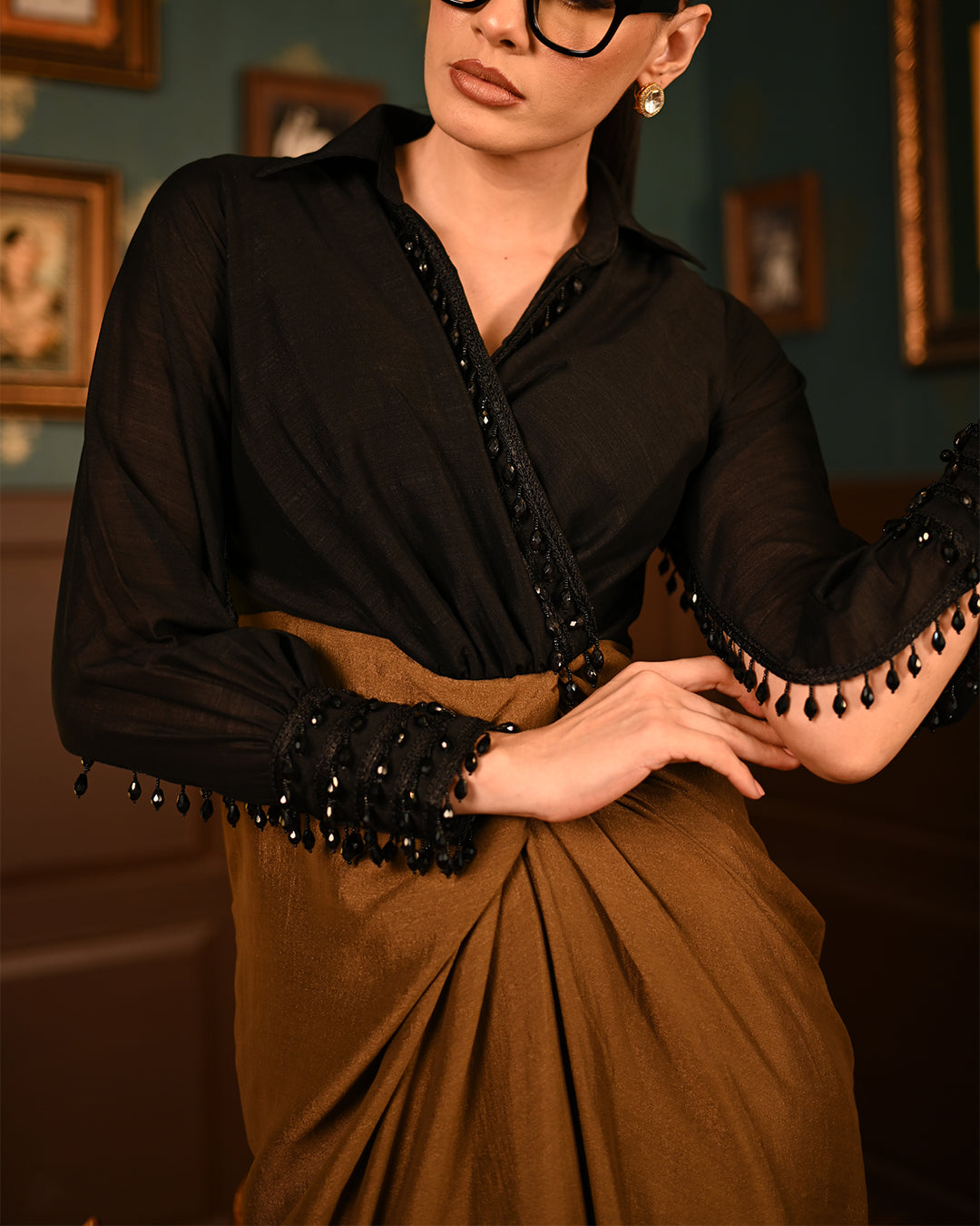 This stylish shirt dress with exaggerated balloon sleeves is the perfect blend of elegance and comfort for any occasion. Whether you're attending a corporate party or a Diwali card party, this dress offers versatility with its structured waistline that enhances your curves, creating a flattering silhouette. The dramatic sleeves add a touch of sophistication, making it ideal for both formal and festive events. Pair it with long earrings and sleek heels to elevate the look and add an extra layer of charm. This dress ensures you stay effortlessly chic while embracing comfort and style.