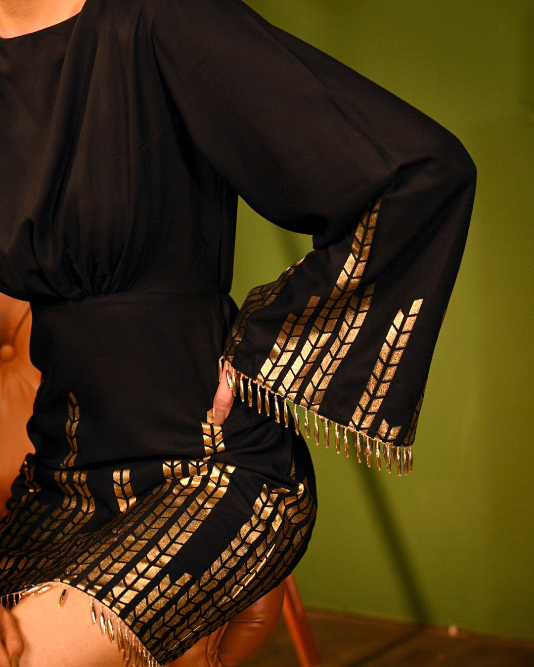 Step into the spotlight with our stunning Gold Oak Foil Sheath Dress—the ultimate blend of power and elegance. Designed to make you feel bold, confident, and effortlessly stylish in golden heus , this dress is a complete package of sophistication and allure. Designed to flow with you, this luxurious rayon fabric flatters every movement. Its foil print adds a luminous sheen, ensuring you stand out with grace and elegance.