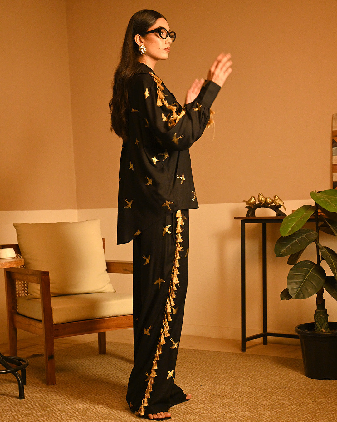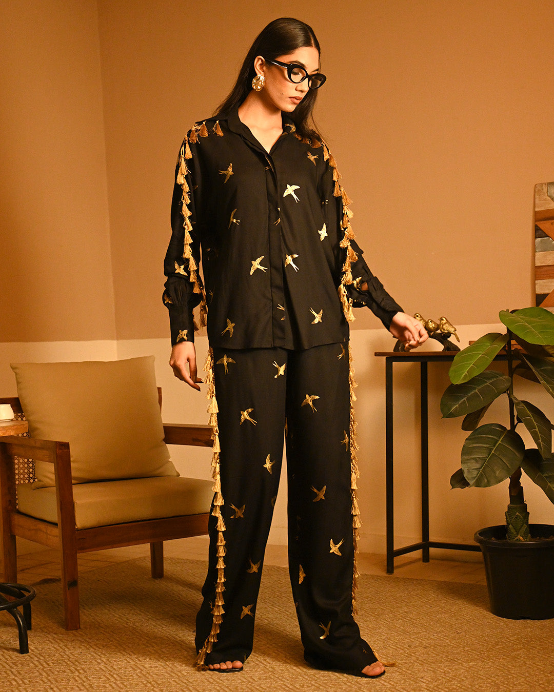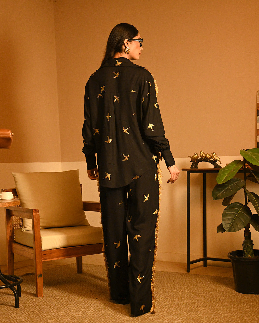 Embrace elegance and freedom with our Golden Bird Foil Shirt Set, a stunning blend of comfort and sophistication. This effortlessly stylish ensemble features a flowy loose-fit shirt paired with chic pants, both adorned with a mesmerizing golden bird foil print—a symbol of grace, confidence, and liberation. Like moonlight reflecting on water, this rayon fabric flows with a dreamy softness. The delicate foil print adds a touch of luxury, making the outfit shine with understated grace.