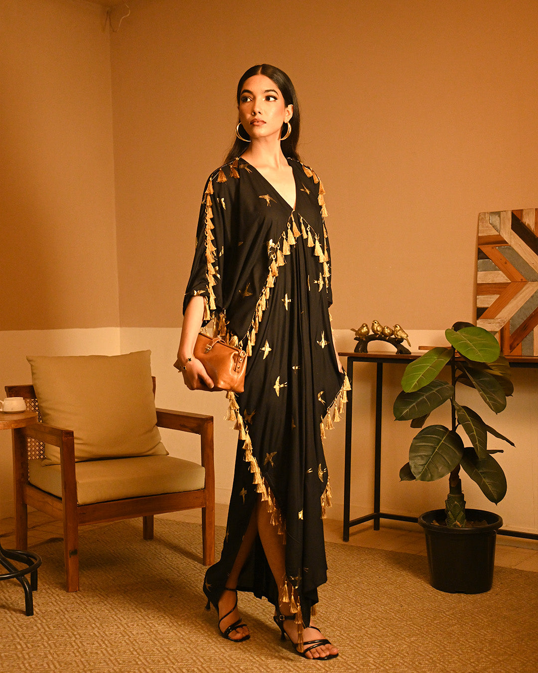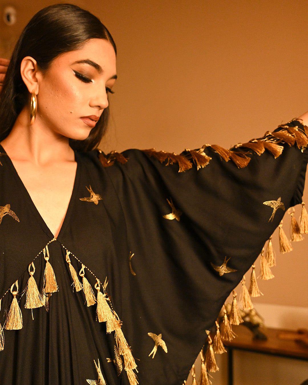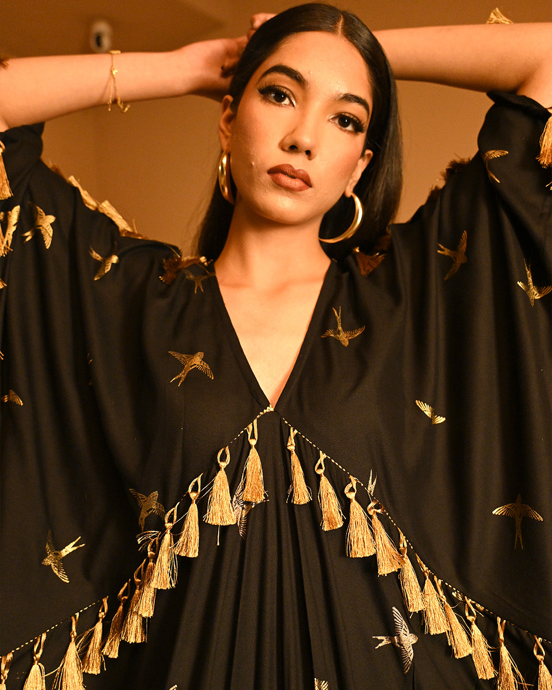 Designed for the modern woman who loves to blend chic with ease, this kaftan is your go-to for making a statement without trying too hard. The flowy raglan sleeves, adorned with tassel lace attachments, create a dreamy, free-spirited vibe, letting you glide with grace. The V-neckline adds a hint of allure, while the intricate lace detailing throughout symbolizes the essence of a flying girl—bold, fearless, and radiating positive energy. The rayon fabric is a masterpiece of softness and structure, flowing naturally with every movement. The foil detailing elevates its charm, making it the perfect balance of comfort and sparkle.