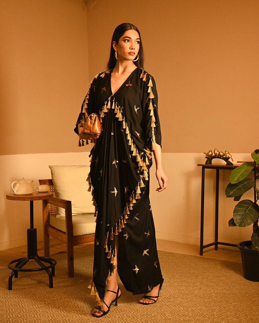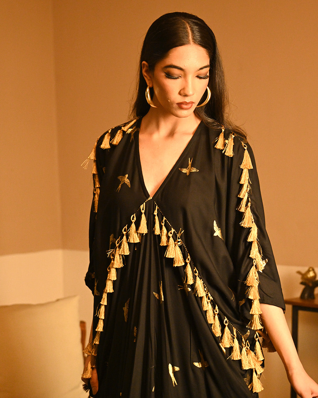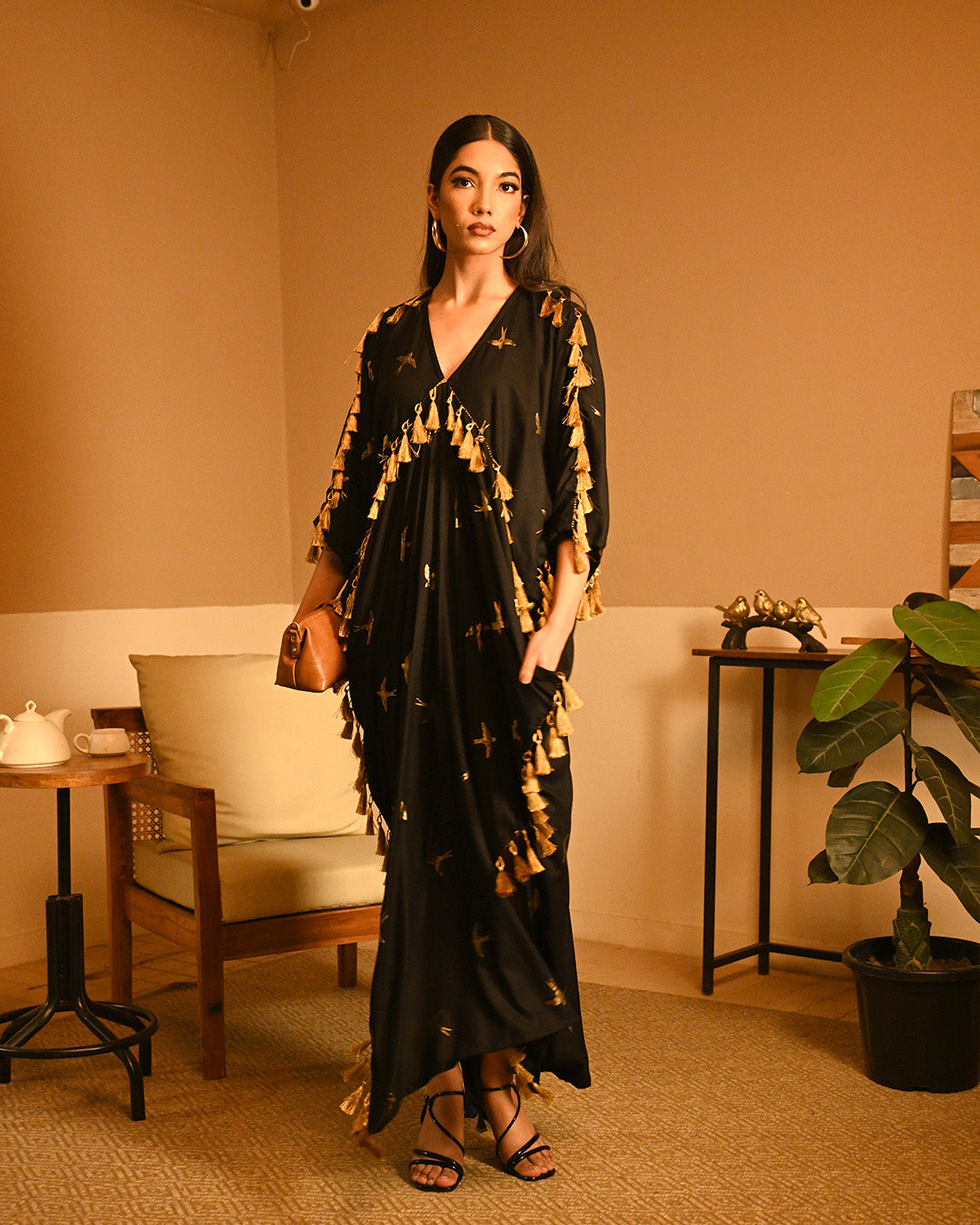 Designed for the modern woman who loves to blend chic with ease, this kaftan is your go-to for making a statement without trying too hard. The flowy raglan sleeves, adorned with tassel lace attachments, create a dreamy, free-spirited vibe, letting you glide with grace. The V-neckline adds a hint of allure, while the intricate lace detailing throughout symbolizes the essence of a flying girl—bold, fearless, and radiating positive energy. The rayon fabric is a masterpiece of softness and structure, flowing naturally with every movement. The foil detailing elevates its charm, making it the perfect balance of comfort and sparkle.