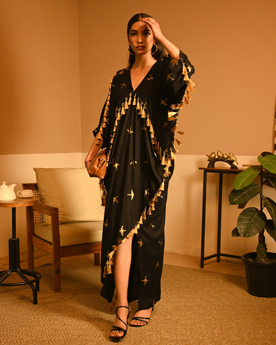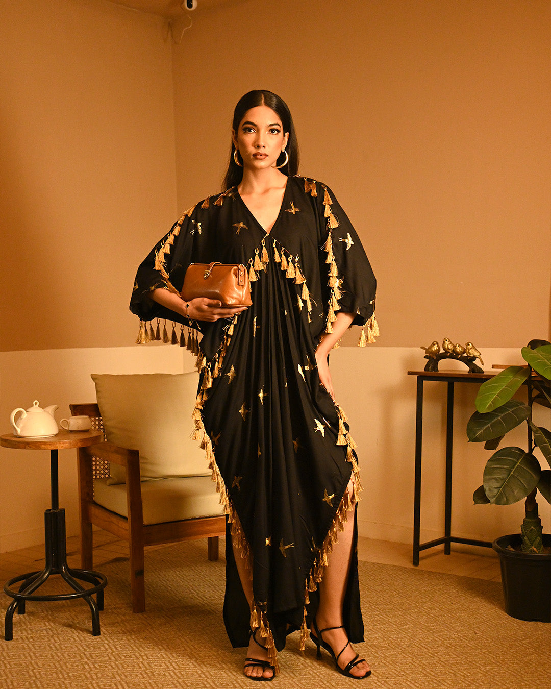 Pair it with strappy sandals for a boho-chic look or elevate it with heels for an evening glow. Whatever the occasion, this kaftan is your wings to confidence, grace, and undeniable style!