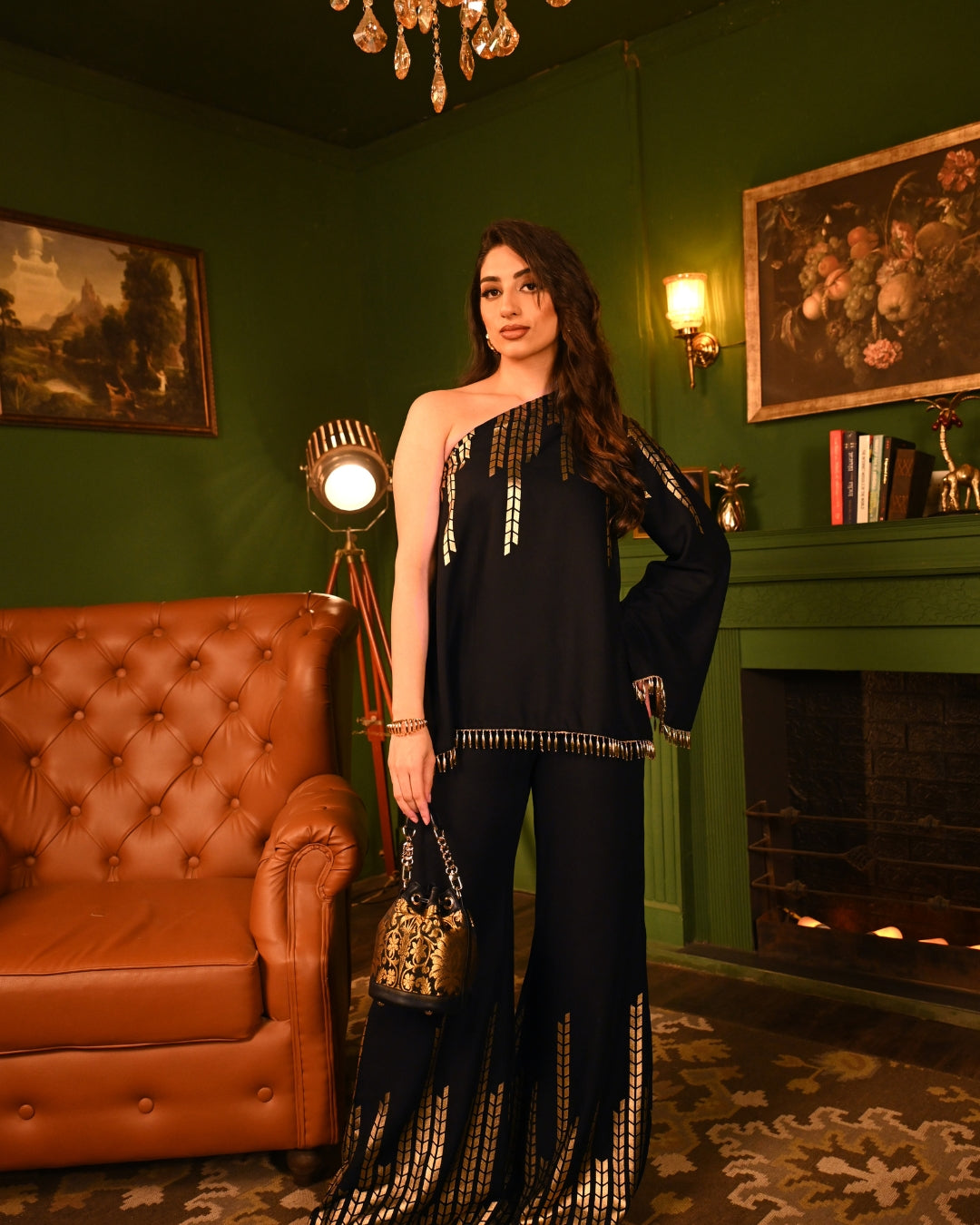 Paired with smartly tailored flared pants, this ensemble is the definition of effortless glamour. The pants feature a back zip closure for a seamless fit and two pockets—because style should always meet convenience. The foil print detail adds just the right amount of shimmer, making this co-ord set a must-have for every special occasion.