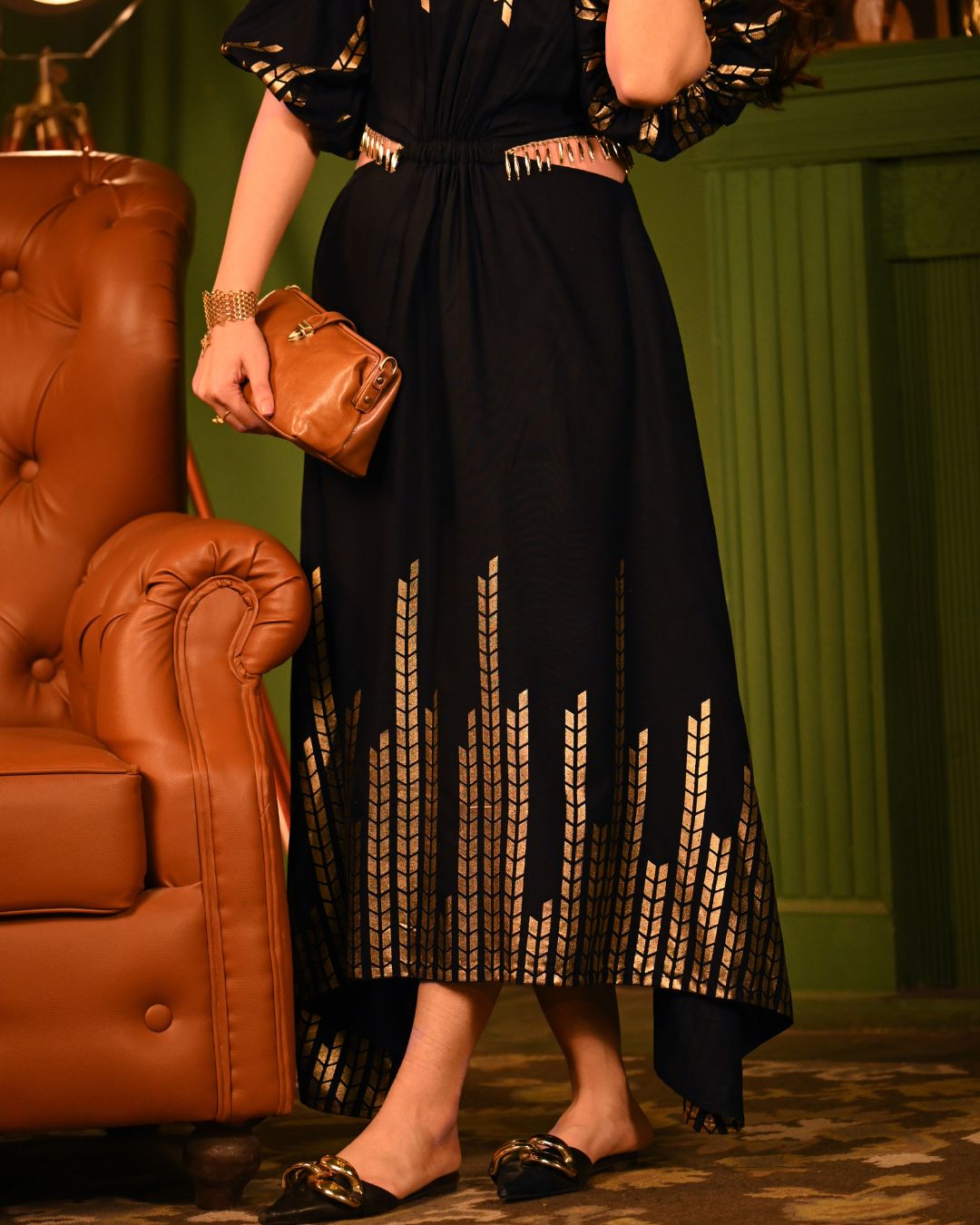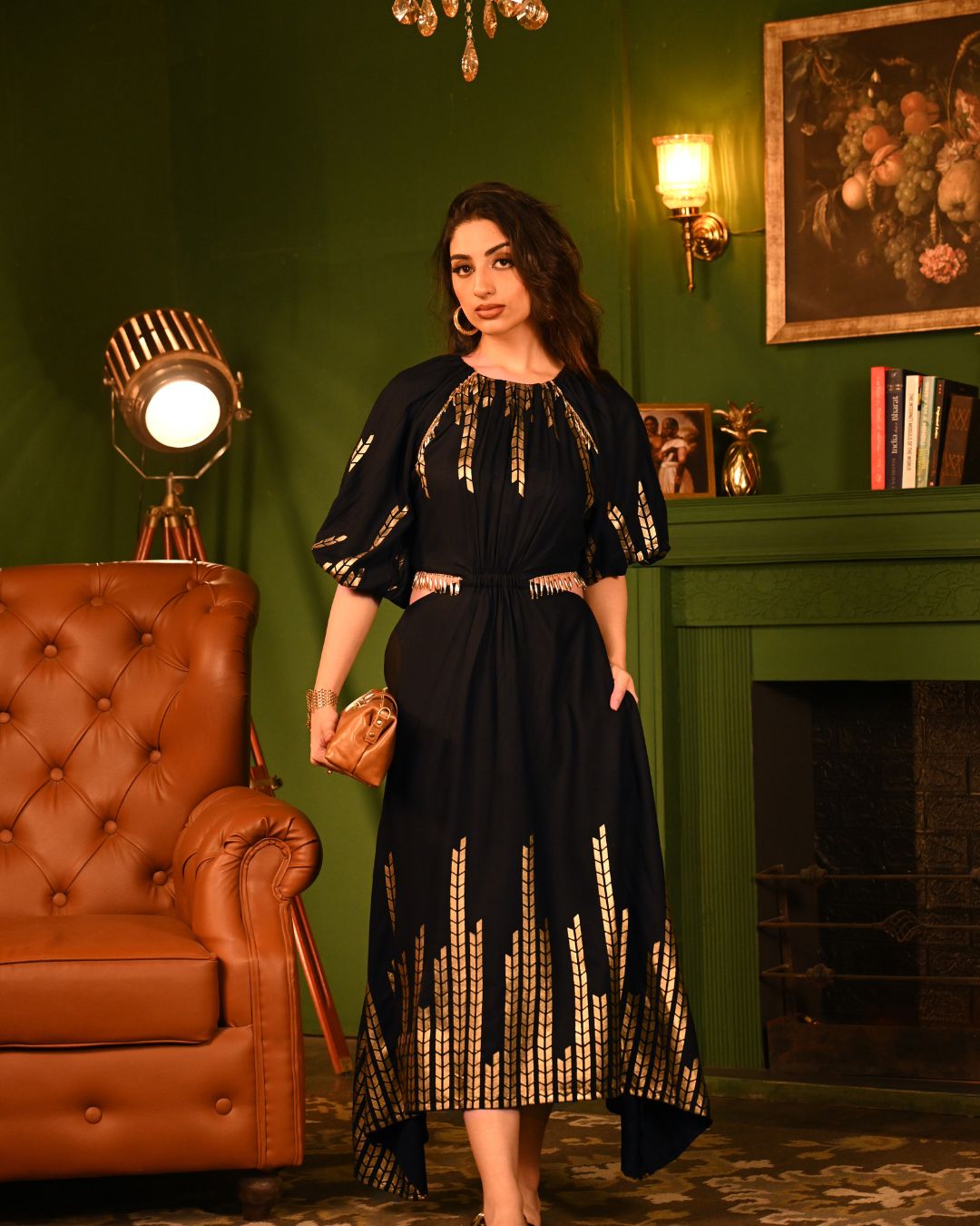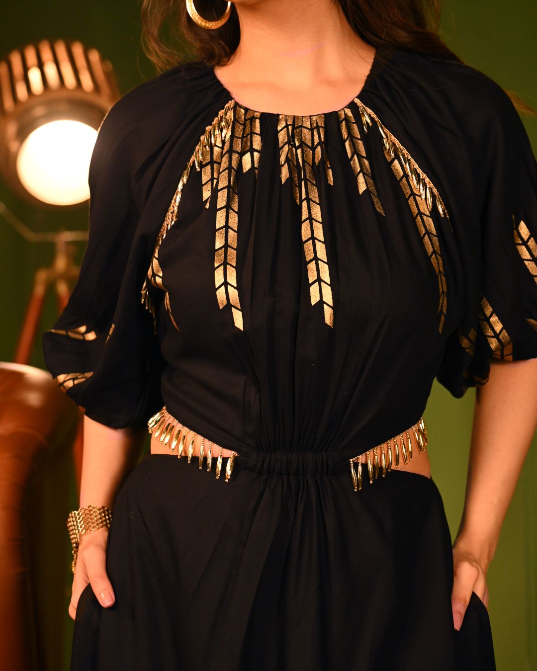 Crafted to flatter, the midi-length silhouette flows beautifully with every step, while the both-side flared cutouts, adorned with dangling lace, accentuate your waist in the most graceful and stylish way. The broad elastic waistband ensures a snatched fit, while the gathered neckline and raglan sleeves add an effortlessly romantic touch. The rayon fabric is a masterpiece of softness and structure, flowing naturally with every movement. The foil detailing elevates its charm, making it the perfect balance of comfort and sparkle.