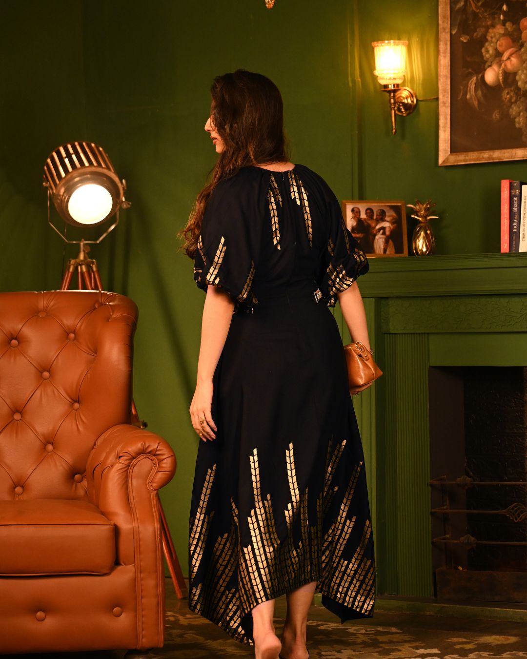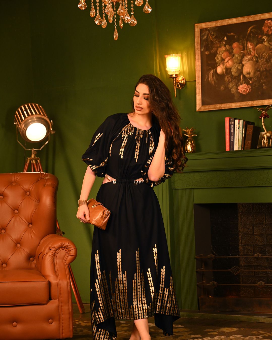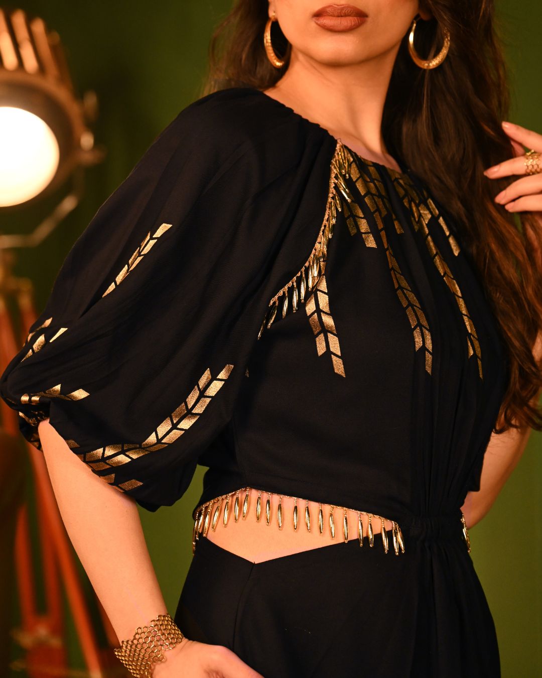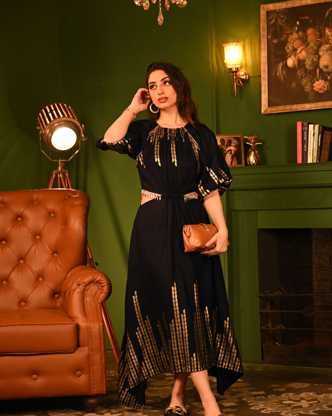 Crafted to flatter, the midi-length silhouette flows beautifully with every step, while the both-side flared cutouts, adorned with dangling lace, accentuate your waist in the most graceful and stylish way. The broad elastic waistband ensures a snatched fit, while the gathered neckline and raglan sleeves add an effortlessly romantic touch. The rayon fabric is a masterpiece of softness and structure, flowing naturally with every movement. The foil detailing elevates its charm, making it the perfect balance of comfort and sparkle.