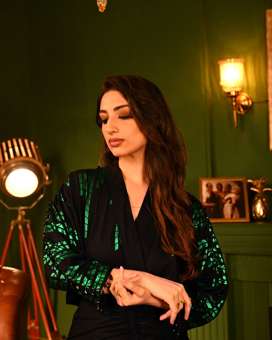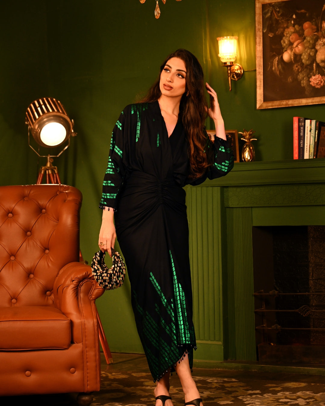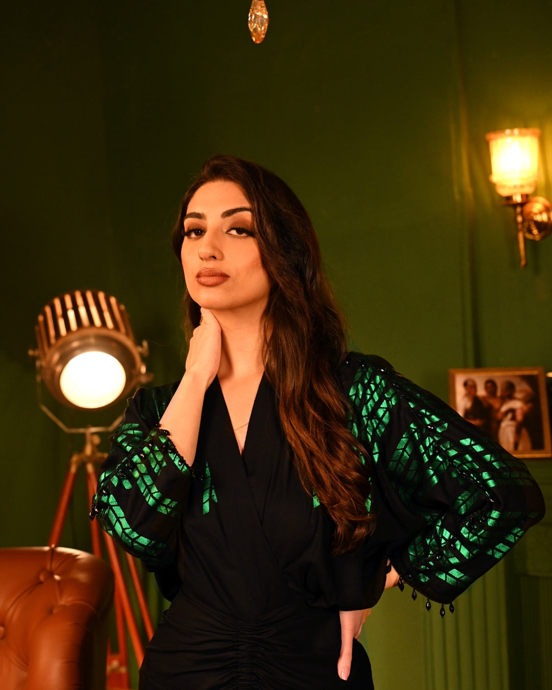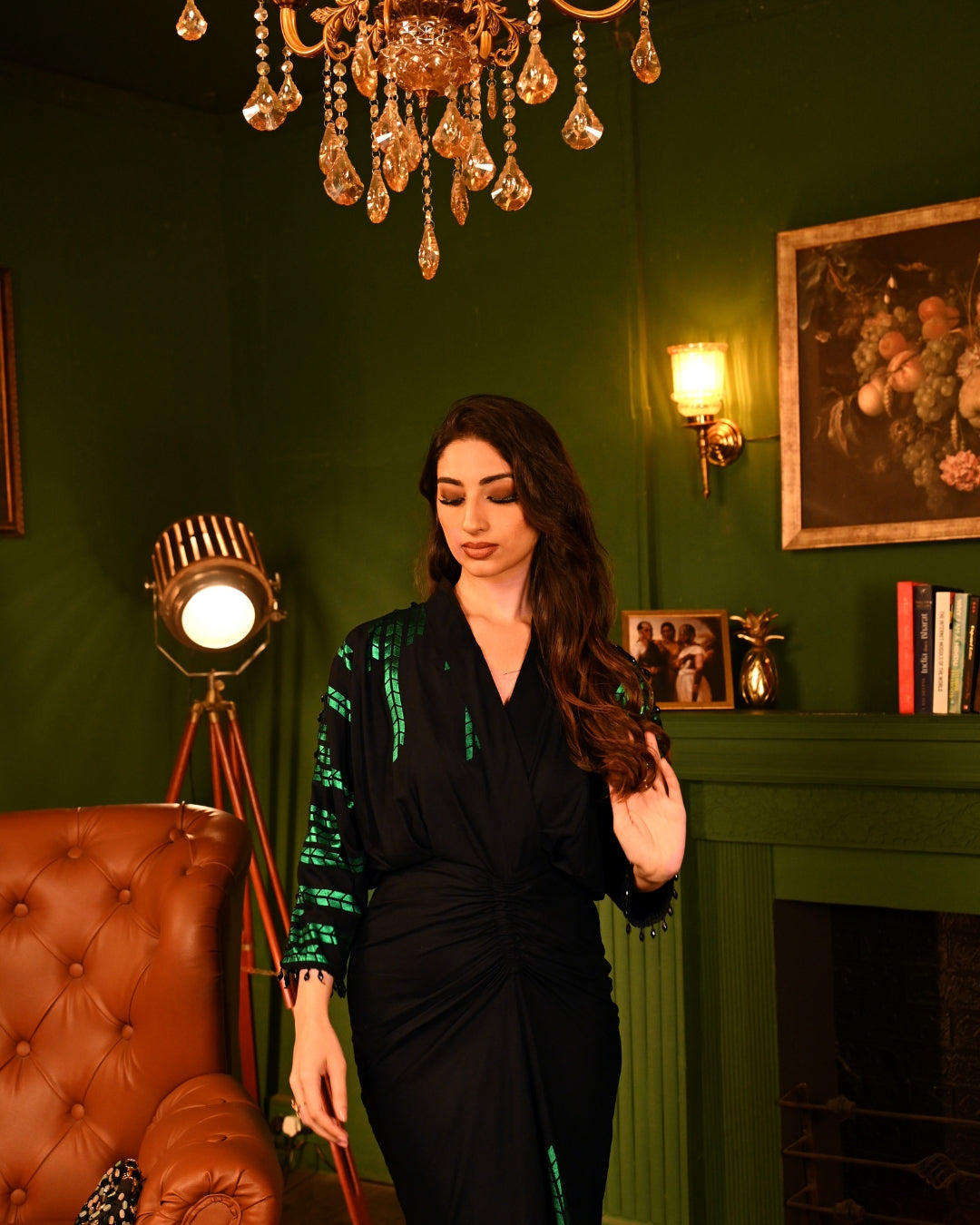 Crafted with a foil print, the Black fabric gleams under the light with green hues, ensuring you stand out in any crowd. The dangling black lace embellishments flow gracefully with your every move, adding an ethereal charm that enhances the dress’s fluid silhouette. Whether you're dancing the night away or making an elegant entrance, this dress moves with you, exuding sophistication and grace.