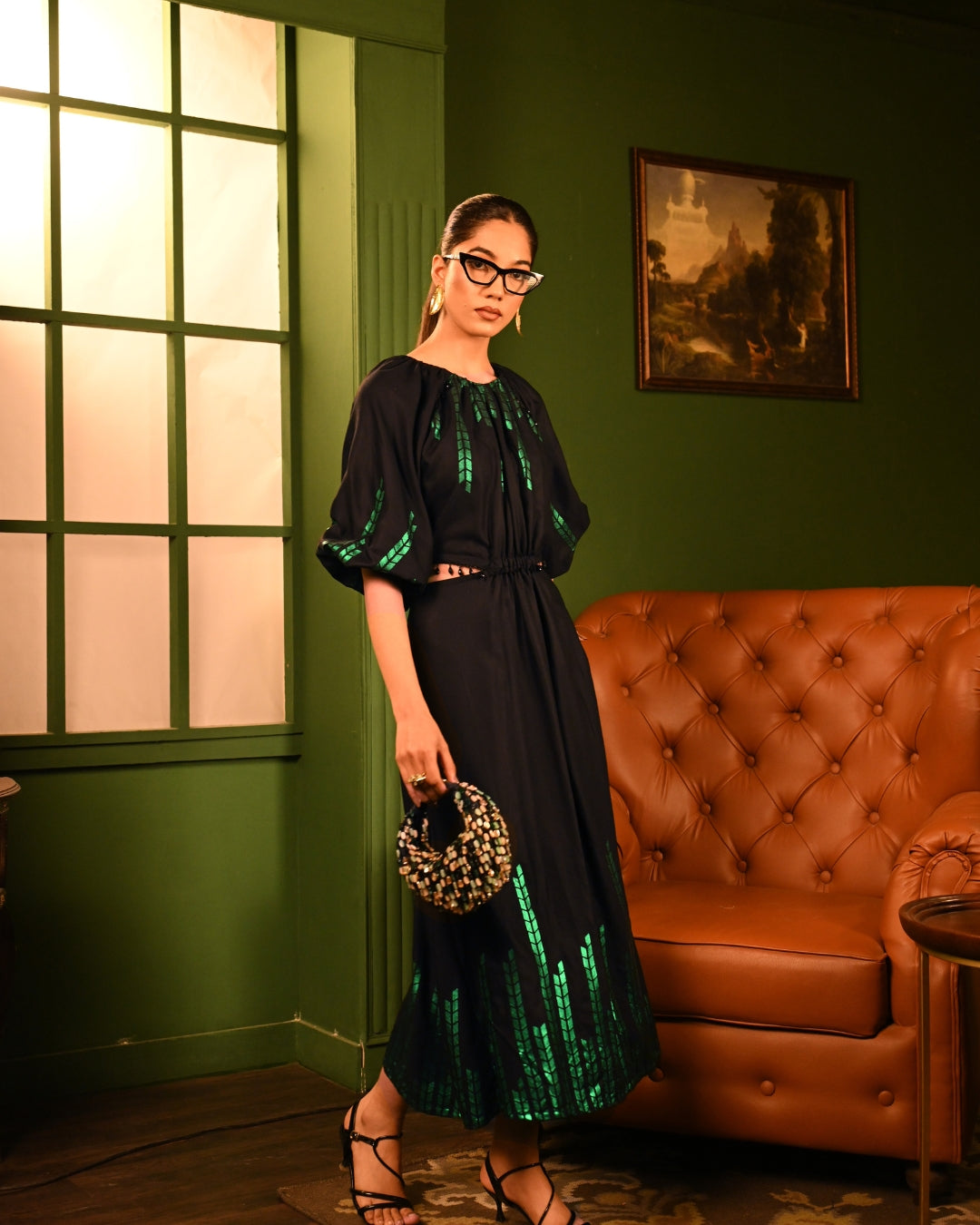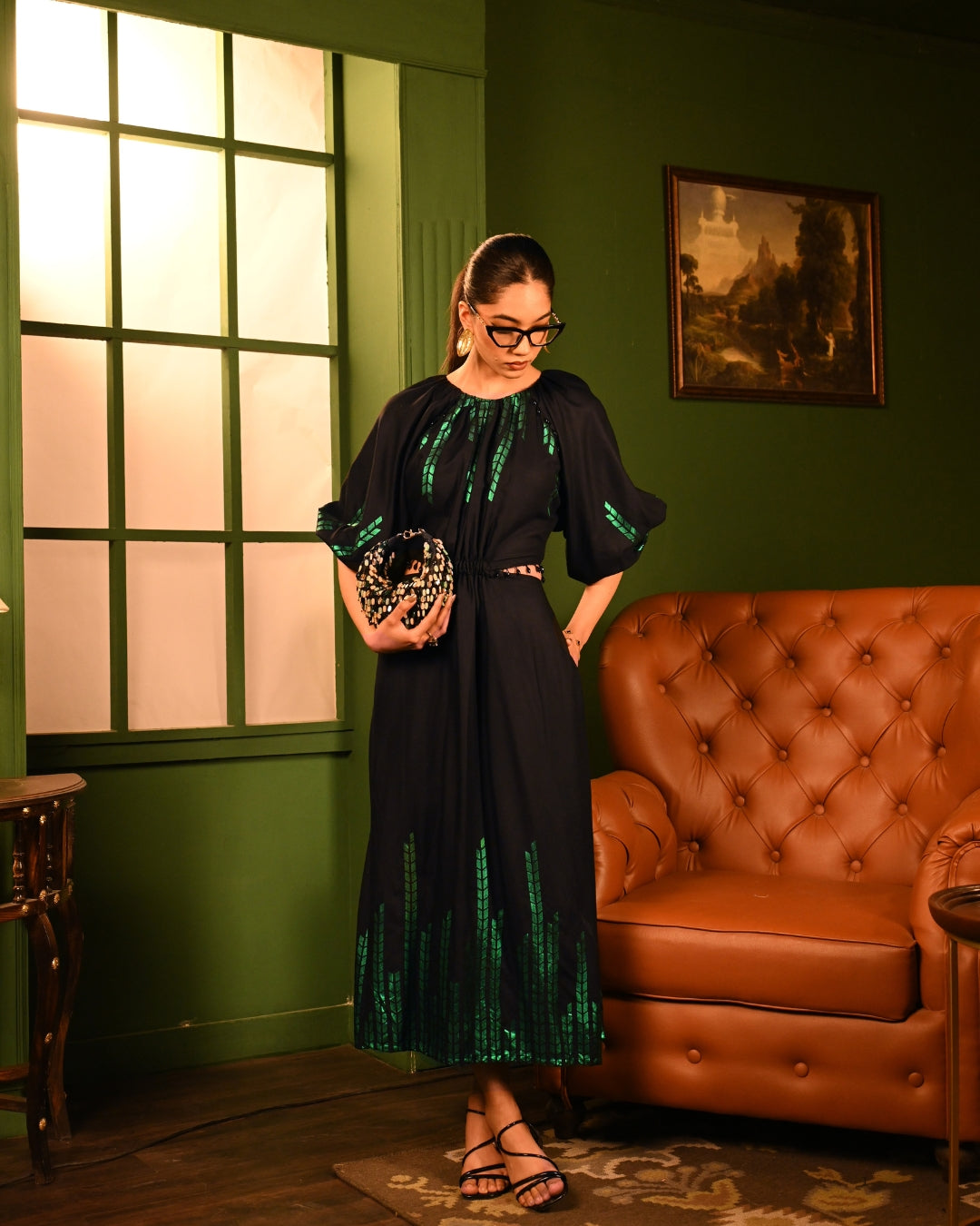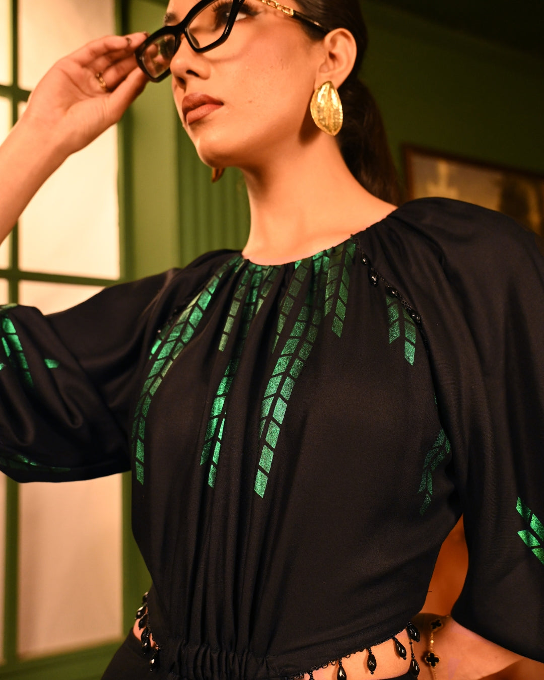 Crafted to flatter, the midi-length silhouette flows beautifully with every step, while the both-side flared cutouts, adorned with dangling lace, accentuate your waist in the most graceful and stylish way. The broad elastic waistband ensures a snatched fit, while the gathered neckline and raglan sleeves add an effortlessly romantic touch. The rayon fabric is a masterpiece of softness and structure, flowing naturally with every movement. The Green foil detailing elevates its charm, making it the perfect balance of comfort and sparkle.