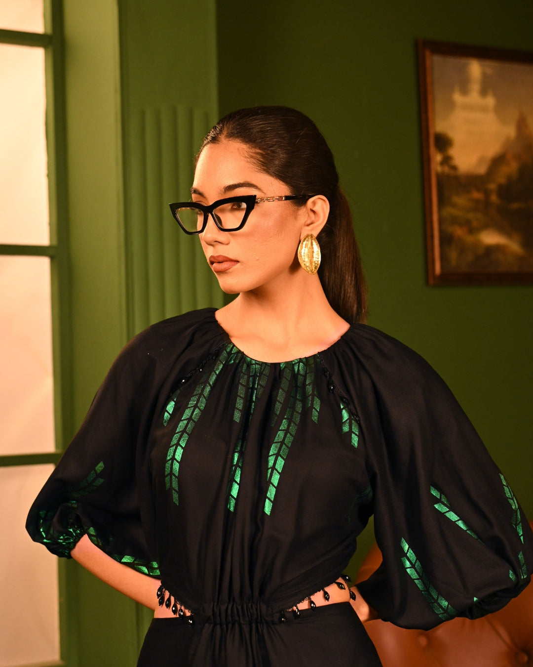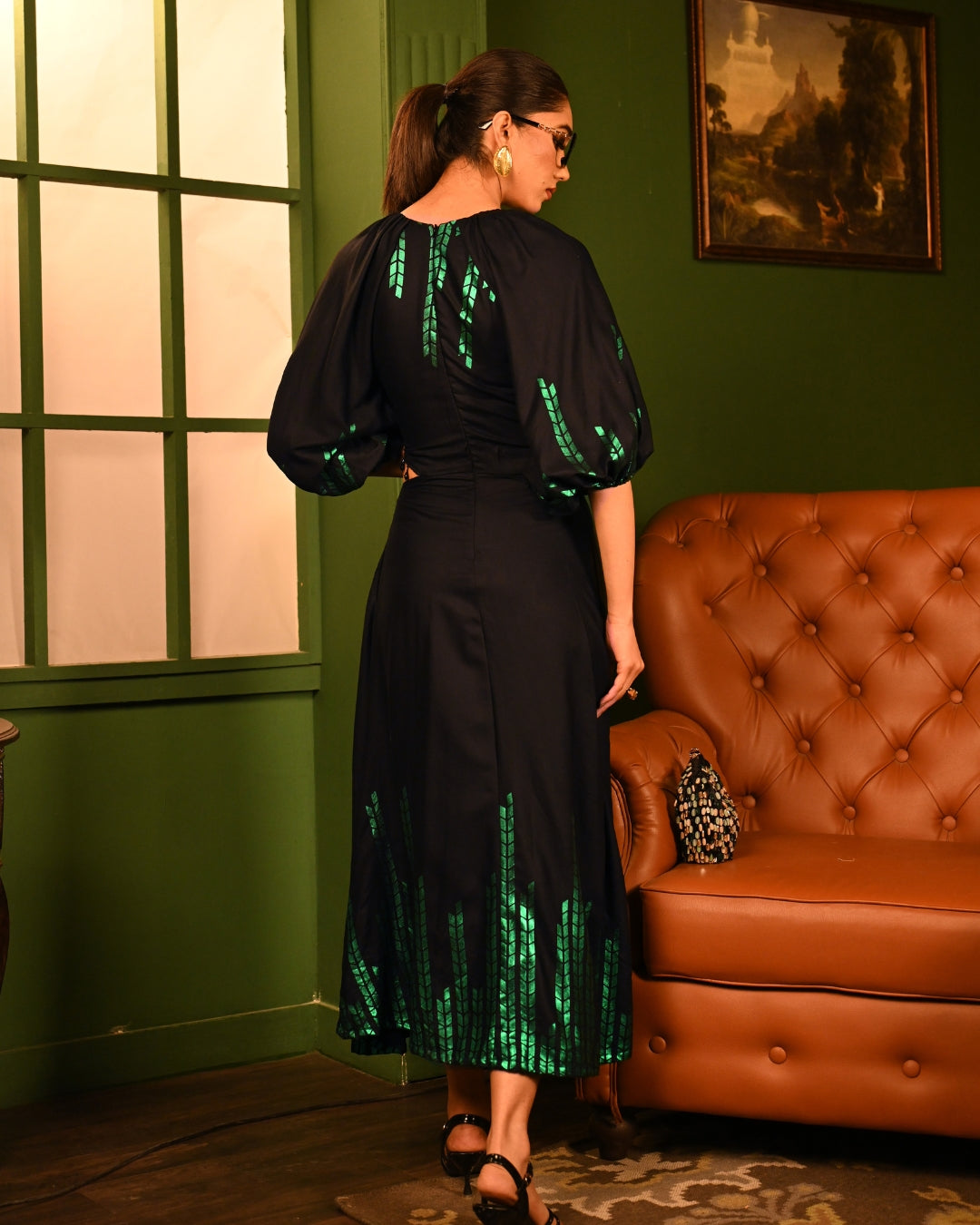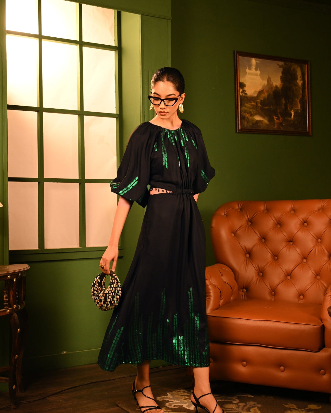 Crafted to flatter, the midi-length silhouette flows beautifully with every step, while the both-side flared cutouts, adorned with dangling lace, accentuate your waist in the most graceful and stylish way. The broad elastic waistband ensures a snatched fit, while the gathered neckline and raglan sleeves add an effortlessly romantic touch. The rayon fabric is a masterpiece of softness and structure, flowing naturally with every movement. The Green foil detailing elevates its charm, making it the perfect balance of comfort and sparkle.