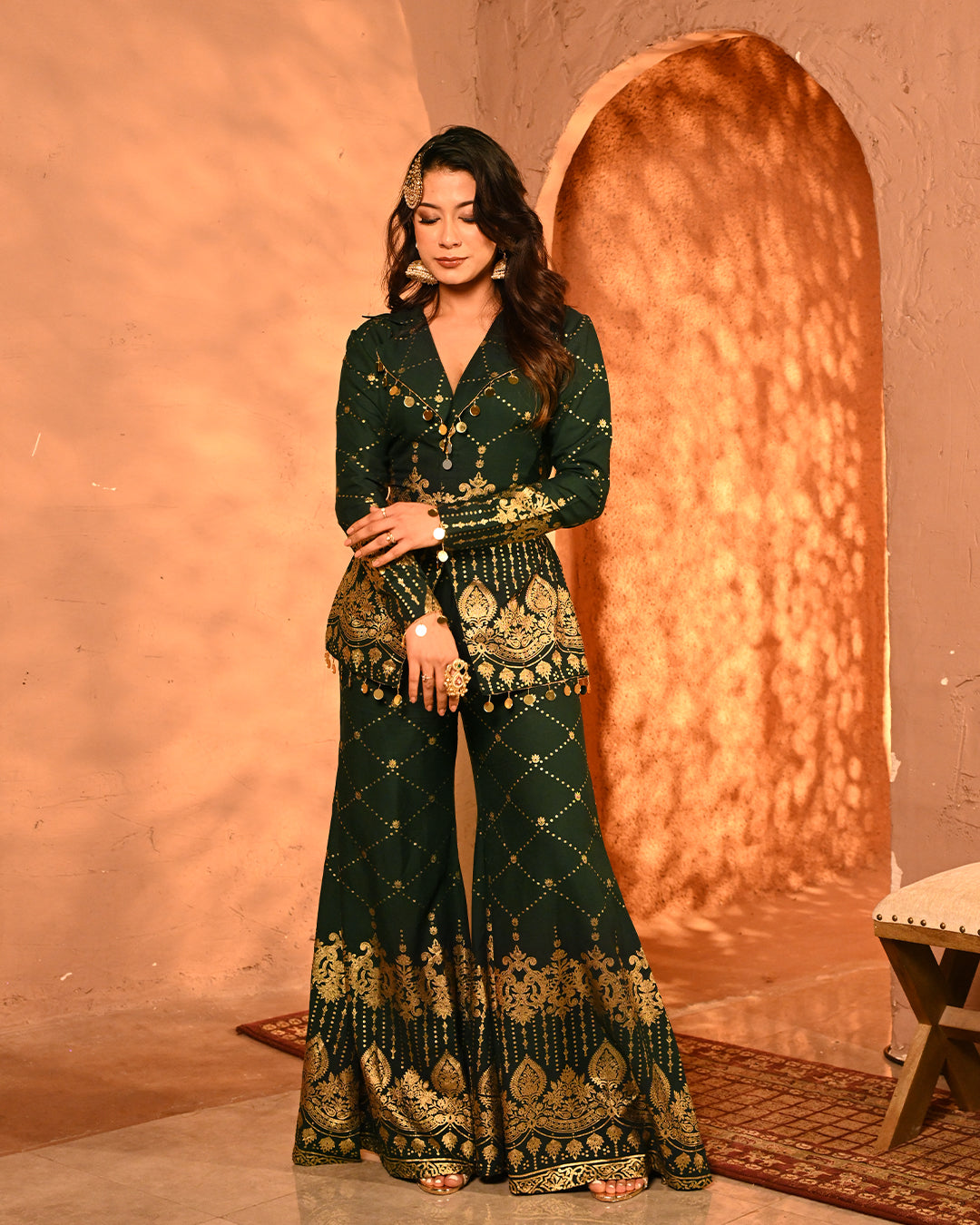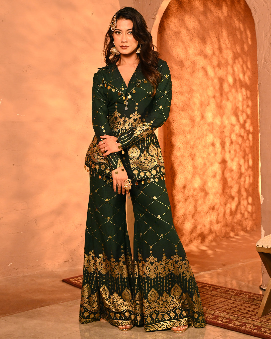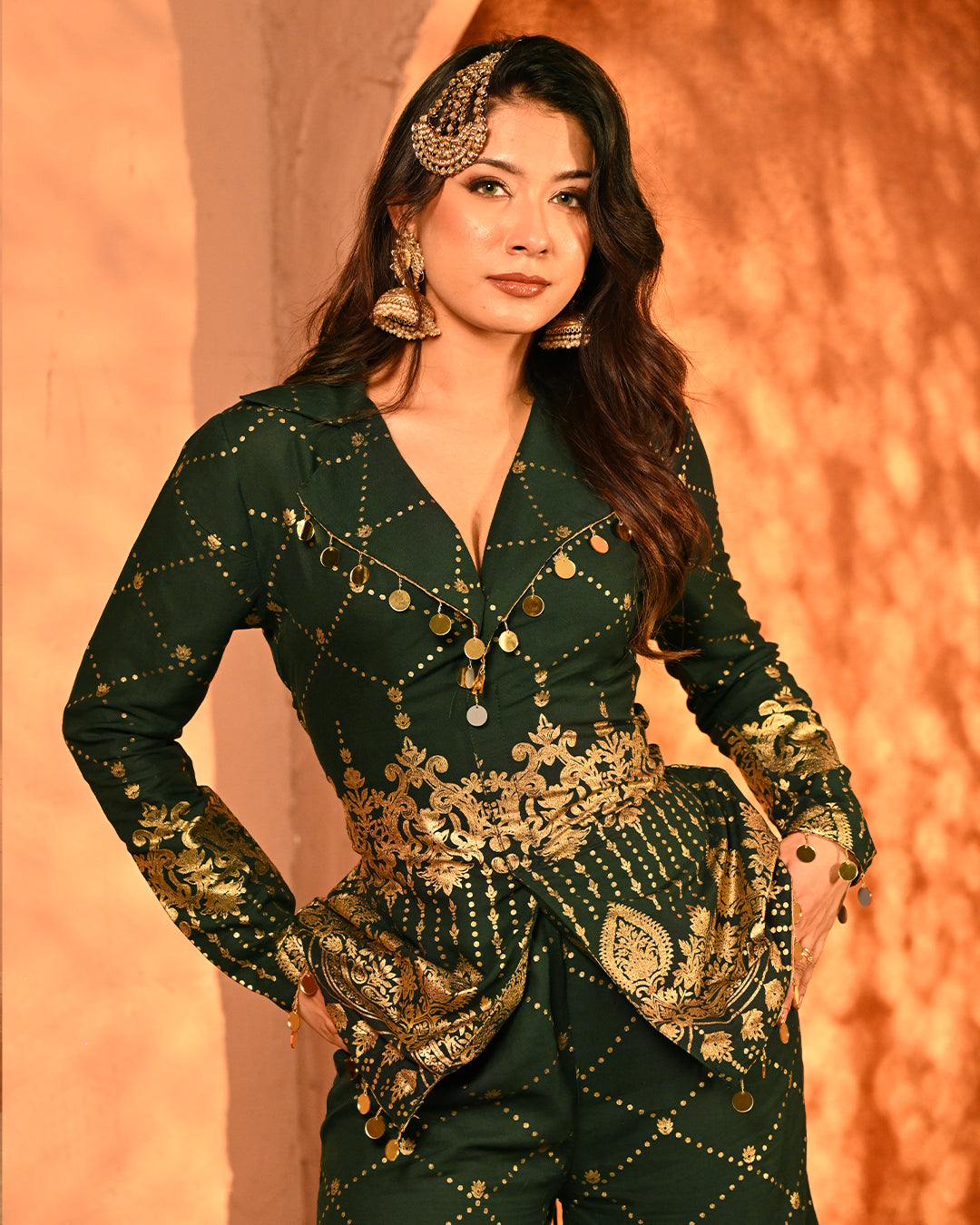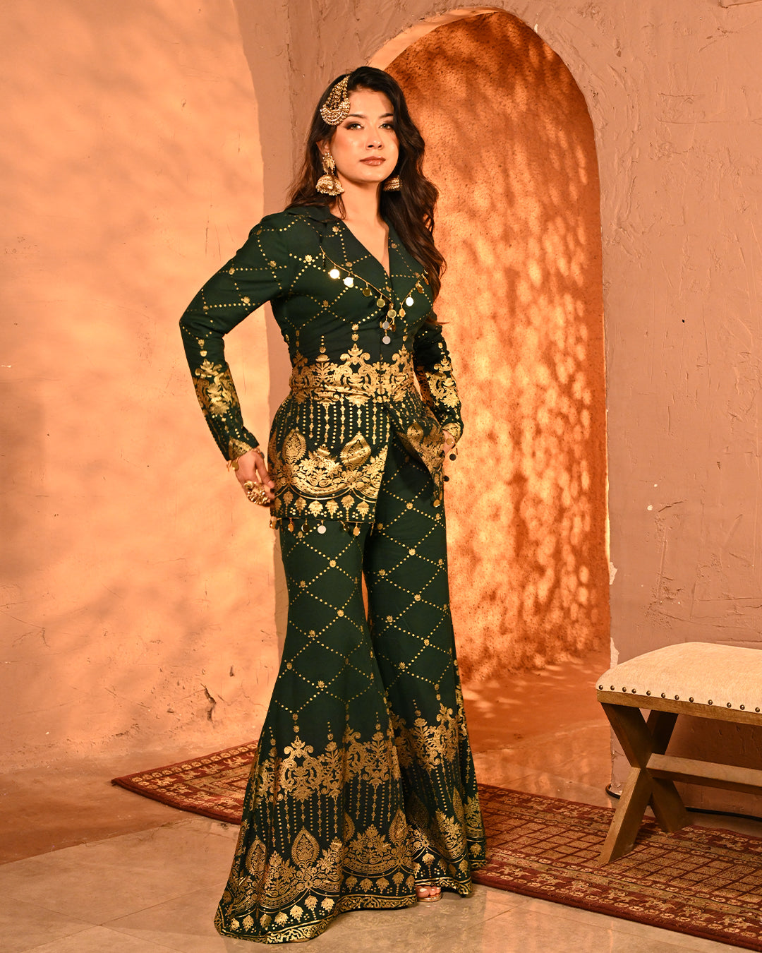 This blazer and pant co-ord is a striking fusion of festive grandeur and contemporary tailoring, designed to make an effortless statement. Crafted on a lightweight rayon base, the ensemble carries the signature foil detailing that defines the collection, creating a gleaming surface that reflects light with every move and enhances its luxurious character.The blazer is designed with a classic notch lapel collar, elevated with intricate mirror tassel lace that adds both shimmer and artisanal charm. The back-side dori detailing along the seams not only lends adjustability for a customized fit but also introduces a layer of festive playfulness. Full-length sleeves maintain an elegant, polished silhouette, making the blazer versatile for celebratory evenings. The high-waist flared pants complement the blazer perfectly, creating a balanced yet dramatic silhouette. Tailored with an elasticated waistband for ease of wear, the pants feature practical side pockets on both sides, marrying comfort with design. The foil work across the fabric lends depth and festive richness, while the fluid drape of rayon ensures graceful movement.Together, the set is a seamless blend of intricate foiling artistry, thoughtful tailoring, and festive-ready elegance. With its lustrous finish and flowing silhouettes, this ensemble becomes a timeless addition for celebratory occasions where tradition and modern luxury meet.
