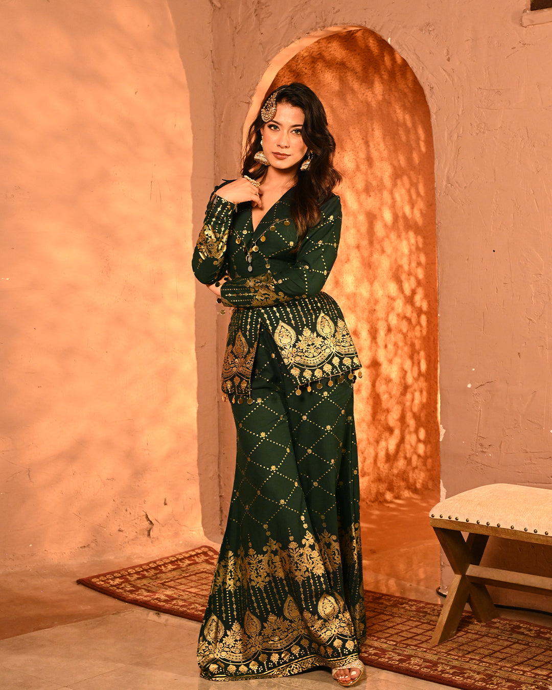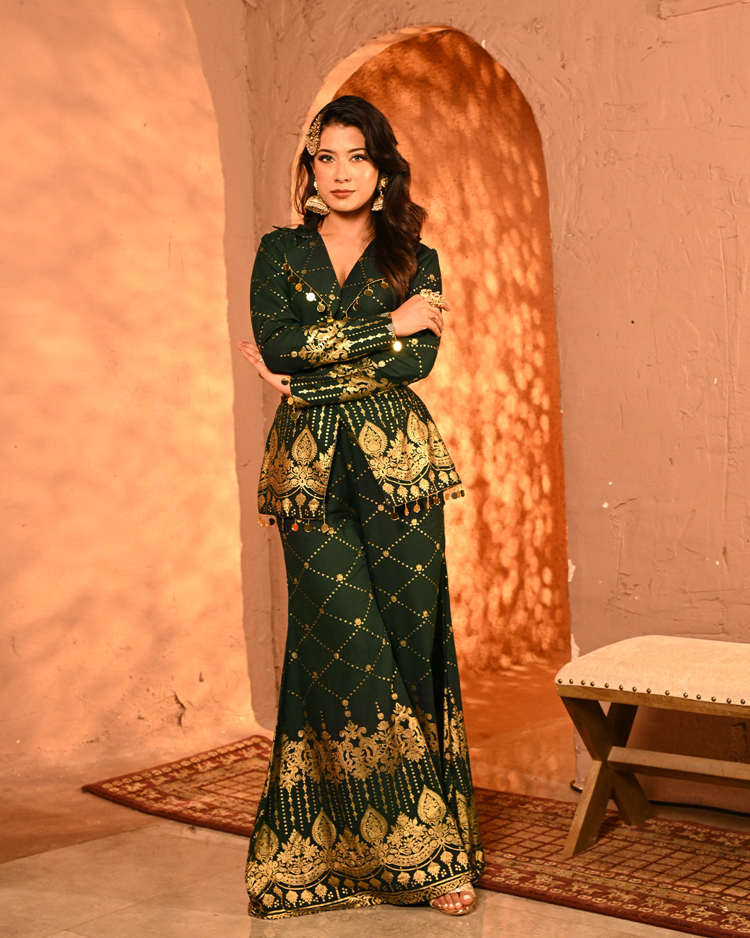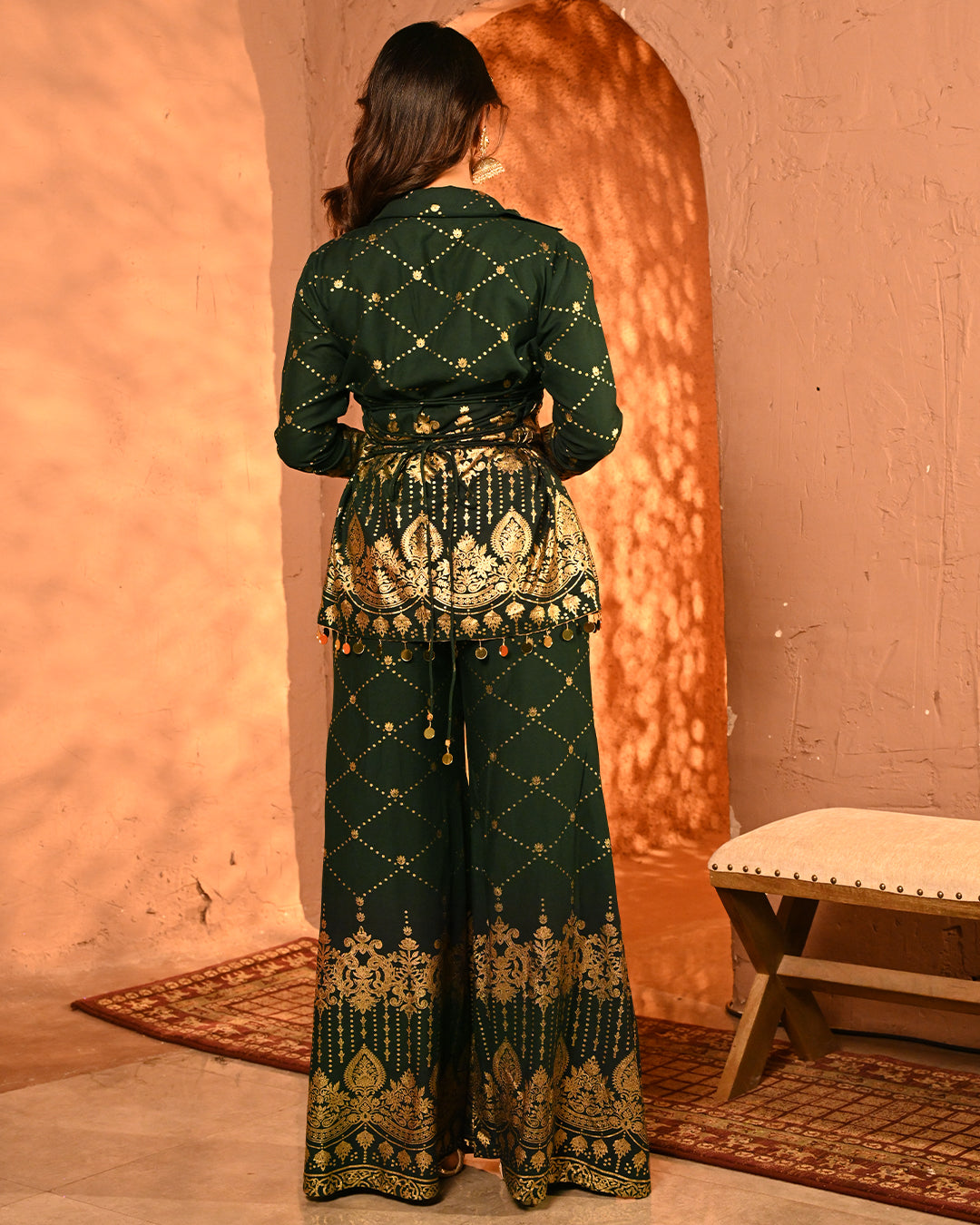 This blazer and pant co-ord is a striking fusion of festive grandeur and contemporary tailoring, designed to make an effortless statement. Crafted on a lightweight rayon base, the ensemble carries the signature foil detailing that defines the collection, creating a gleaming surface that reflects light with every move and enhances its luxurious character.The blazer is designed with a classic notch lapel collar, elevated with intricate mirror tassel lace that adds both shimmer and artisanal charm. The back-side dori detailing along the seams not only lends adjustability for a customized fit but also introduces a layer of festive playfulness. Full-length sleeves maintain an elegant, polished silhouette, making the blazer versatile for celebratory evenings. The high-waist flared pants complement the blazer perfectly, creating a balanced yet dramatic silhouette. Tailored with an elasticated waistband for ease of wear, the pants feature practical side pockets on both sides, marrying comfort with design. The foil work across the fabric lends depth and festive richness, while the fluid drape of rayon ensures graceful movement.Together, the set is a seamless blend of intricate foiling artistry, thoughtful tailoring, and festive-ready elegance. With its lustrous finish and flowing silhouettes, this ensemble becomes a timeless addition for celebratory occasions where tradition and modern luxury meet.