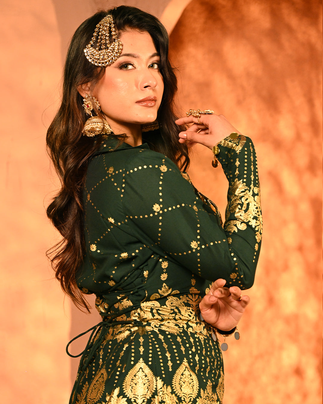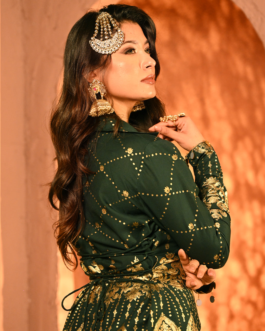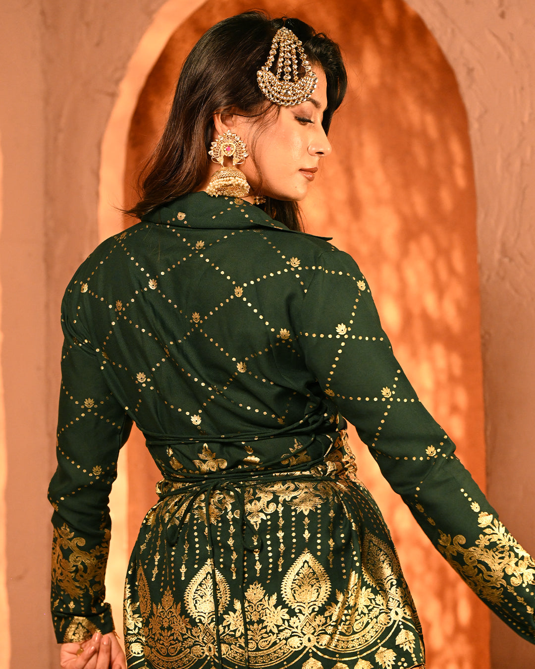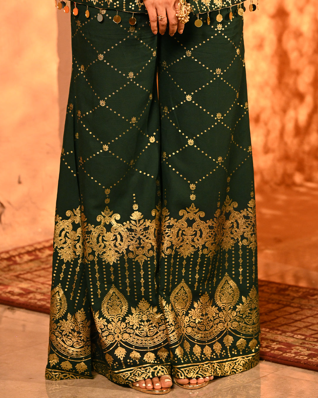 This blazer and pant co-ord is a striking fusion of festive grandeur and contemporary tailoring, designed to make an effortless statement. Crafted on a lightweight rayon base, the ensemble carries the signature foil detailing that defines the collection, creating a gleaming surface that reflects light with every move and enhances its luxurious character.The blazer is designed with a classic notch lapel collar, elevated with intricate mirror tassel lace that adds both shimmer and artisanal charm. The back-side dori detailing along the seams not only lends adjustability for a customized fit but also introduces a layer of festive playfulness. Full-length sleeves maintain an elegant, polished silhouette, making the blazer versatile for celebratory evenings. The high-waist flared pants complement the blazer perfectly, creating a balanced yet dramatic silhouette. Tailored with an elasticated waistband for ease of wear, the pants feature practical side pockets on both sides, marrying comfort with design. The foil work across the fabric lends depth and festive richness, while the fluid drape of rayon ensures graceful movement.Together, the set is a seamless blend of intricate foiling artistry, thoughtful tailoring, and festive-ready elegance. With its lustrous finish and flowing silhouettes, this ensemble becomes a timeless addition for celebratory occasions where tradition and modern luxury meet.