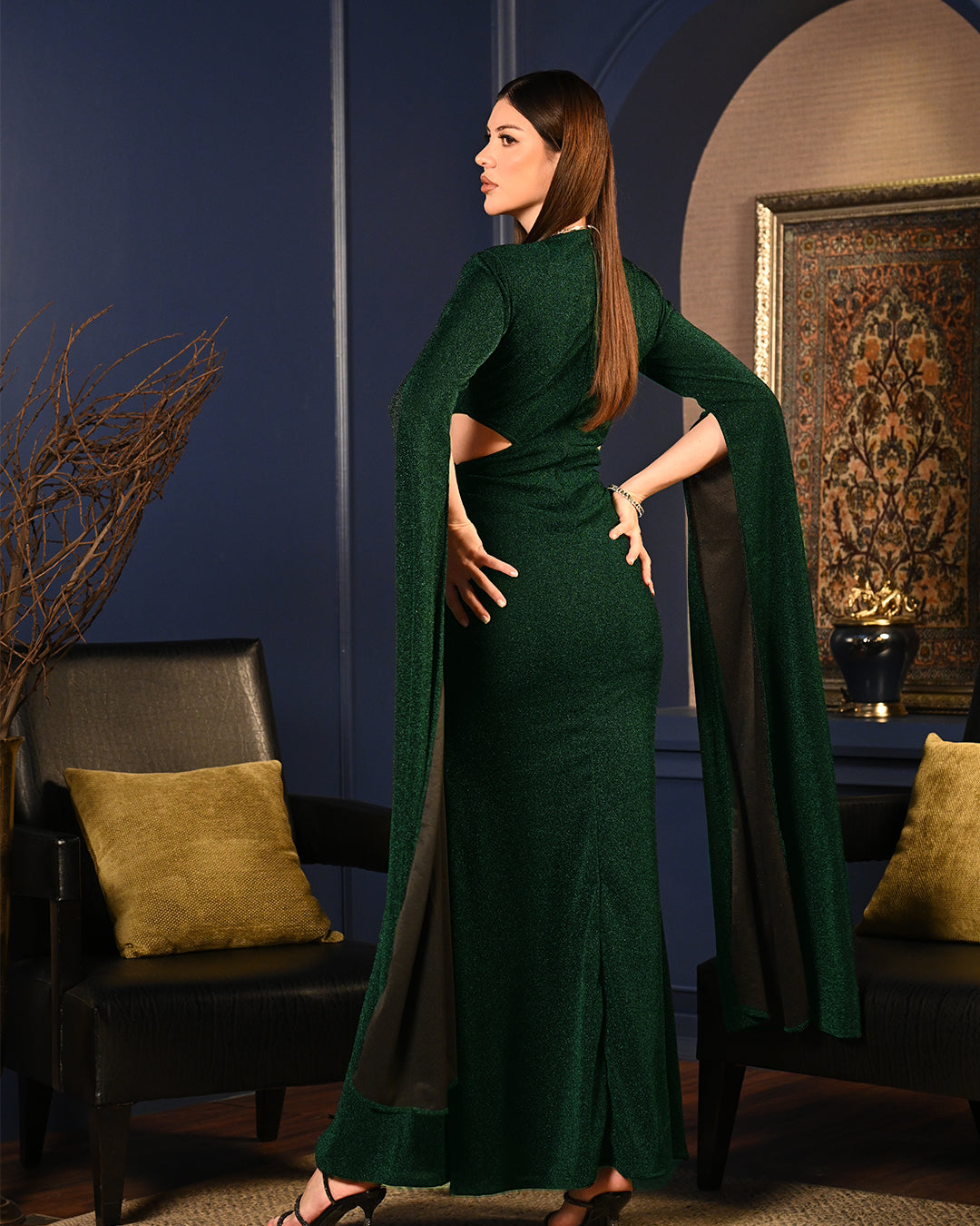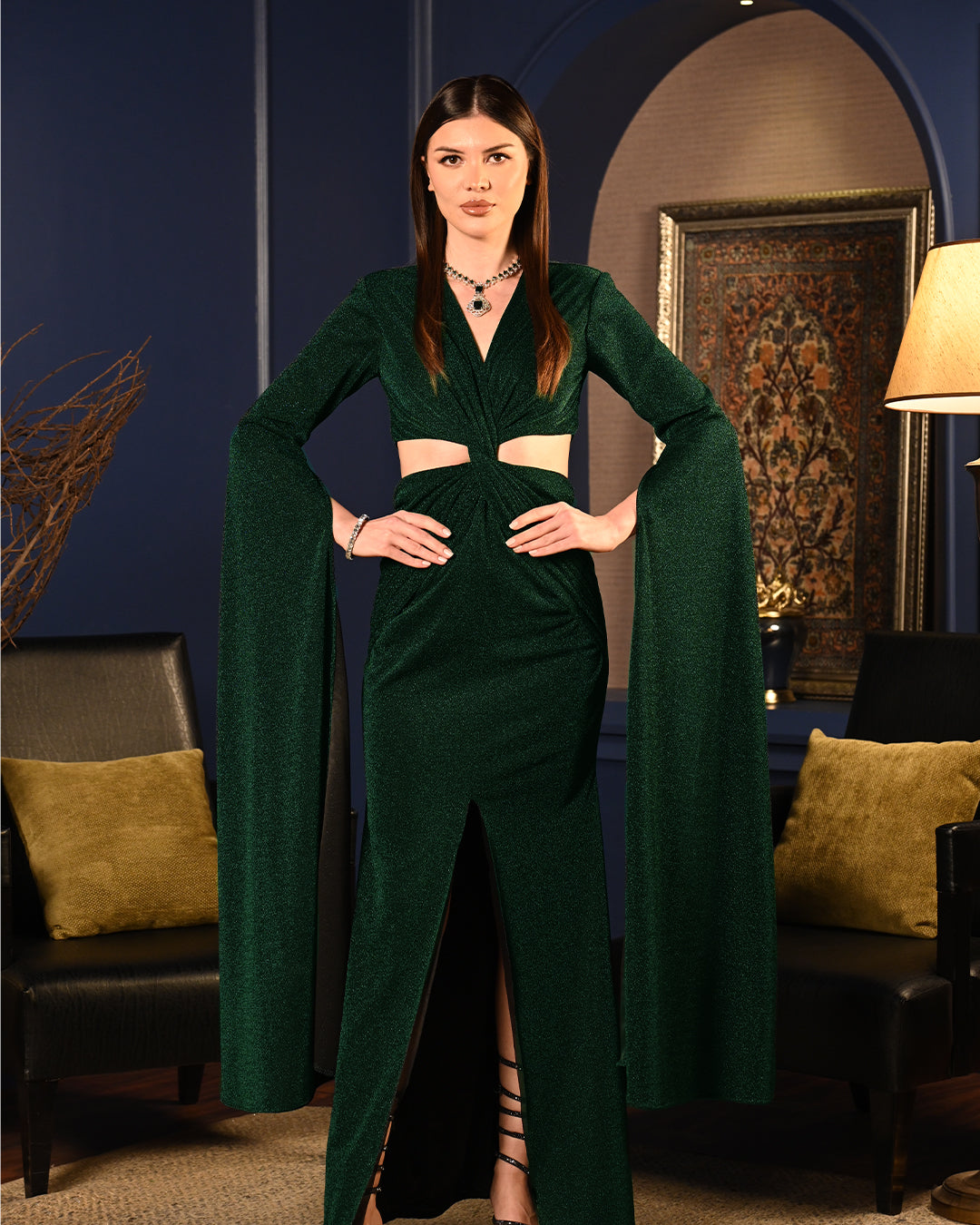 Step into the spotlight with the Green Shimmer Athena Gown, an embodiment of elegance and contemporary glamour. This dazzling gown features a flattering V-neckline adorned with knot detailing with lining on the front, creating soft gathers across the bust to provide a fuller, more captivating silhouette. Subtle side cutouts on the waist accentuate your curves, seamlessly transitioning into a fitted hip design that celebrates the feminine hourglass figure.