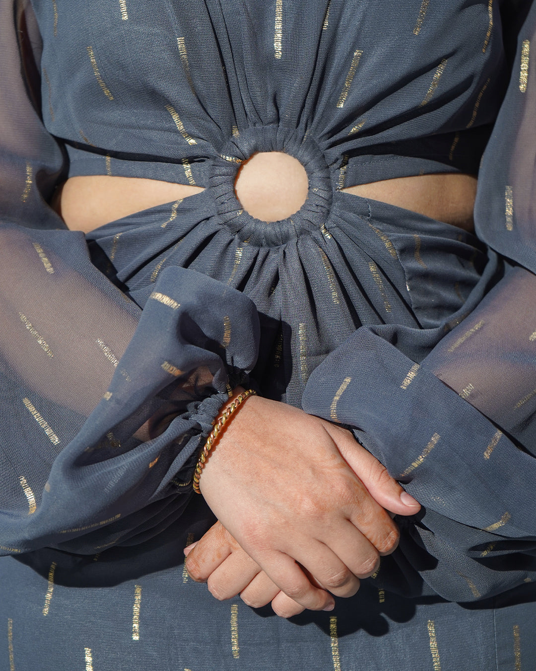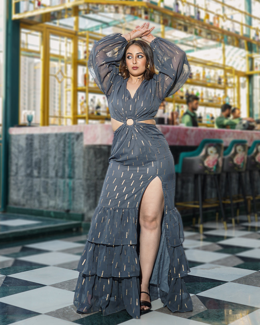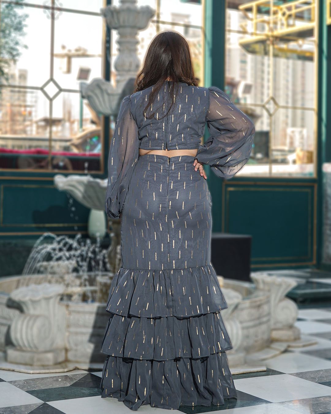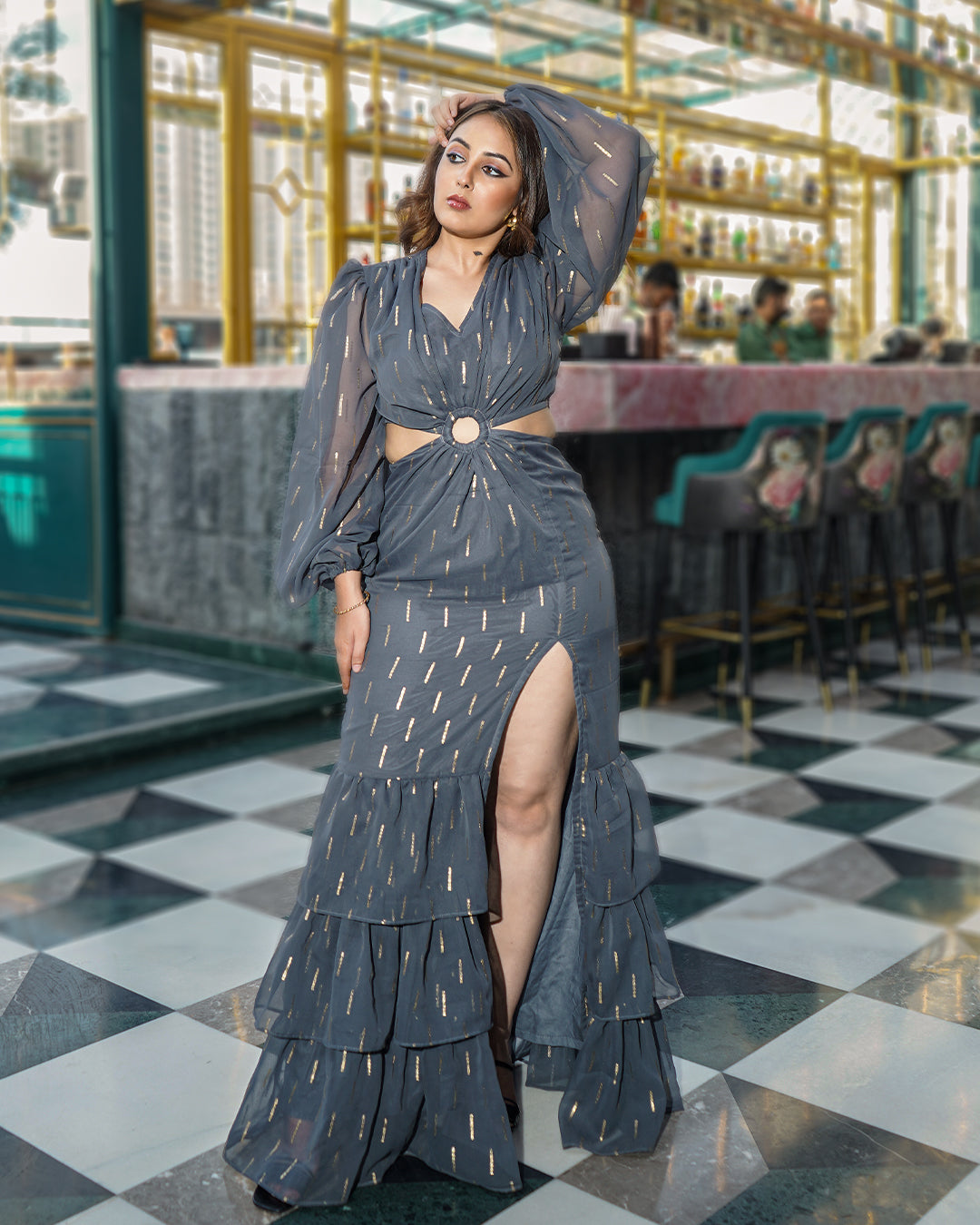 Introducing our elegant GREY INARA RESORT GOWN that is perfect for any special occasion. Embedded with exquisite attention to detail, this dress features a sleek grey bodice adorned with shimmering gold accents, creating a stunning contrast. The delicate frills add a touch of whimsy and sophistication, while the flowing silhouette ensures a flattering fit. At any event, this dress is sure to turn heads and make you feel like the belle of the ball.