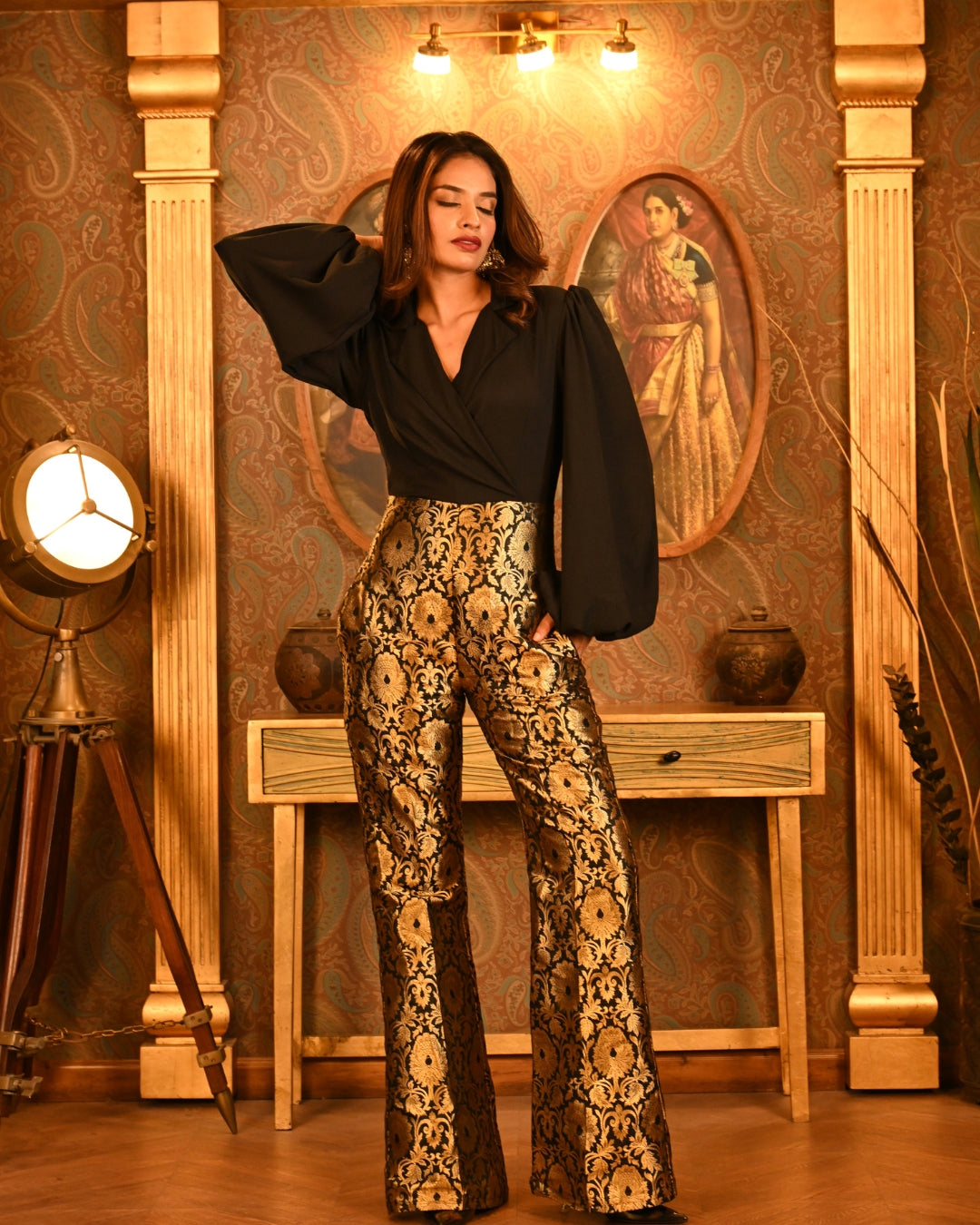 This elegant jumpsuit is a fusion of luxury and modern sophistication, crafted from rich brocade and soft moss crepe fabric. The design features a wrap-style black bodice with full bishop sleeves that add a touch of grace, paired with high-waisted gold brocade pants showcasing intricate woven patterns. Perfect for festive occasions or evening events, this jumpsuit effortlessly combines traditional charm with contemporary style.