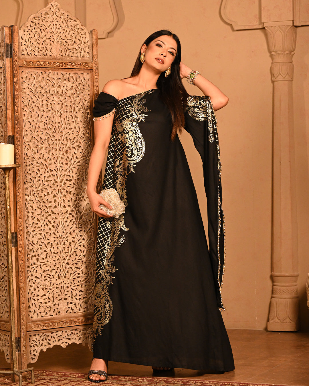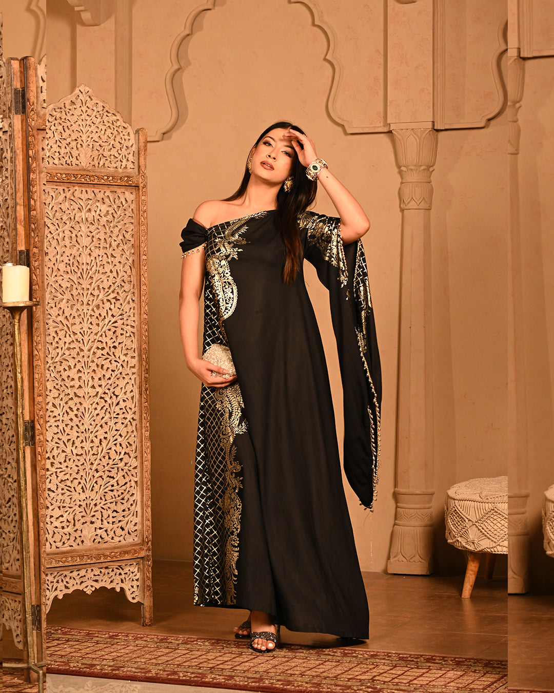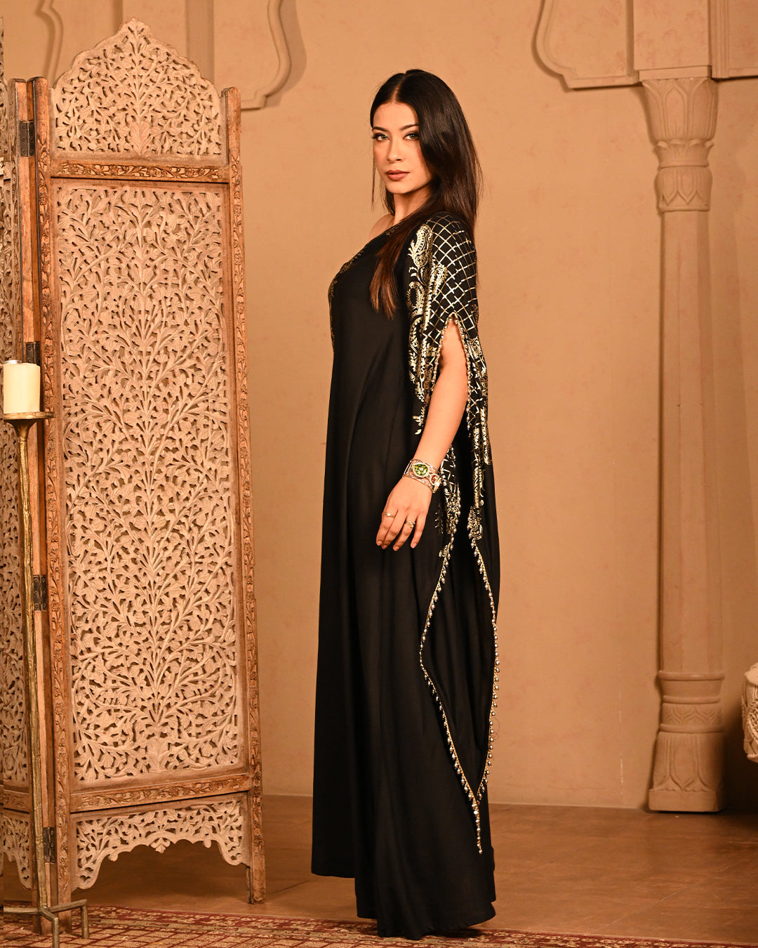 This statement kaftan is all about effortless elegance with a contemporary edge. Designed with asymmetrical sleeves — an exaggerated flowy sleeve on one side and a cap sleeve that gently overlaps the armhole on the other — it brings bold structure and fluidity together in one silhouette. The print placement is artfully unique, elevated with Sona Chandi foiling (a luxurious blend of gold and silver) that catches light beautifully. Finished with delicate latkan lace detailing, this piece is perfect for festive evenings where comfort meets striking style.