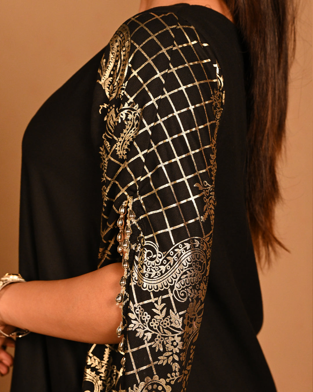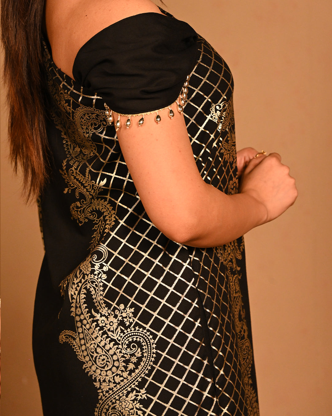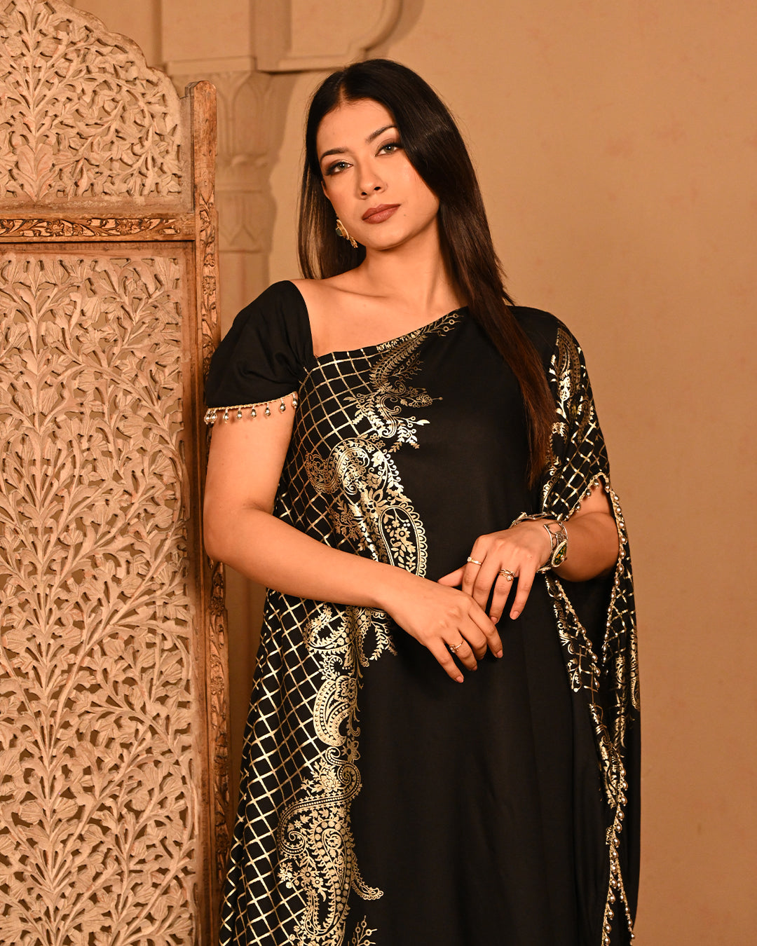 This statement kaftan is all about effortless elegance with a contemporary edge. Designed with asymmetrical sleeves — an exaggerated flowy sleeve on one side and a cap sleeve that gently overlaps the armhole on the other — it brings bold structure and fluidity together in one silhouette. The print placement is artfully unique, elevated with Sona Chandi foiling (a luxurious blend of gold and silver) that catches light beautifully. Finished with delicate latkan lace detailing, this piece is perfect for festive evenings where comfort meets striking style.