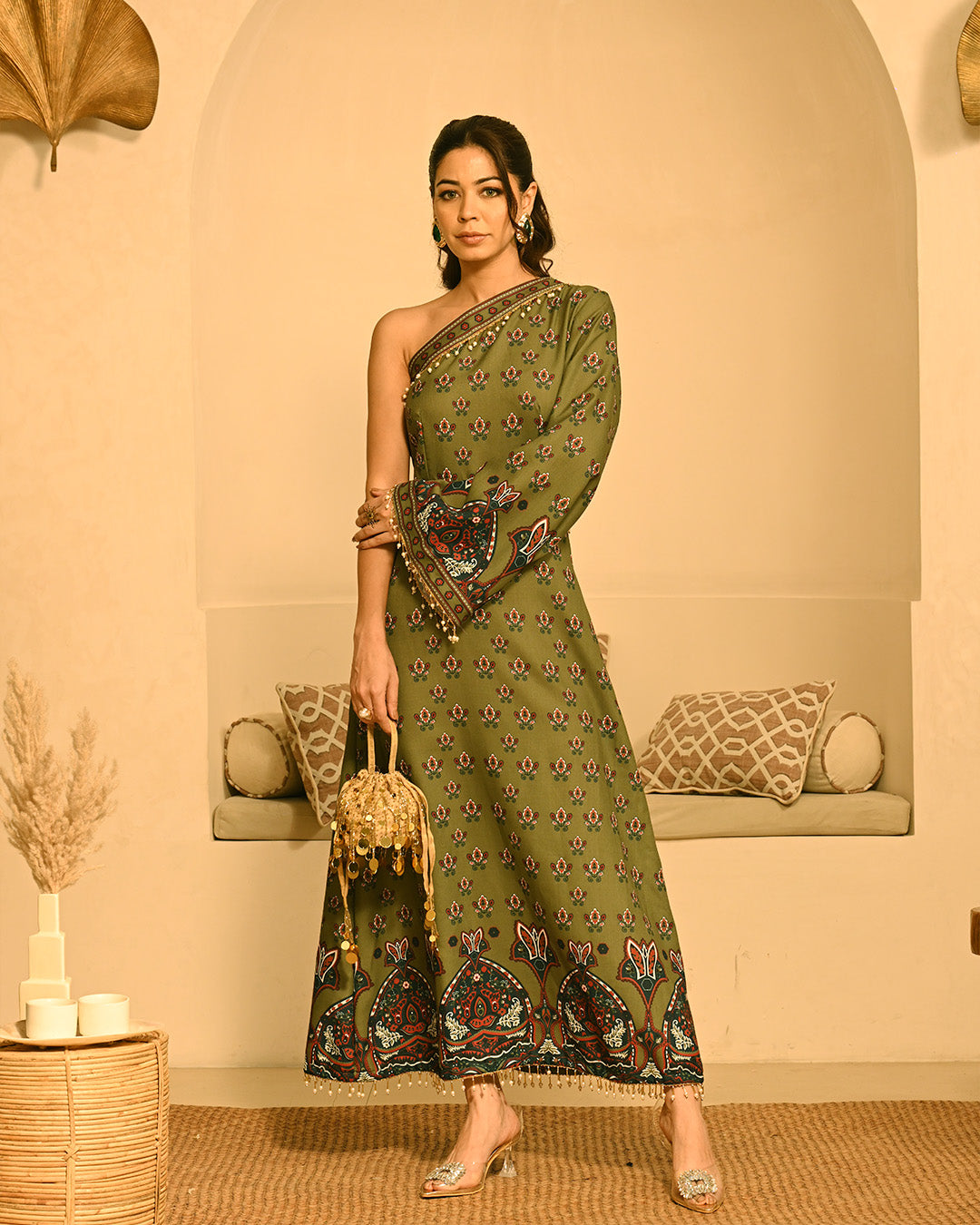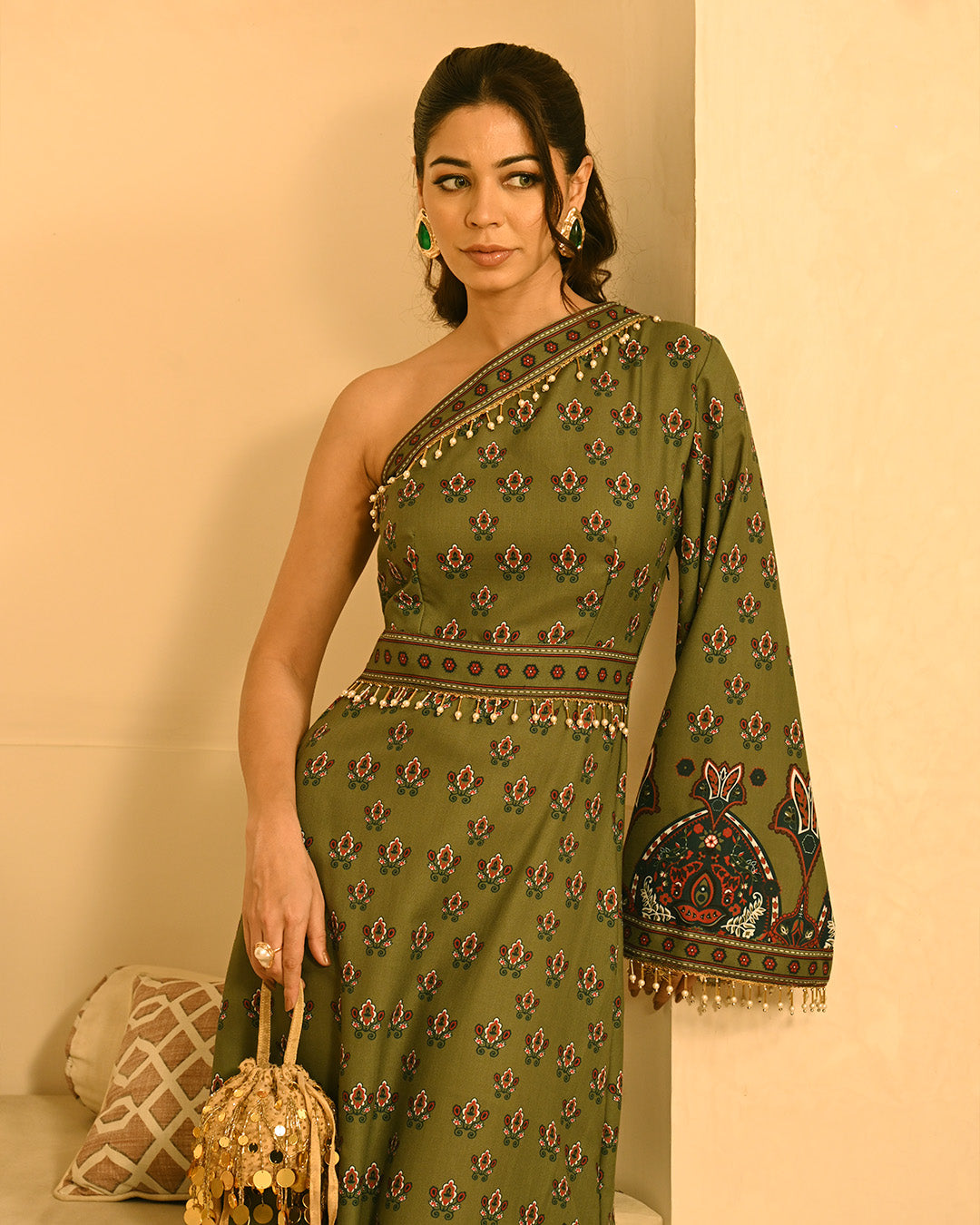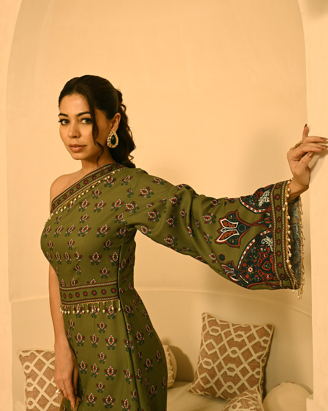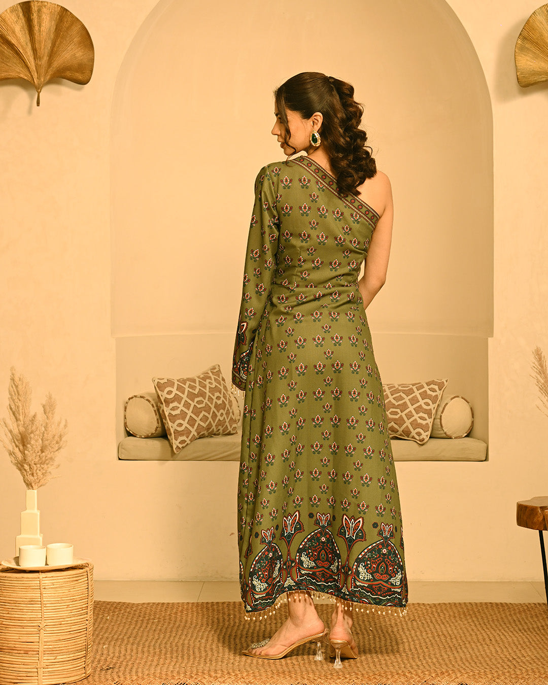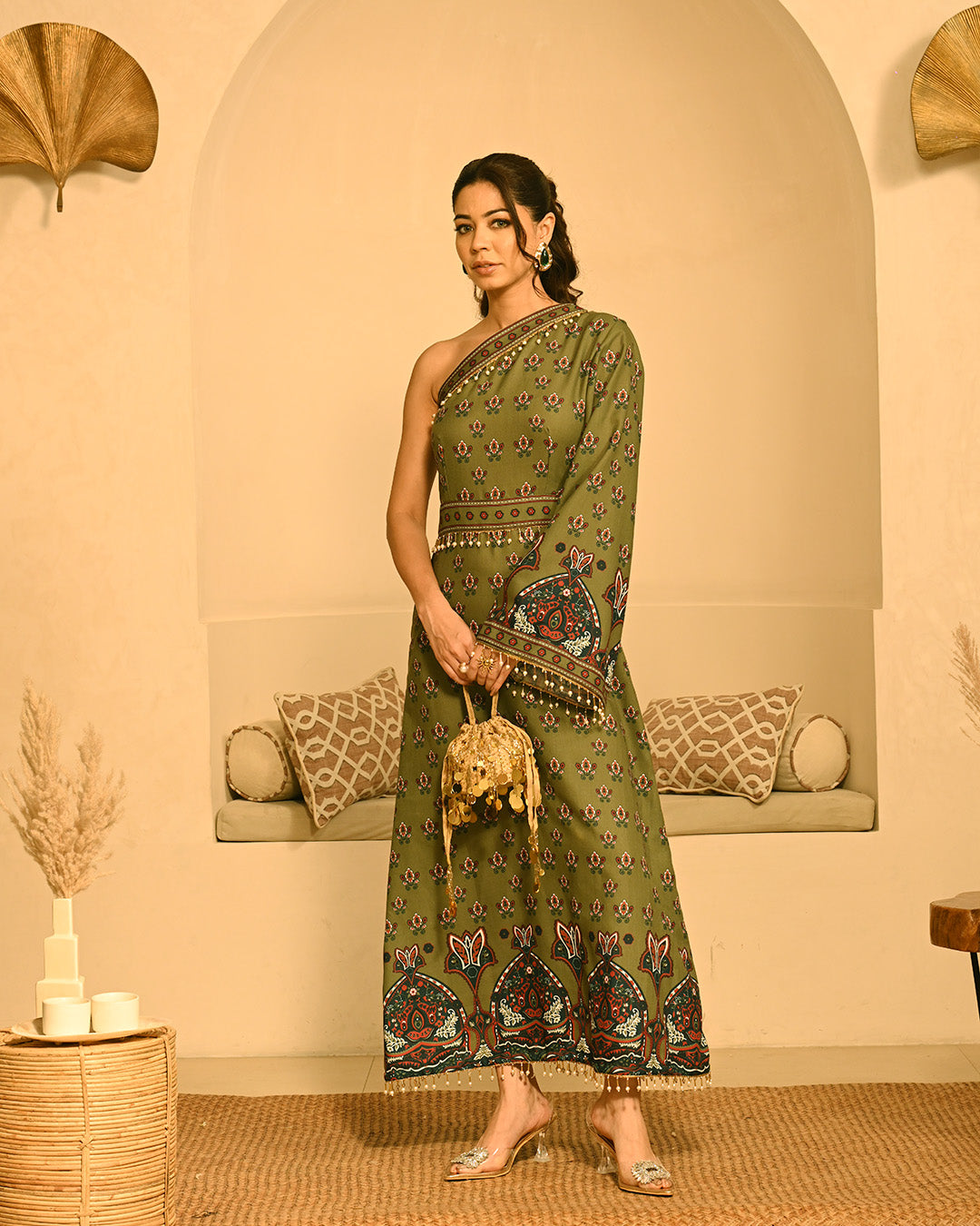 This asymmetrical cotton kaftan brings all the Moroccan magic—featuring a striking print placement along the neckline and belt to add shape and definition. The belt, sleeves ,neckline, hem all come finished with delicate pearl latkans, giving it that festive-yet-effortless vibe. Whether you’re off to a celebration or exploring historic spots, this one’s made to turn heads. The bold border print and breezy silhouette make it a statement piece without trying too hard.