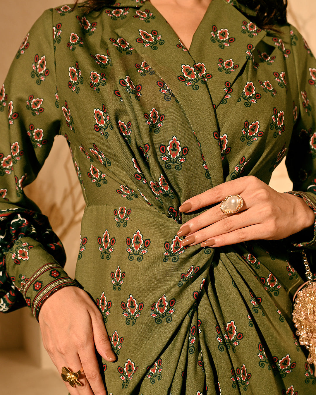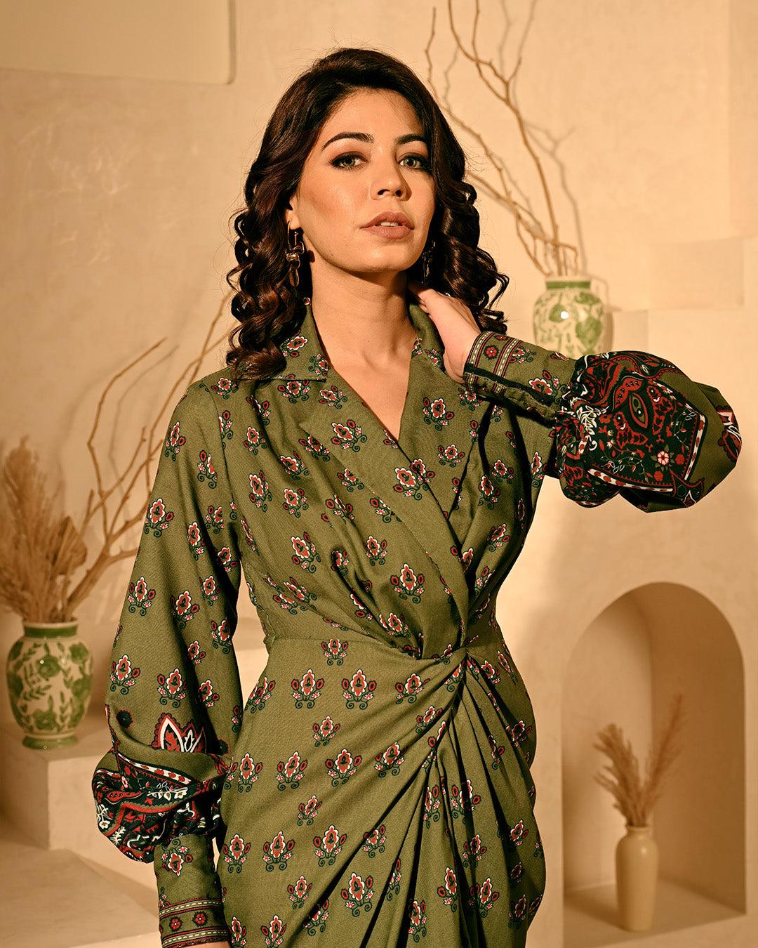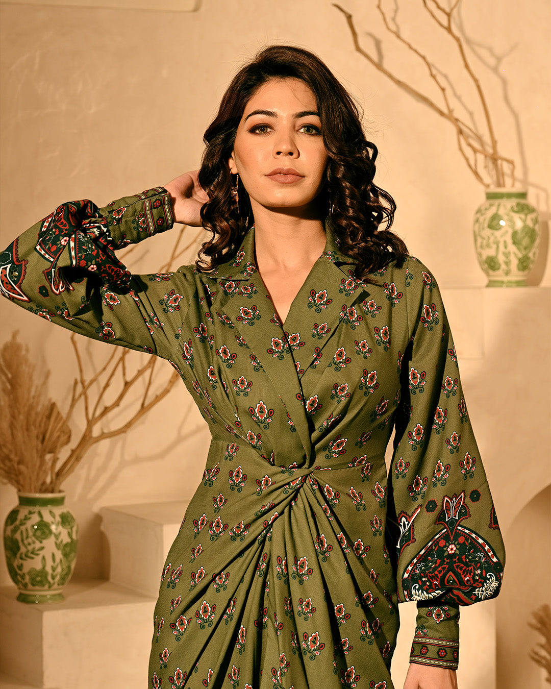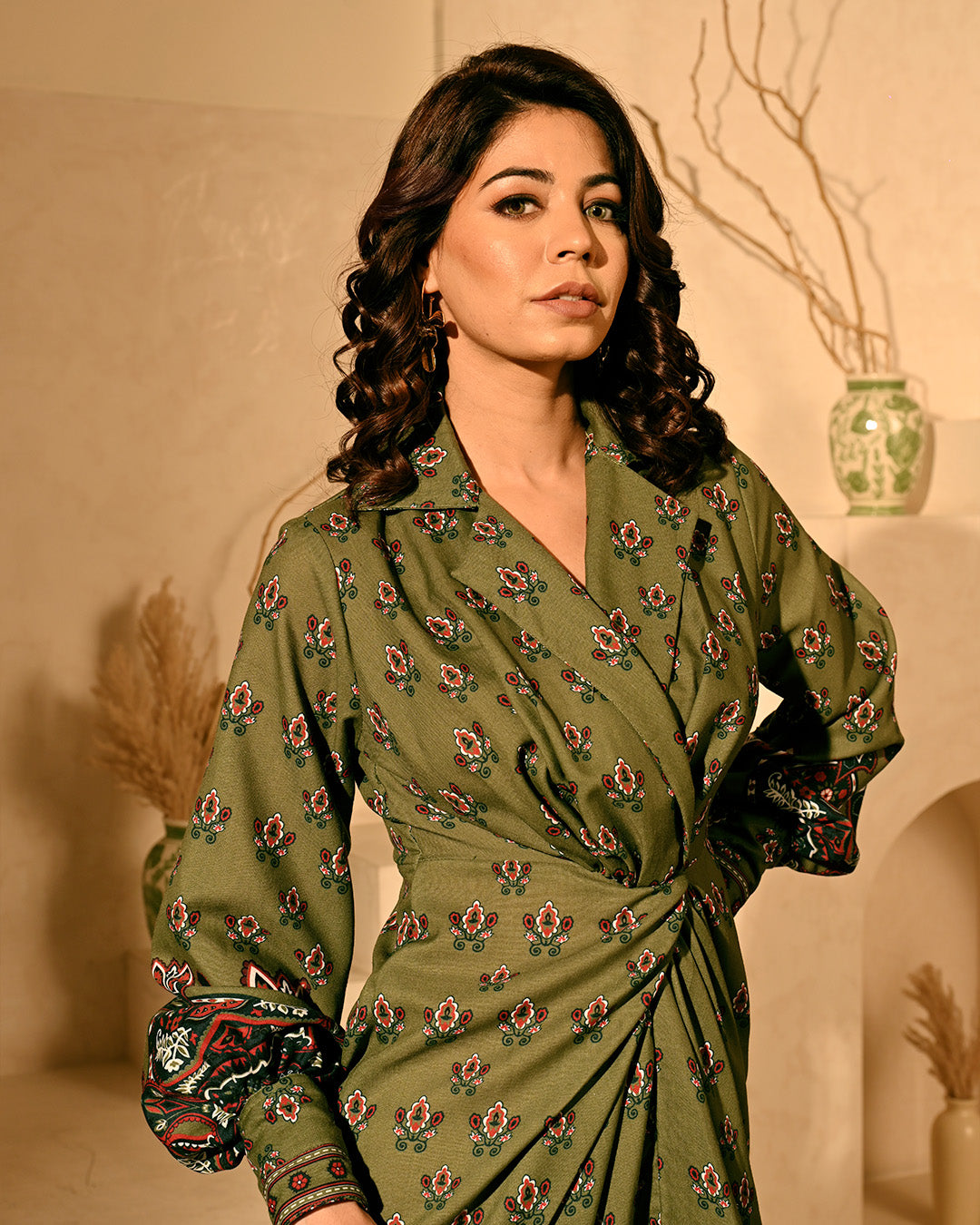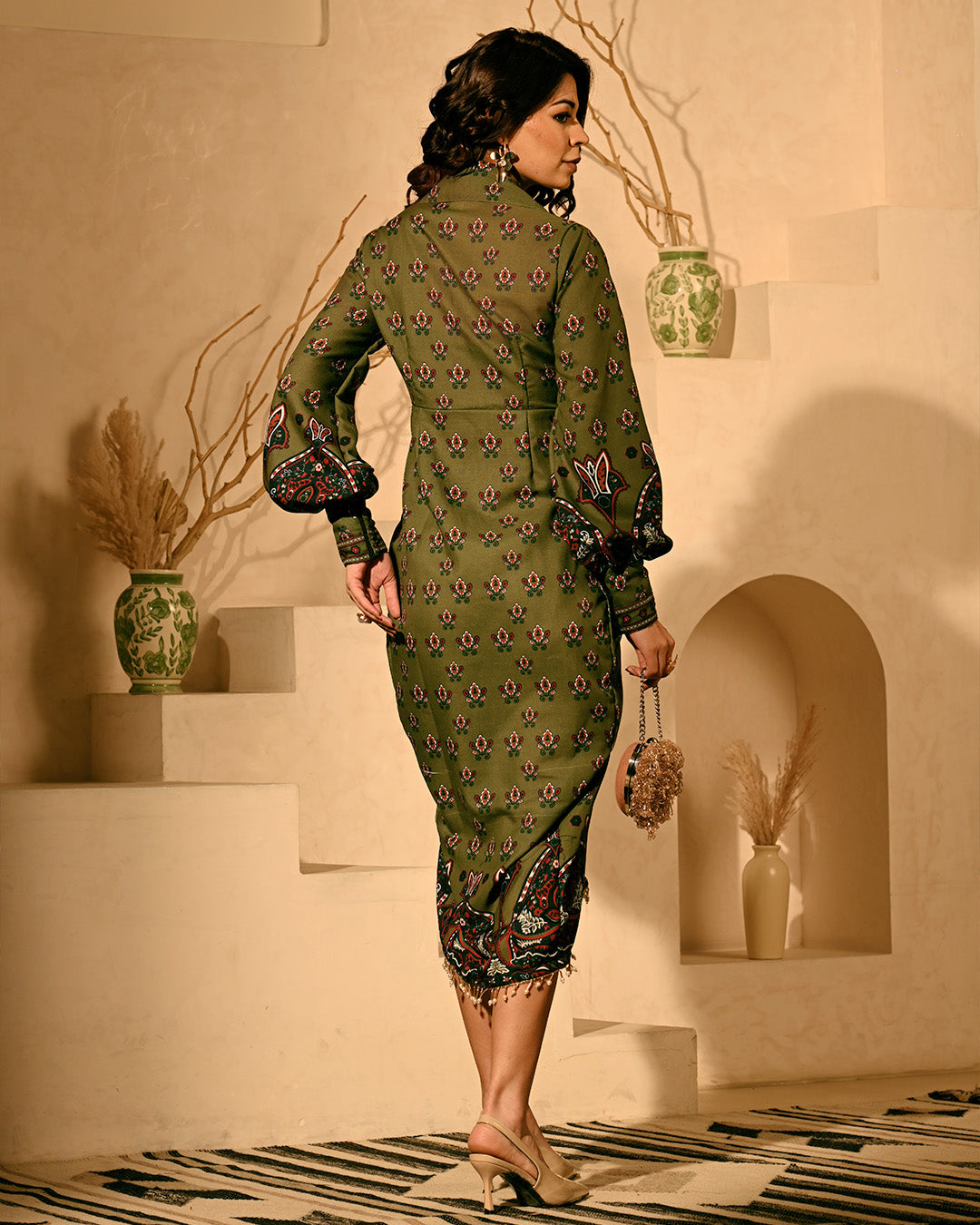 Our most-loved silhouette is back—and this time, it’s wrapped in the charm of Moroccan-inspired prints and the comfort of soft cotton.Moroccan Shirt Dress features a smart blazer-style collar that instantly elevates the look, giving it a semi-formal yet effortlessly chic vibe. The wish-off sleeves add flow and ease, and the hemline is finished with delicate pearl latkans that move with you and catch just the right amount of attention.What makes this dress truly magical is its flattering shape—it’s fitted where it should be, gently cinching the waist and flowing out to create a natural hourglass silhouette. No matter your body type, this one just works. Whether you’re heading to a festive get-together, a daytime celebration, or even an impromptu dinner, MoroccanShirt Dress is your all-occasion hero. You don’t need to overthink it—just slip it on, add your favorite footwear, and you’re out the door looking absolutely put-together.