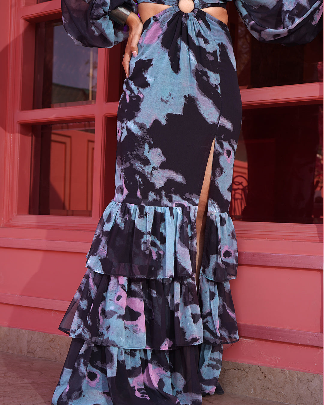 Adorned with delicate floral motifs, the georgette fabric drapes softly, creating a vision of ethereal enchantment. The waist cutout adds a modern twist, subtly accentuating your curves with understated allure, while the balloon sleeves evoke a sense of whimsical charm and movement.