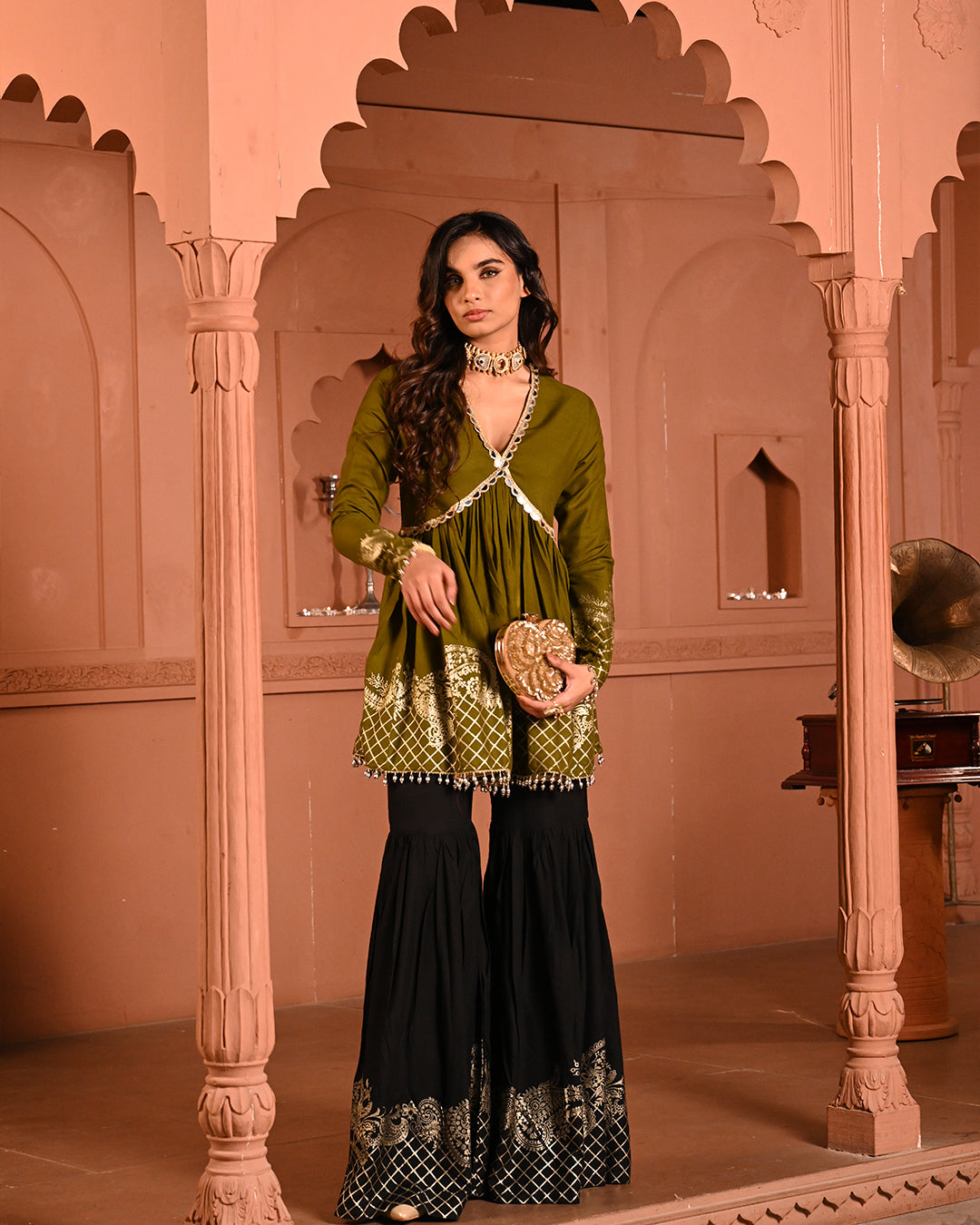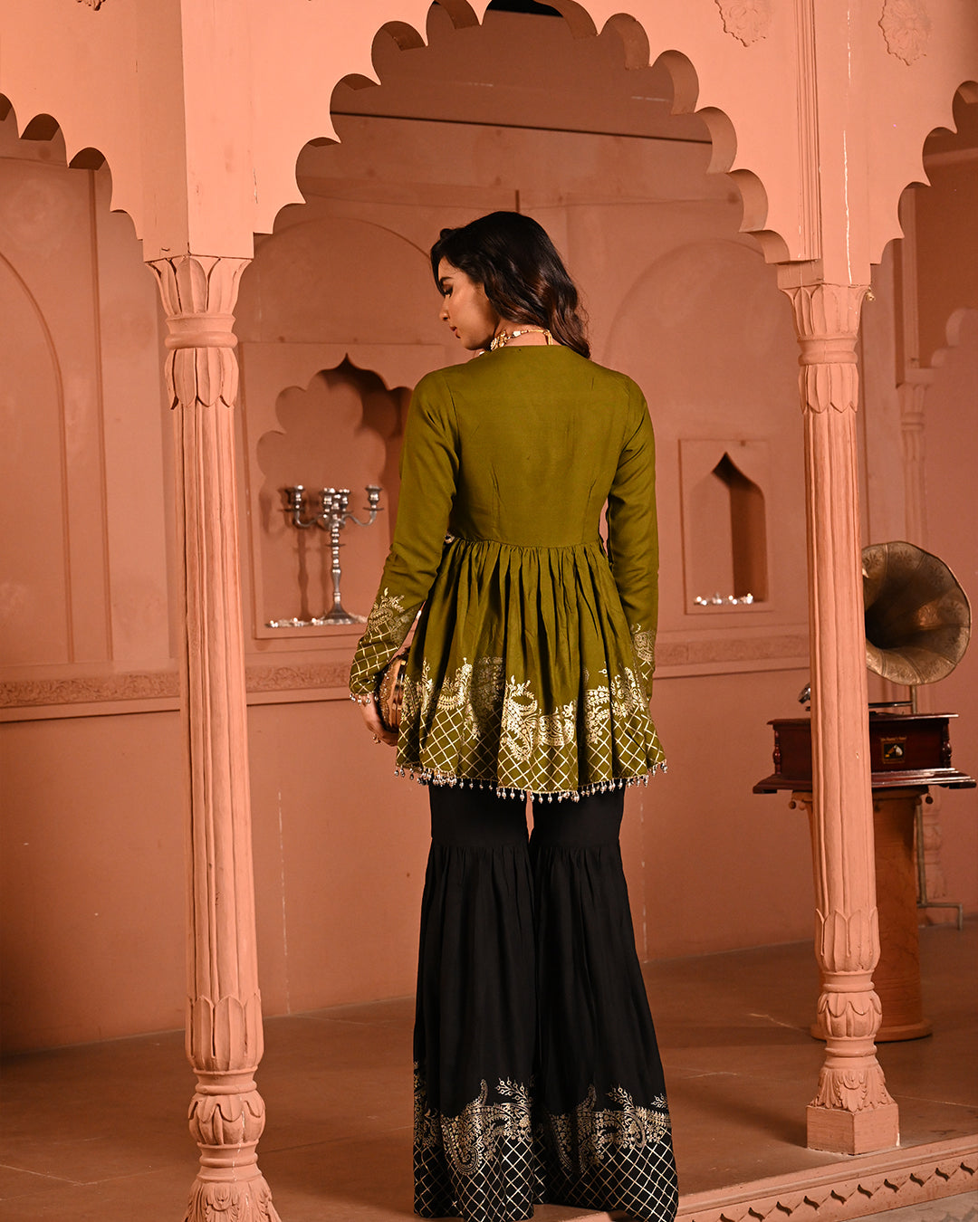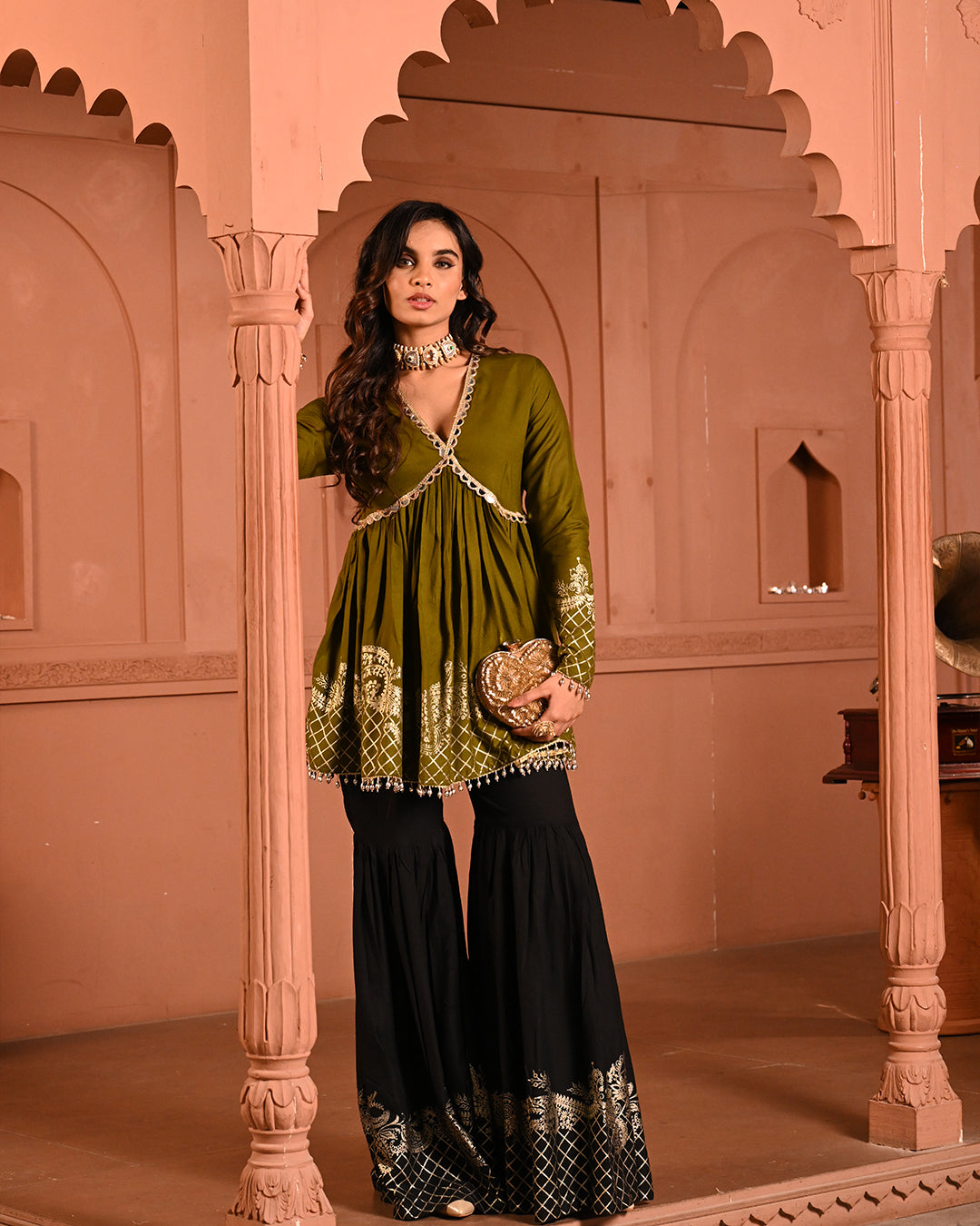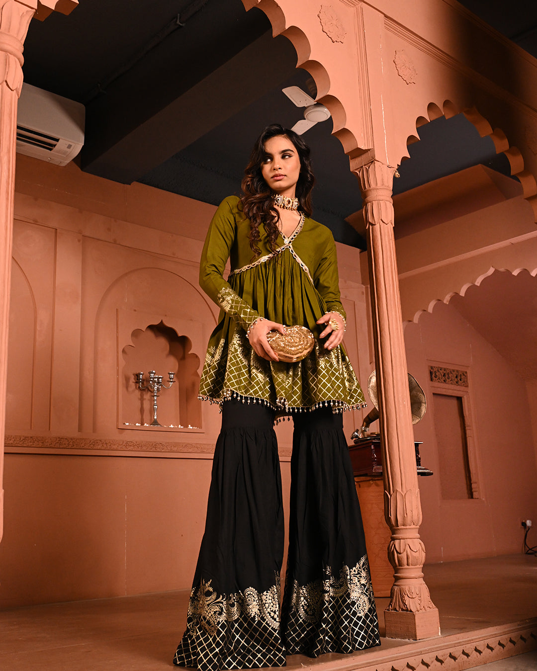 A timeless classic with a festive twist — the Black Aliyah Sharara Set is crafted to turn heads with its graceful silhouette and intricate detailing. The top features a flattering V-neckline and a peplum-style flare that begins just below the bust, accentuating the waist and creating a fluid, feminine shape. The sleeves follow the same fitted-to-flared structure, lending an elegant rhythm to the ensemble.A timeless classic with a festive twist — the Black Aliyah Sharara Set is crafted to turn heads with its graceful silhouette and intricate detailing. The top features a flattering V-neckline and a peplum-style flare that begins just below the bust, accentuating the waist and creating a fluid, feminine shape. The sleeves follow the same fitted-to-flared structure, lending an elegant rhythm to the ensemble.
