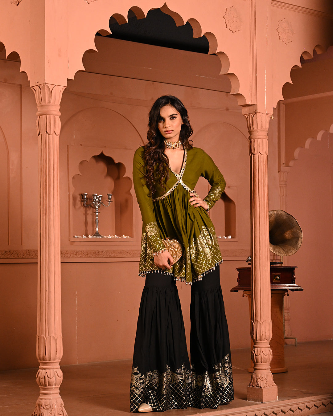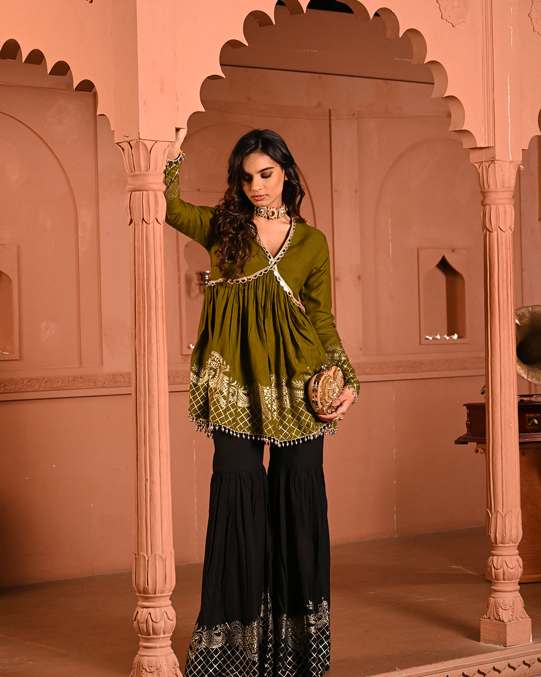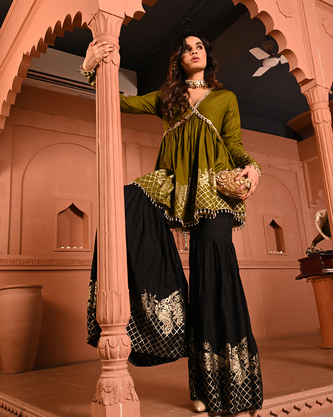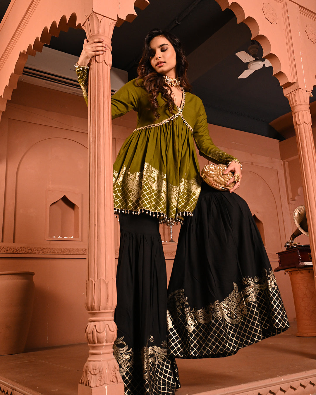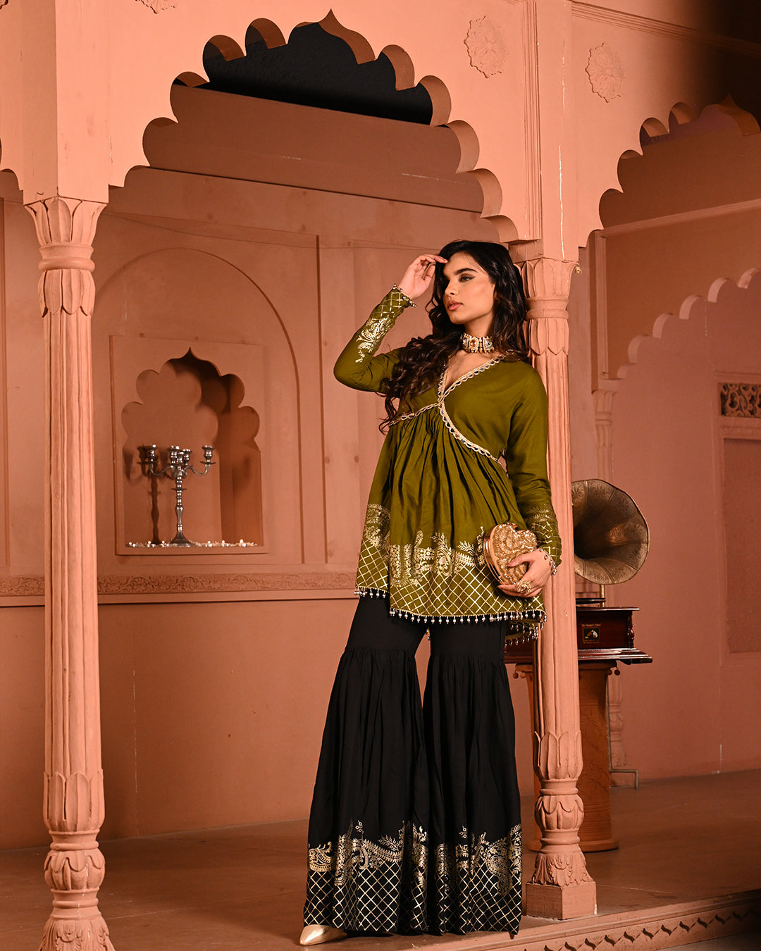 A timeless classic with a festive twist — the Black Aliyah Sharara Set is crafted to turn heads with its graceful silhouette and intricate detailing. The top features a flattering V-neckline and a peplum-style flare that begins just below the bust, accentuating the waist and creating a fluid, feminine shape. The sleeves follow the same fitted-to-flared structure, lending an elegant rhythm to the ensemble.A timeless classic with a festive twist — the Black Aliyah Sharara Set is crafted to turn heads with its graceful silhouette and intricate detailing. The top features a flattering V-neckline and a peplum-style flare that begins just below the bust, accentuating the waist and creating a fluid, feminine shape. The sleeves follow the same fitted-to-flared structure, lending an elegant rhythm to the ensemble.