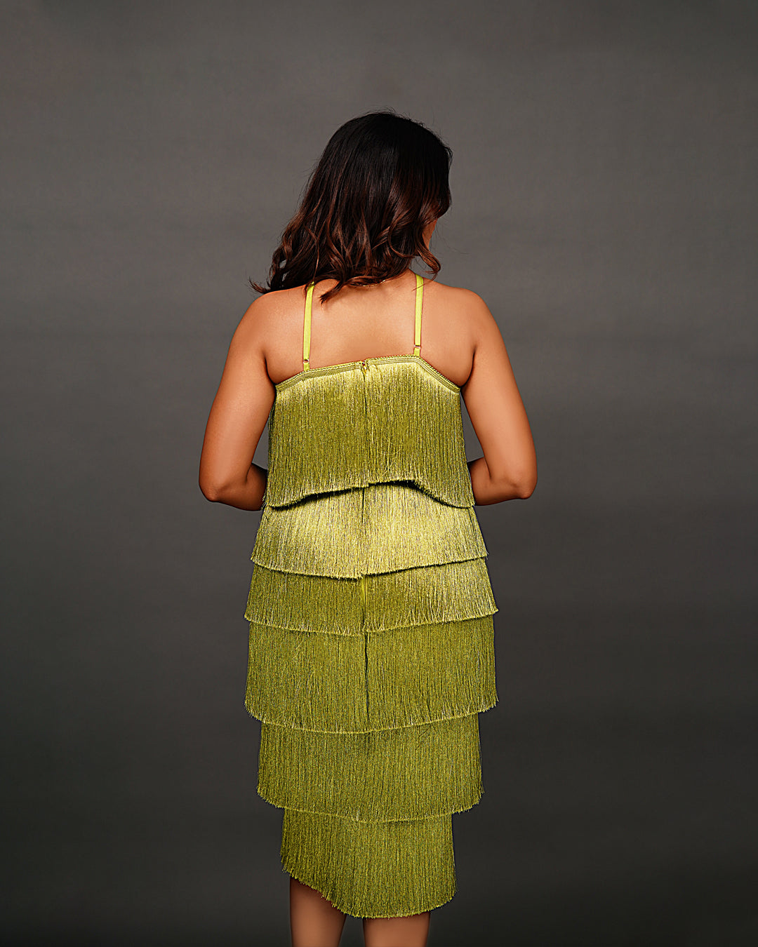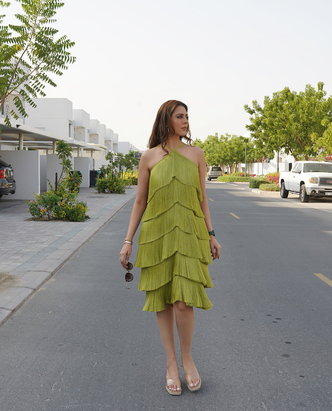 This is an Olive Green, layered fringe dress with a strapped halter neckline. It has been designed in a bodycon shape to hug your curves and give a flared look with the fringes!