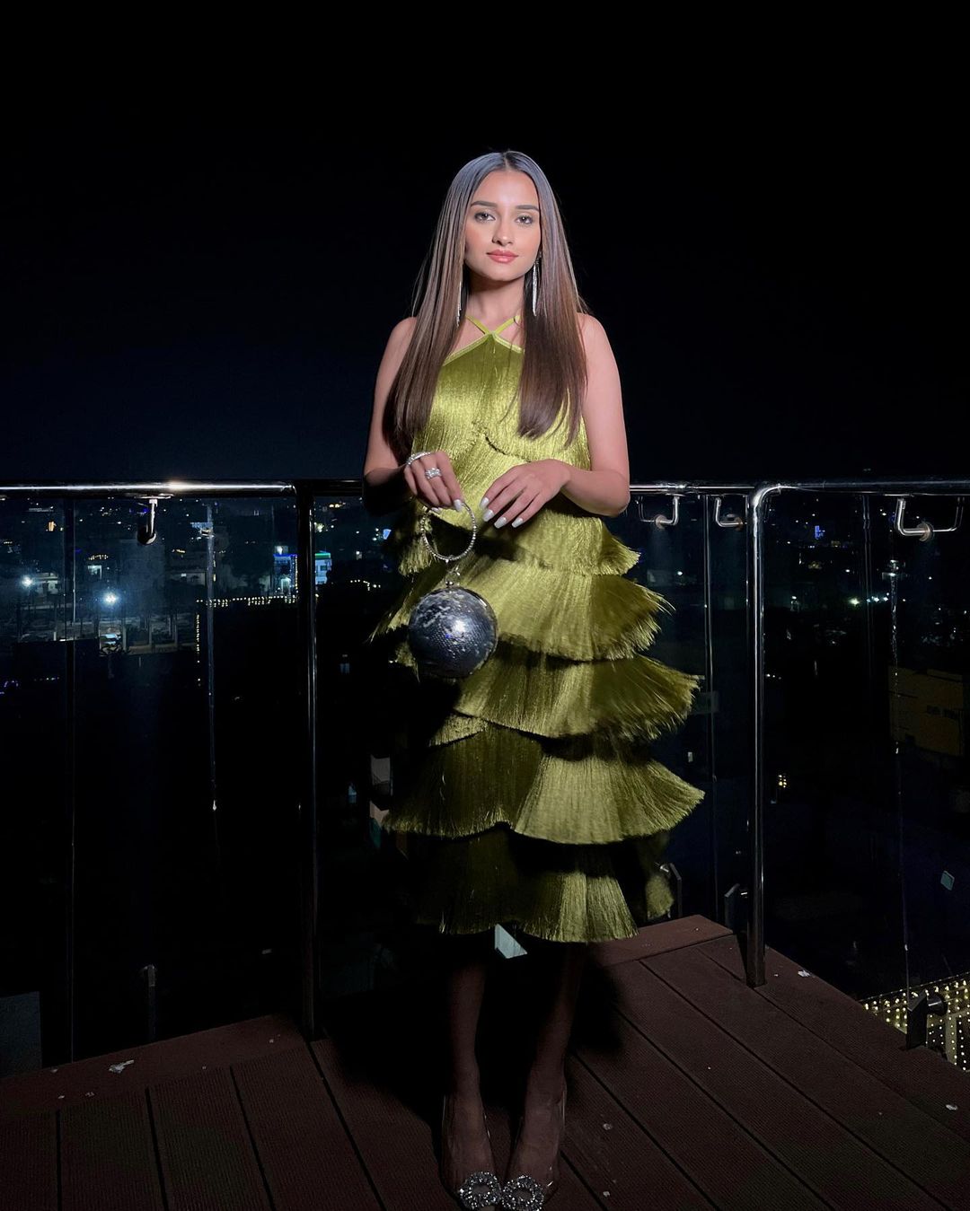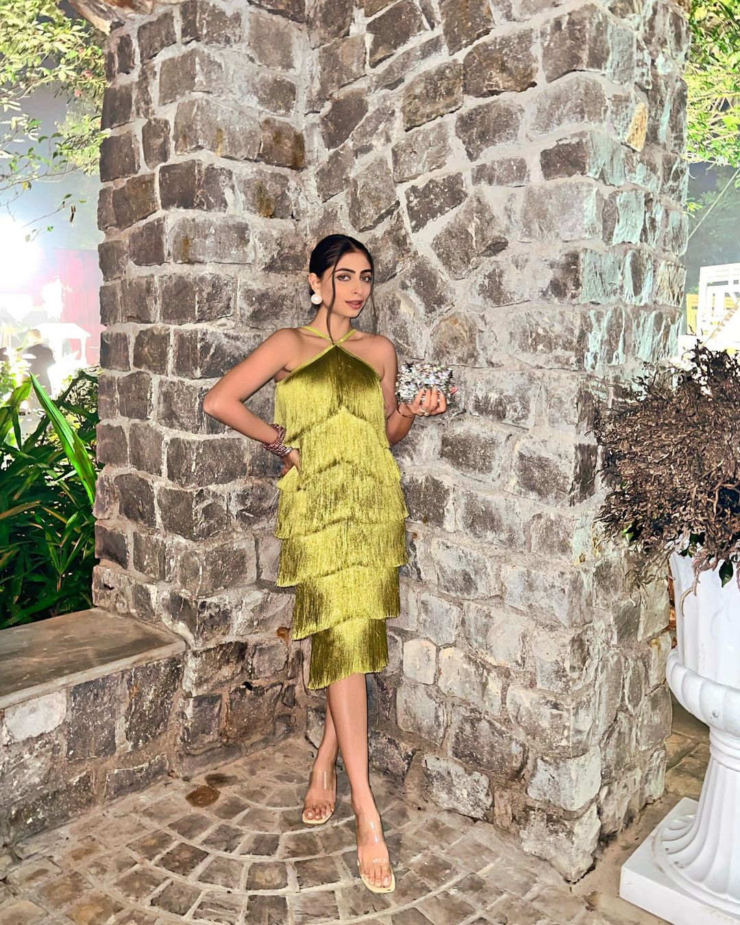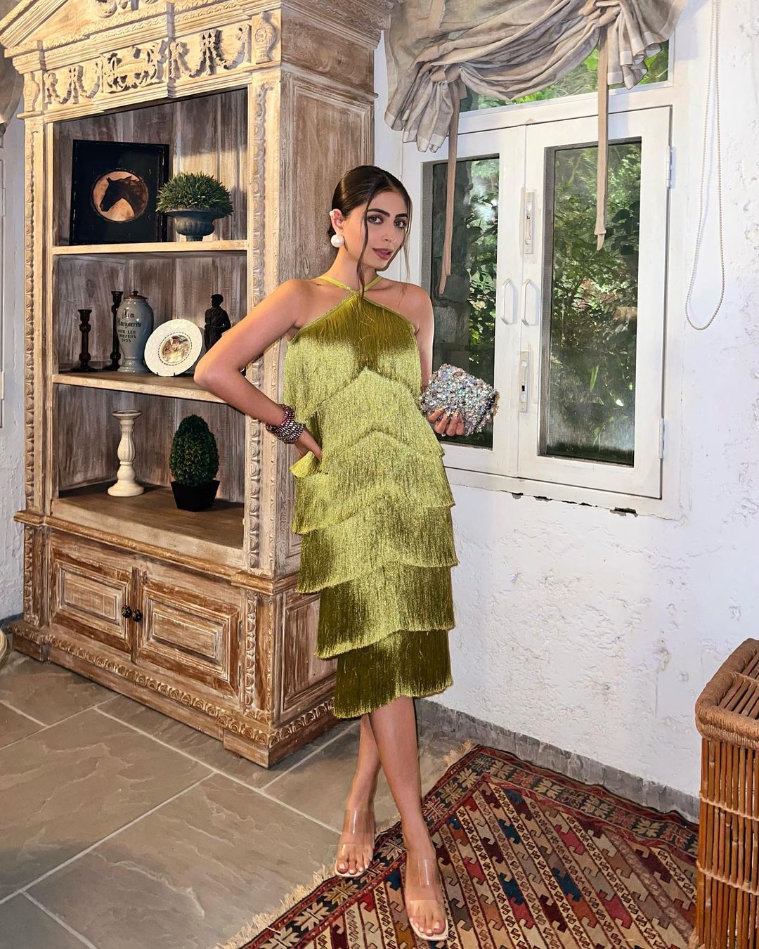 Propelling our Olive Green Dress with a Halter Neck and Attached Strap Wavy, Fitted Fringes, a captivating piece that epitomizes contemporary style and sophistication. This dress is designed to celebrate your individuality and bring out the fashionista in you, offering a perfect blend of elegance and modern charm.