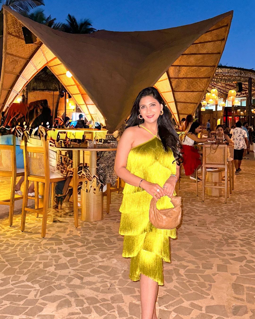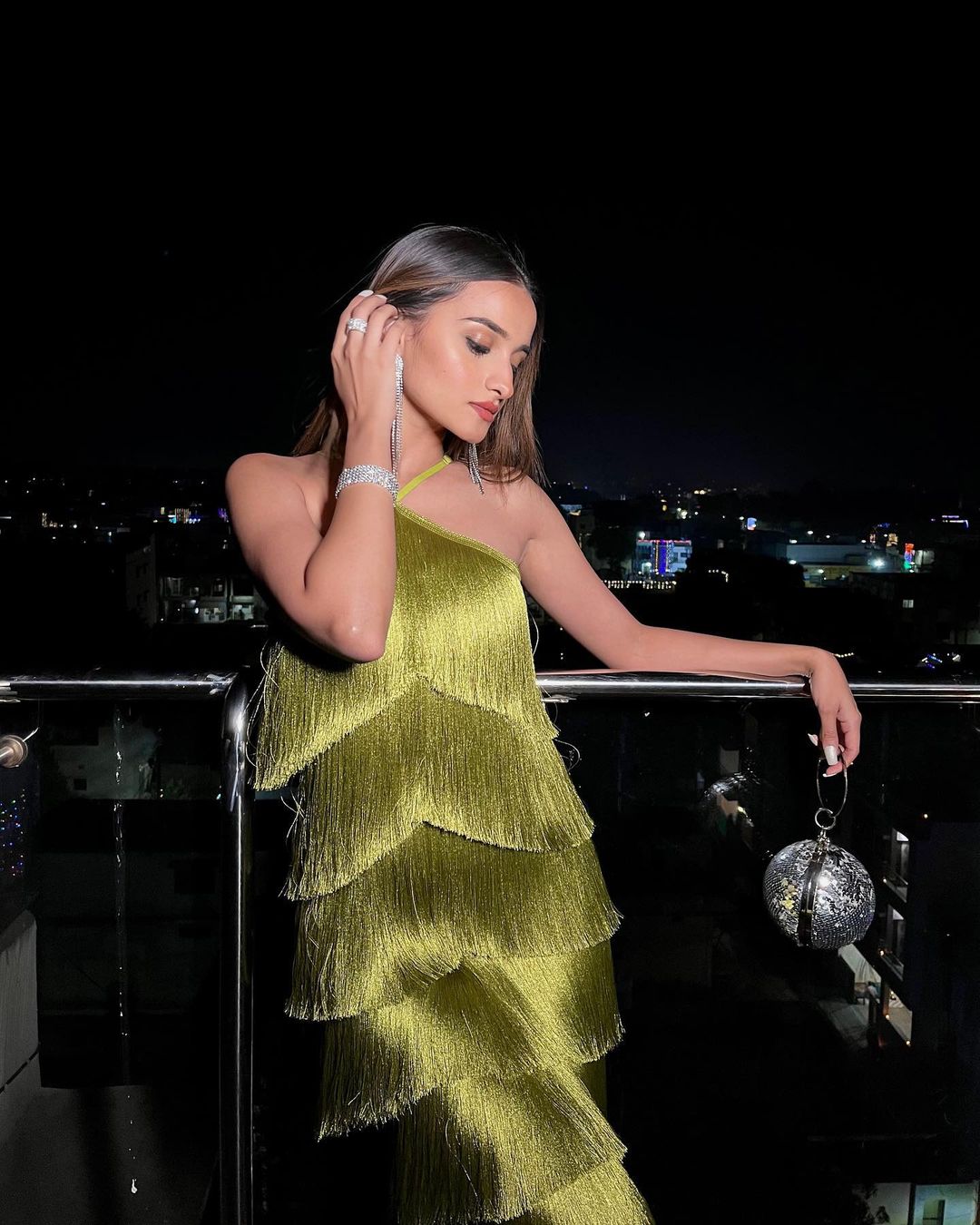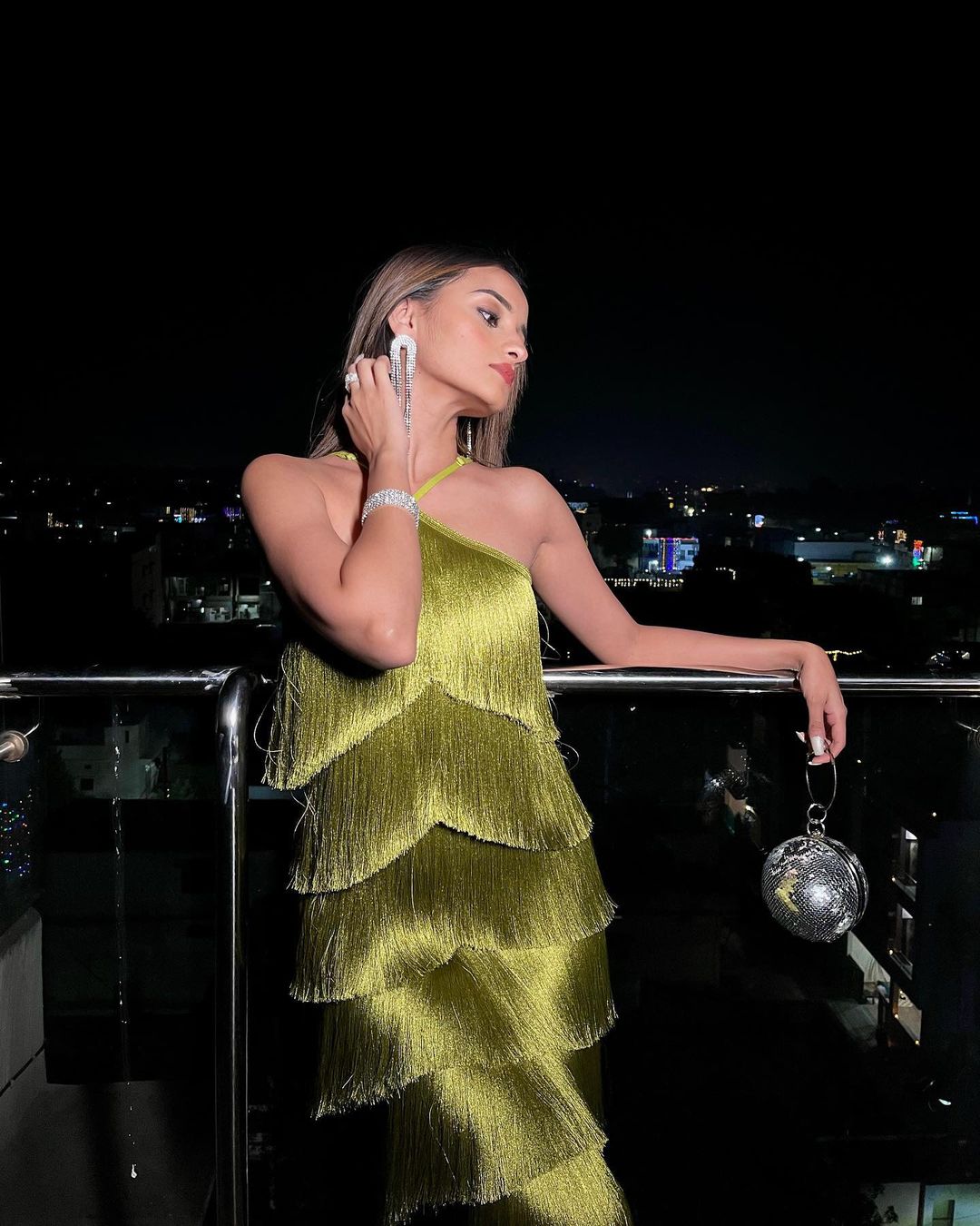 The unique halter neck design with an attached strap creates a bold and alluring silhouette. It gracefully wraps around your neck, accentuating your shoulders and collarbone, while the wavy, fitted fringes cascade down the dress, adding a playful and dynamic movement to your every step.