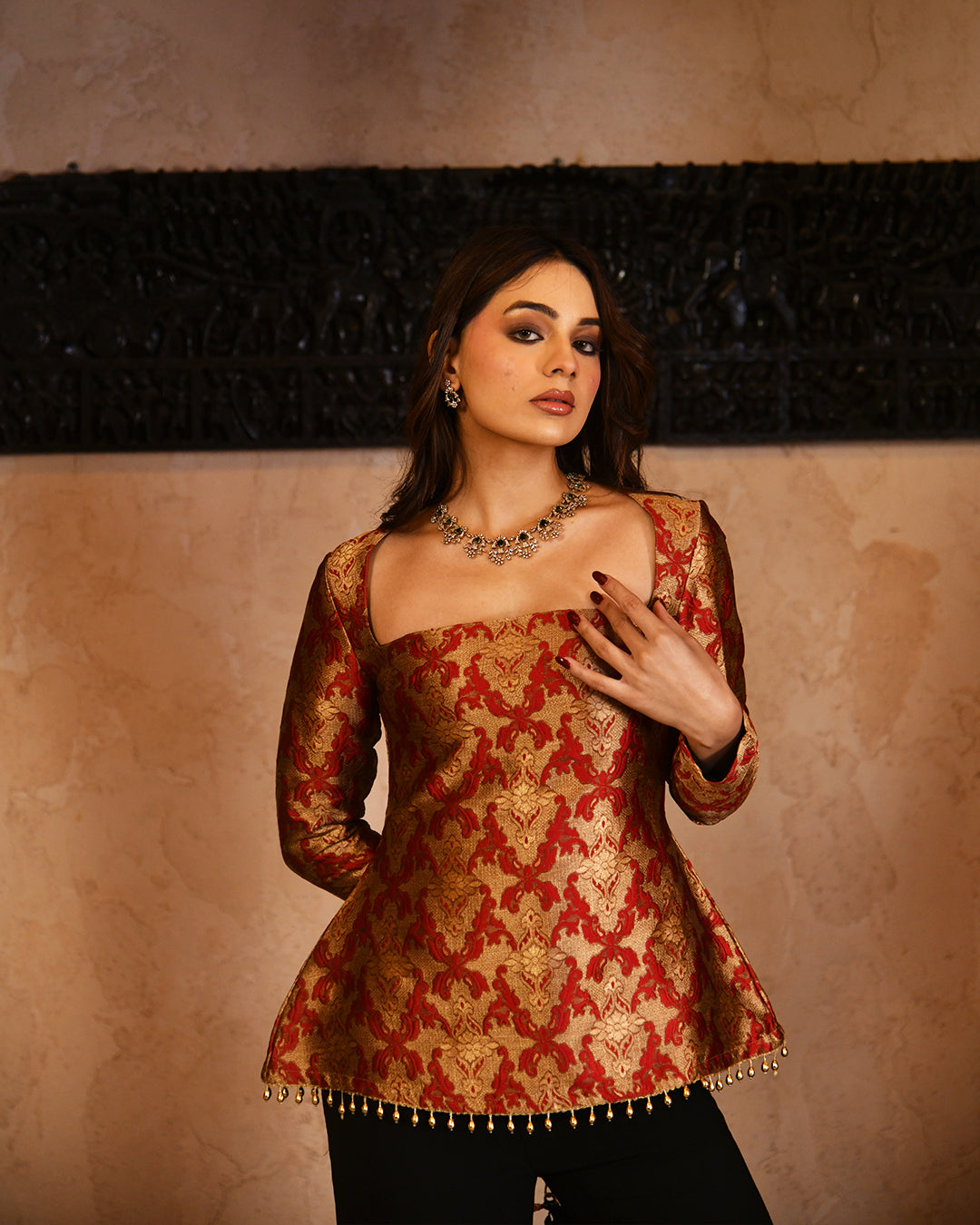 Exuding a regal charm, this structured bodice is a sophisticated blend of traditional artistry and high-fashion tailoring. Expertly crafted from premium jacquard brocade in a resplendent red and gold palette, the garment features an intricate damask motif that offers both visual depth and a luxurious texture. The design is anchored by a precise square neckline and dramatic pointed pagoda shoulders, creating a sharp, architectural silhouette that flows into elegant full-length fitted sleeves.