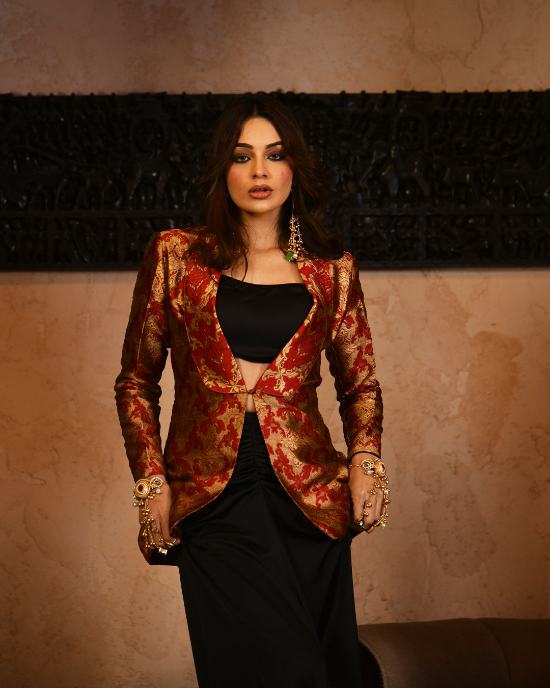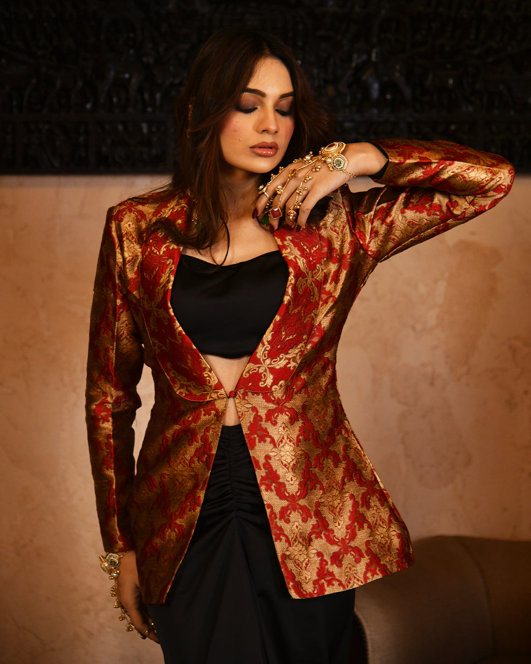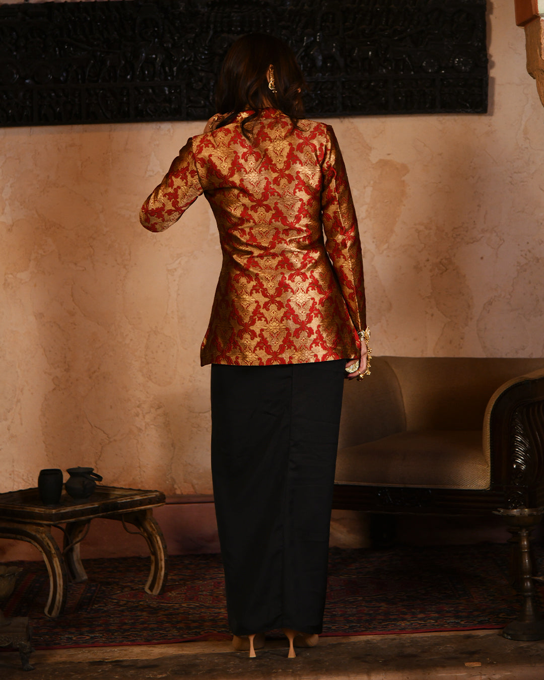 This sophisticated three-piece ensemble masterfully blends traditional textile artistry with a contemporary, structured silhouette. The centerpiece is a longline blazer crafted from rich jacquard brocade, featuring an intricate red and gold damask pattern that exudes regal charm. Its design is elevated by a formal shawl lapel and integrated shoulder pads, which provide a sharp, empowered fit and a clean line through the sleeves.