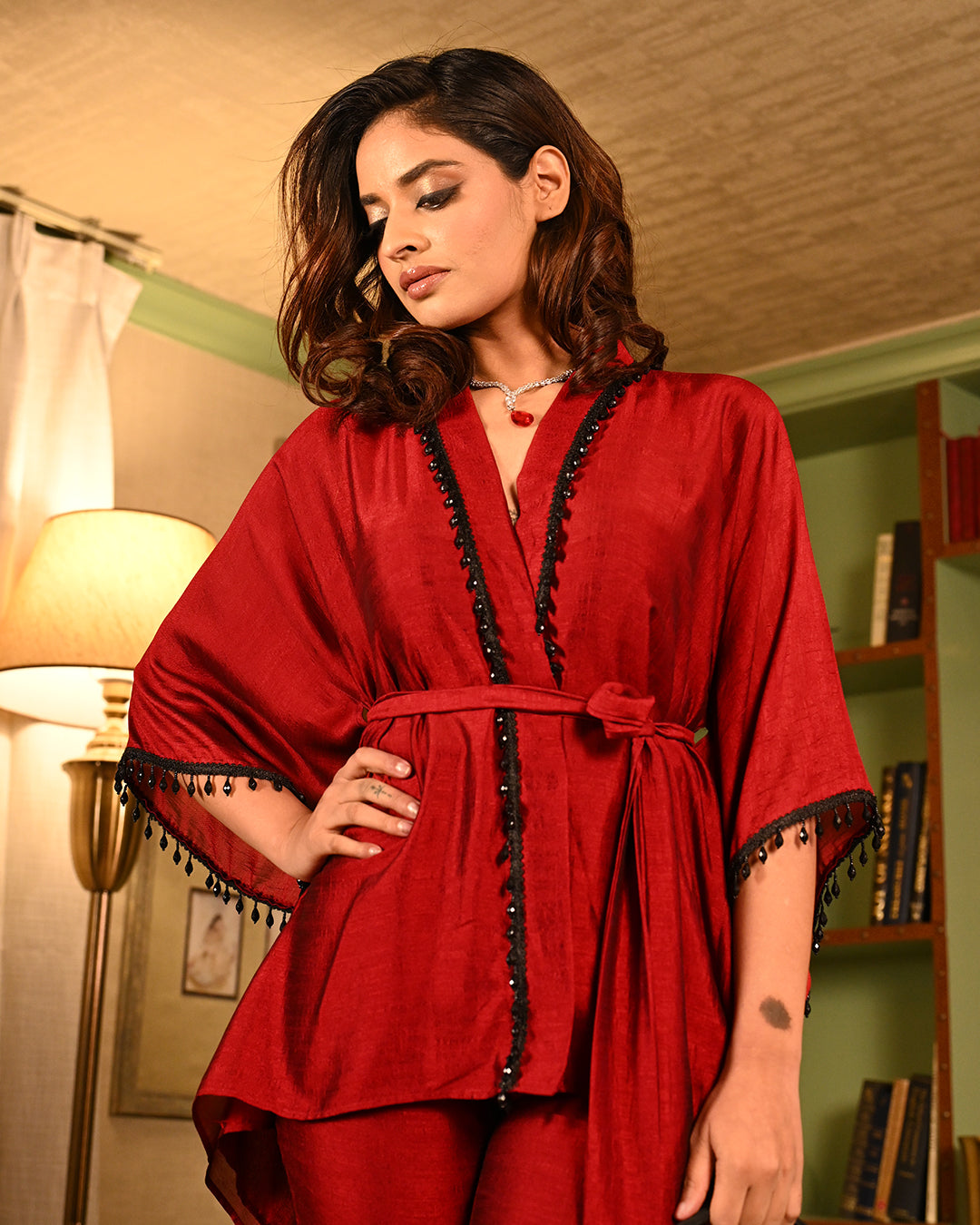 This chic kimono set effortlessly transitions from festive celebrations to semi-formal events. The loose kaftan offers comfort and grace, while the embellished belt adds a touch of structure, creating a flattering silhouette. Paired with flared pants featuring knee-high slits, the ensemble strikes the perfect balance between flowy elegance and modern flair. The outfit exudes understated glamour and can be styled with minimal accessories and light makeup to maintain a sophisticated yet relaxed vibe. Whether for a festive occasion or a semi-formal gathering, this kimono set ensures you stand out with ease and style.