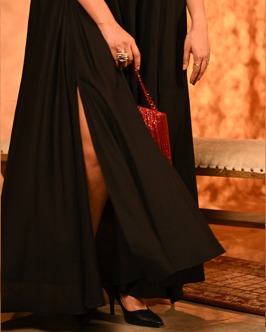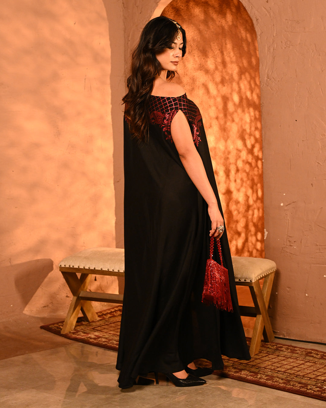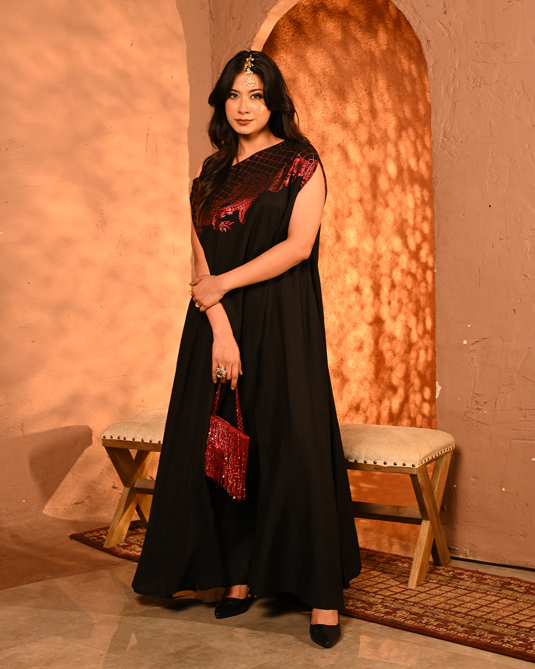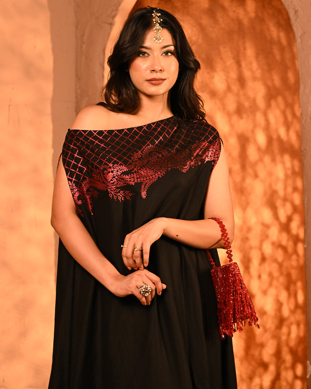 A modern twist on classic kaftan styling, this one-shoulder flared dress is designed for the effortlessly cool. With a relaxed yet flattering silhouette, it gives the illusion of a kaftan but wears like a flowy, flared dress — making it perfect for younger age groups who love comfort without compromising on style. The asymmetric neckline features a drop shoulder that’s beautifully detailed with subtle foiling, adding just the right touch of glam. Thoughtfully designed to cover both armholes for ease and modesty, it also comes with a practical side slit and a hidden pocket to carry your essentials. Whether you’re headed to a day event or a chilled festive evening, this dress brings chic energy with a carefree vibe.