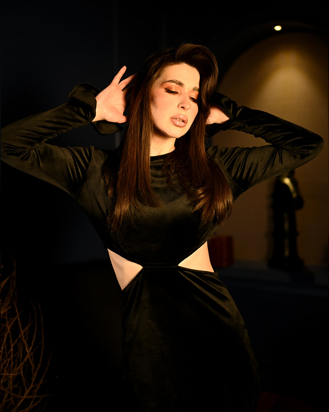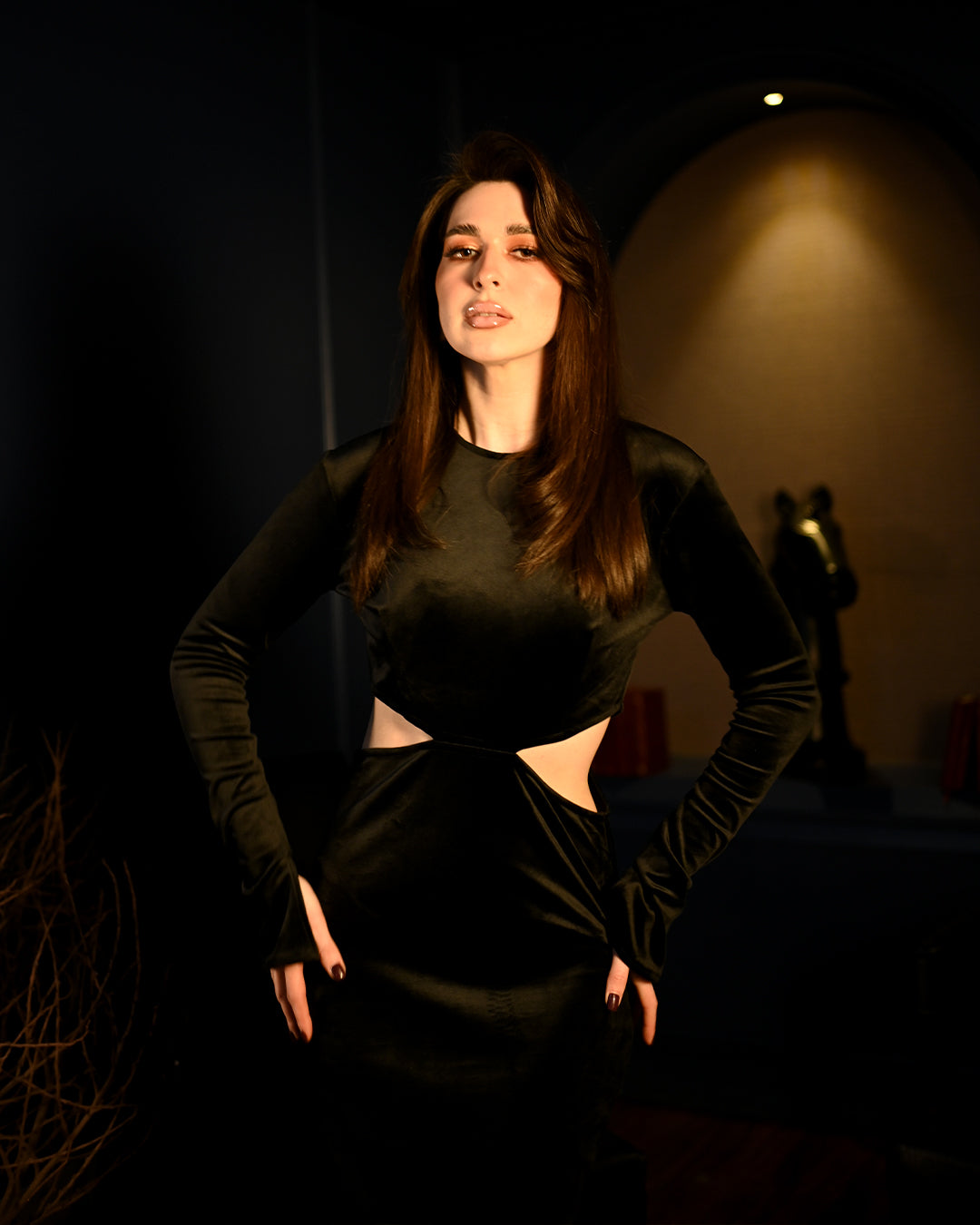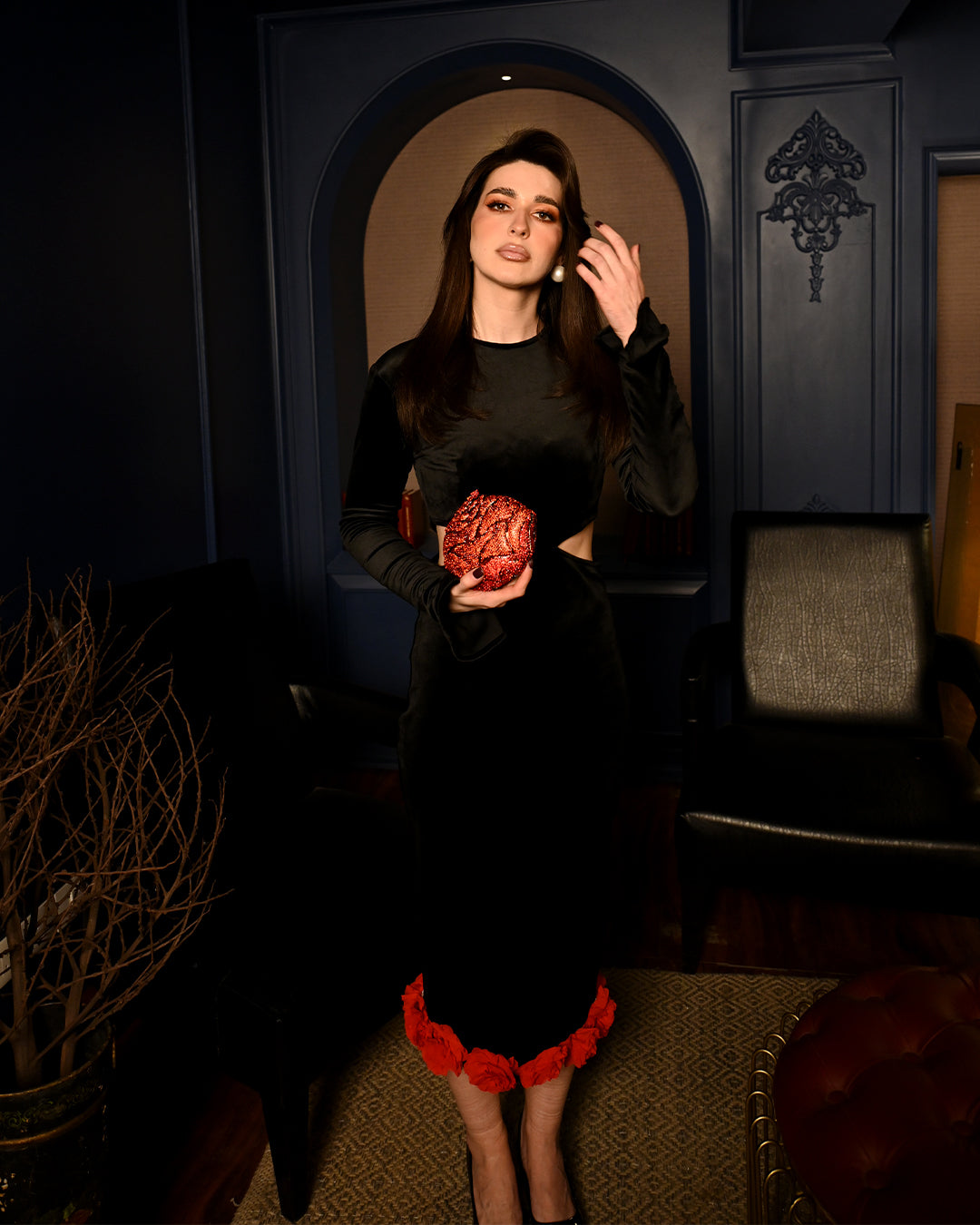 Introducing the Red Rose Alice Dress, a stunning blend of sophistication and allure. Crafted from luxurious black velvet, this midi dress exudes richness and elegance, making it the perfect choice for your most glamorous occasions. The close round neckline lends a refined and timeless look, while the full sleeves with slits at the hem create a unique, close bell-sleeve effect that gracefully drapes over the hands.