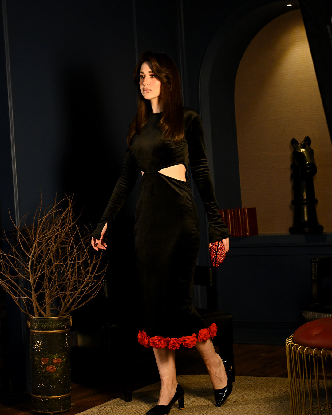 Strategically designed side cutouts enhance your curves, adding a subtle yet captivating element of allure. The fitted silhouette flows seamlessly to the calf-length hem, featuring a discreet back slit for ease of movement and a touch of understated sensuality. A bold red rose embellishment at the hem adds a splash of romance and class, ensuring you stand out with its striking detail.