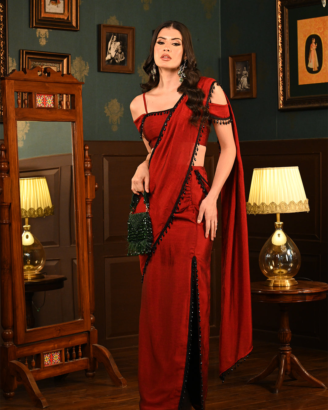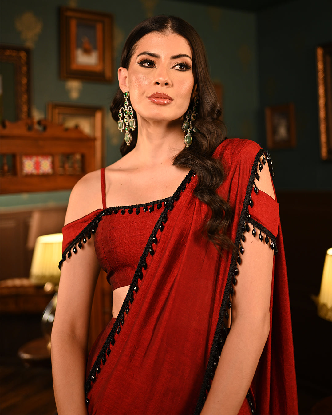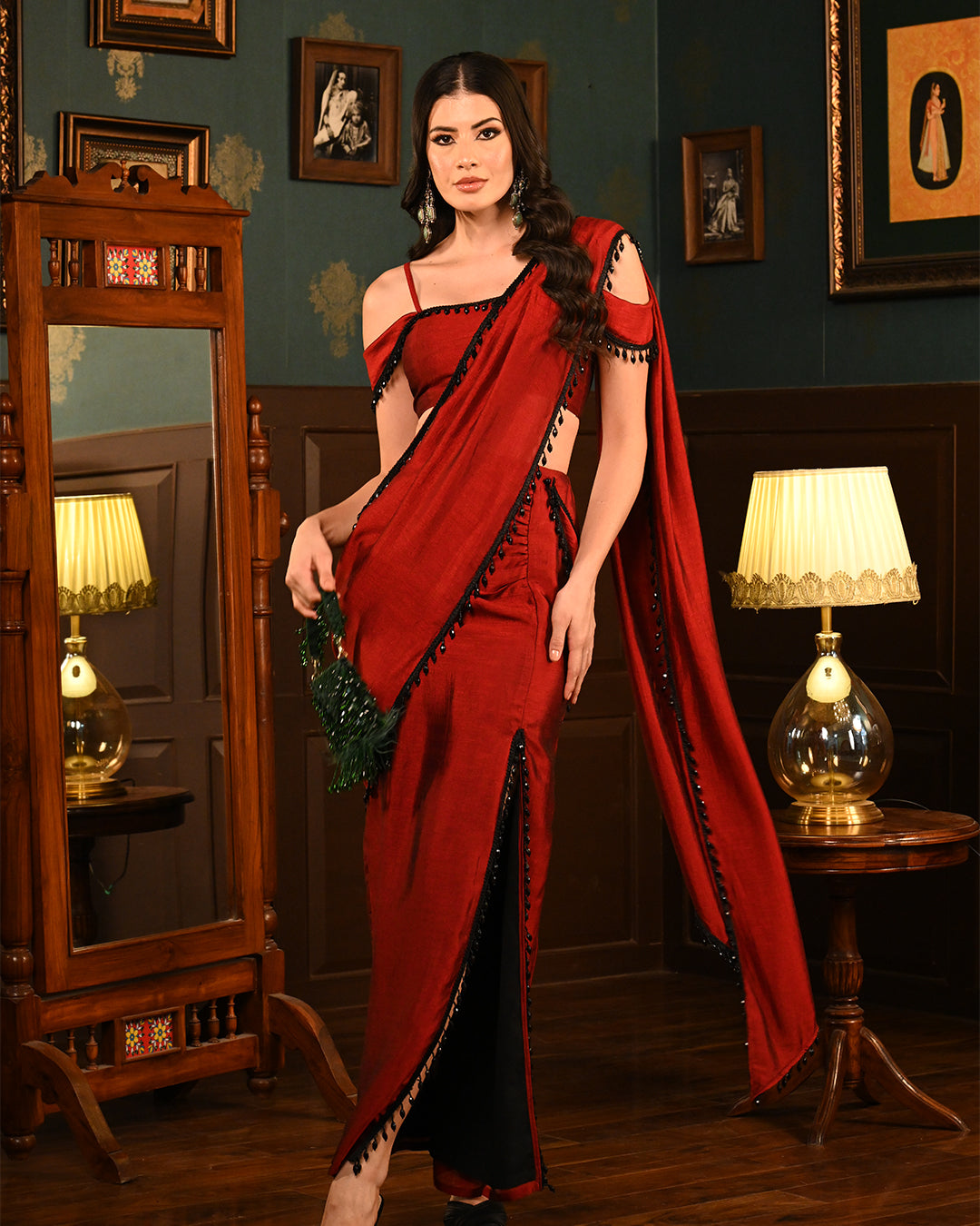 This modern saree combines tradition with versatility, featuring a detachable pallu for endless styling options. Perfect for both corporate settings and festive occasions, it drapes effortlessly and adapts to your look. Pair it with heels, a chic clutch, and statement earrings for a sophisticated, contemporary ensemble.