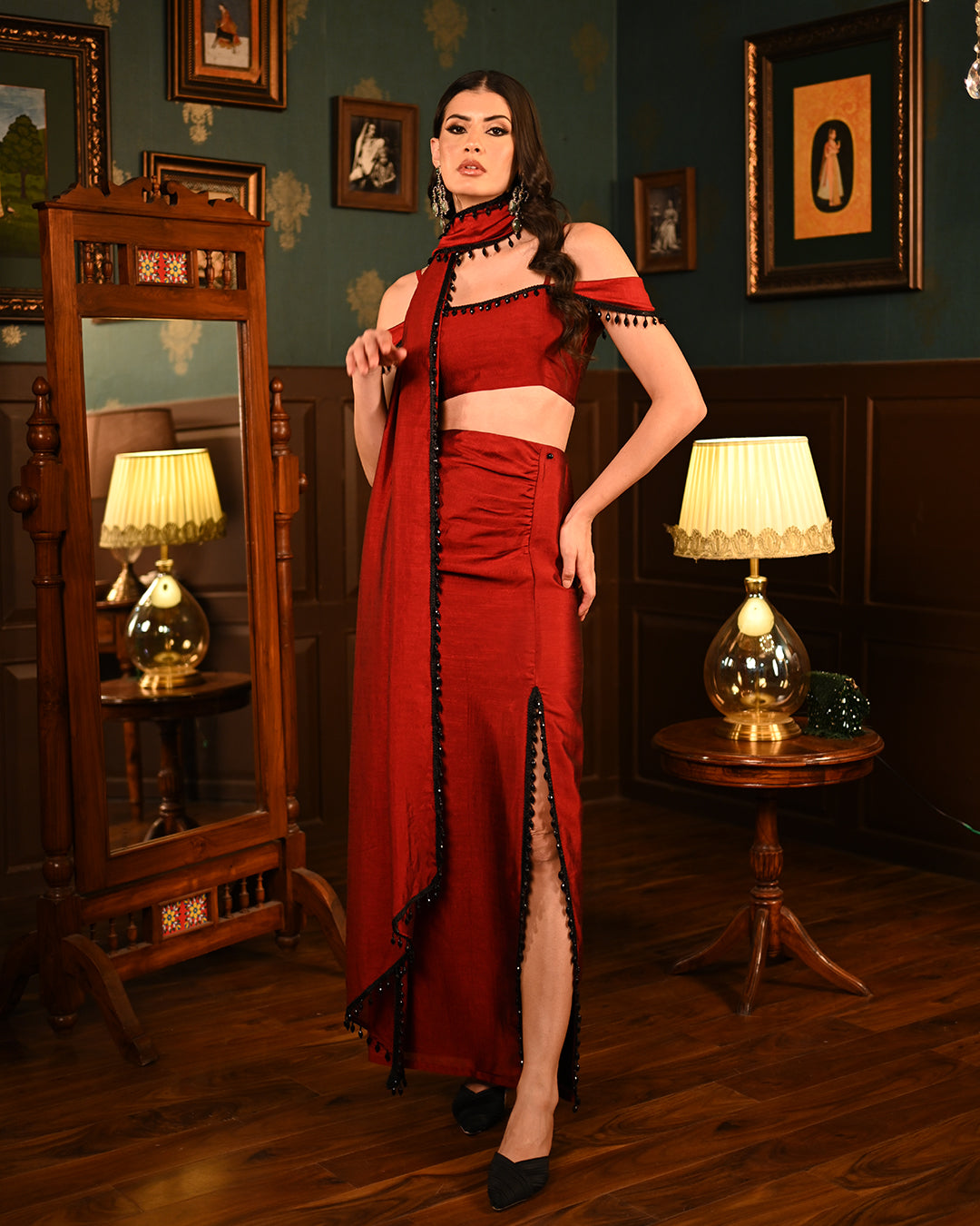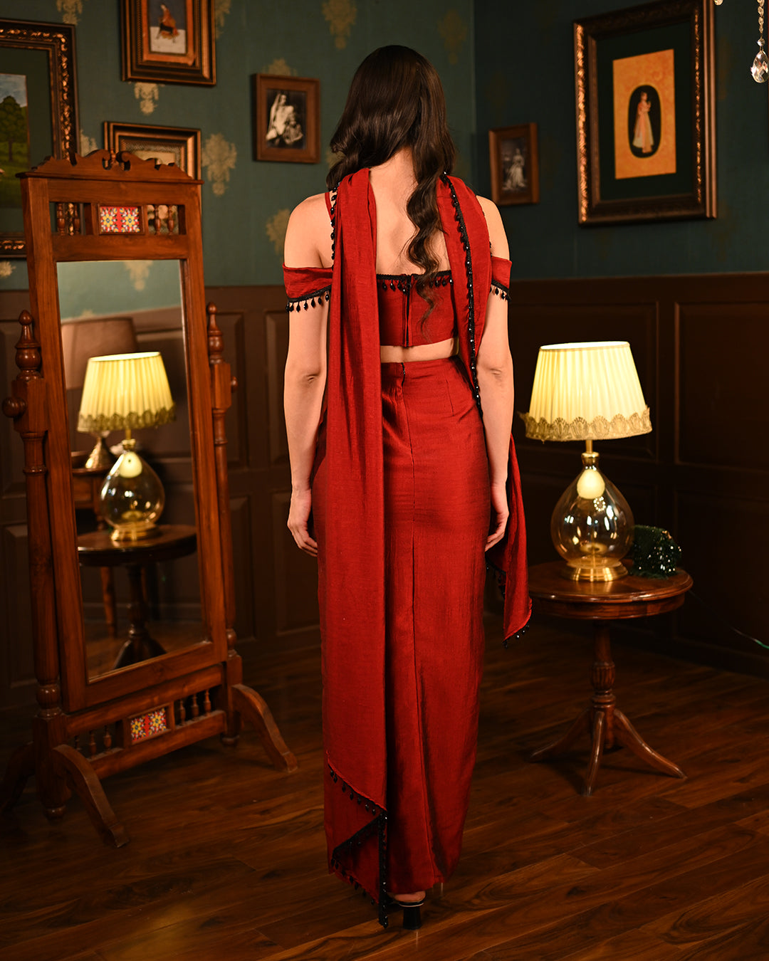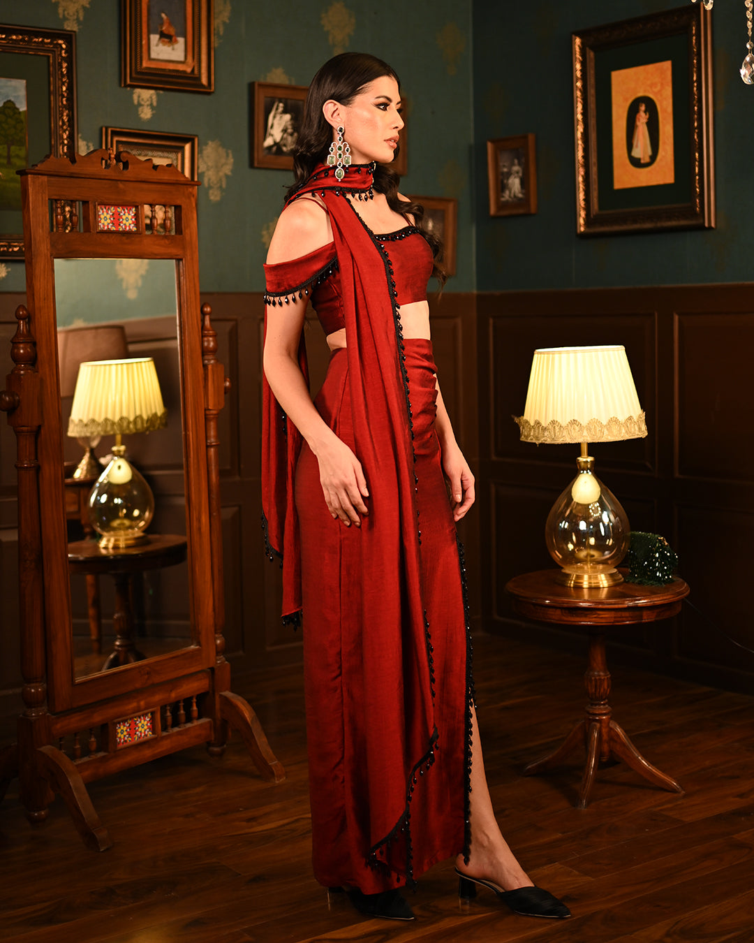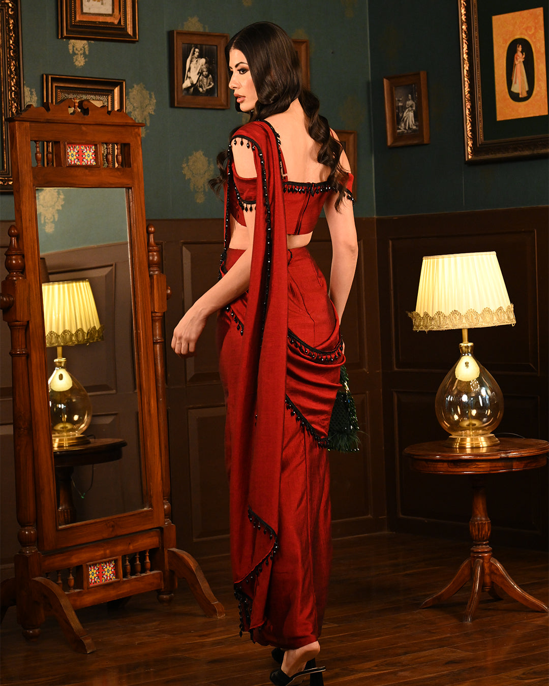 This modern saree combines tradition with versatility, featuring a detachable pallu for endless styling options. Perfect for both corporate settings and festive occasions, it drapes effortlessly and adapts to your look. Pair it with heels, a chic clutch, and statement earrings for a sophisticated, contemporary ensemble.