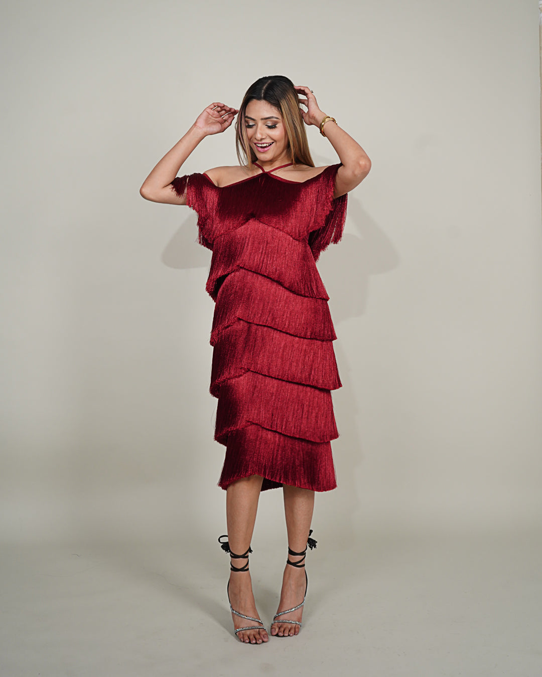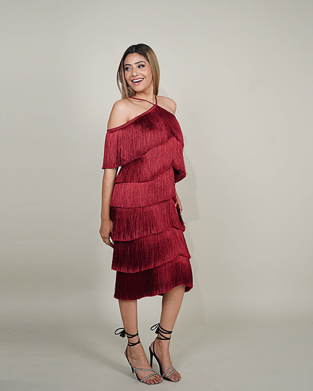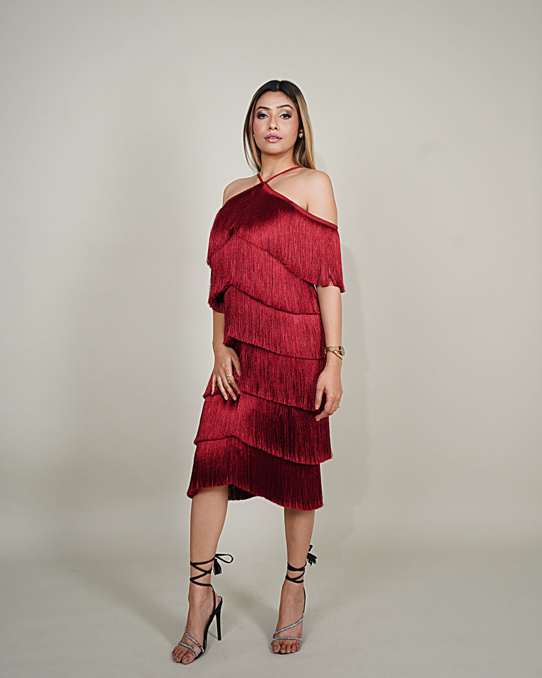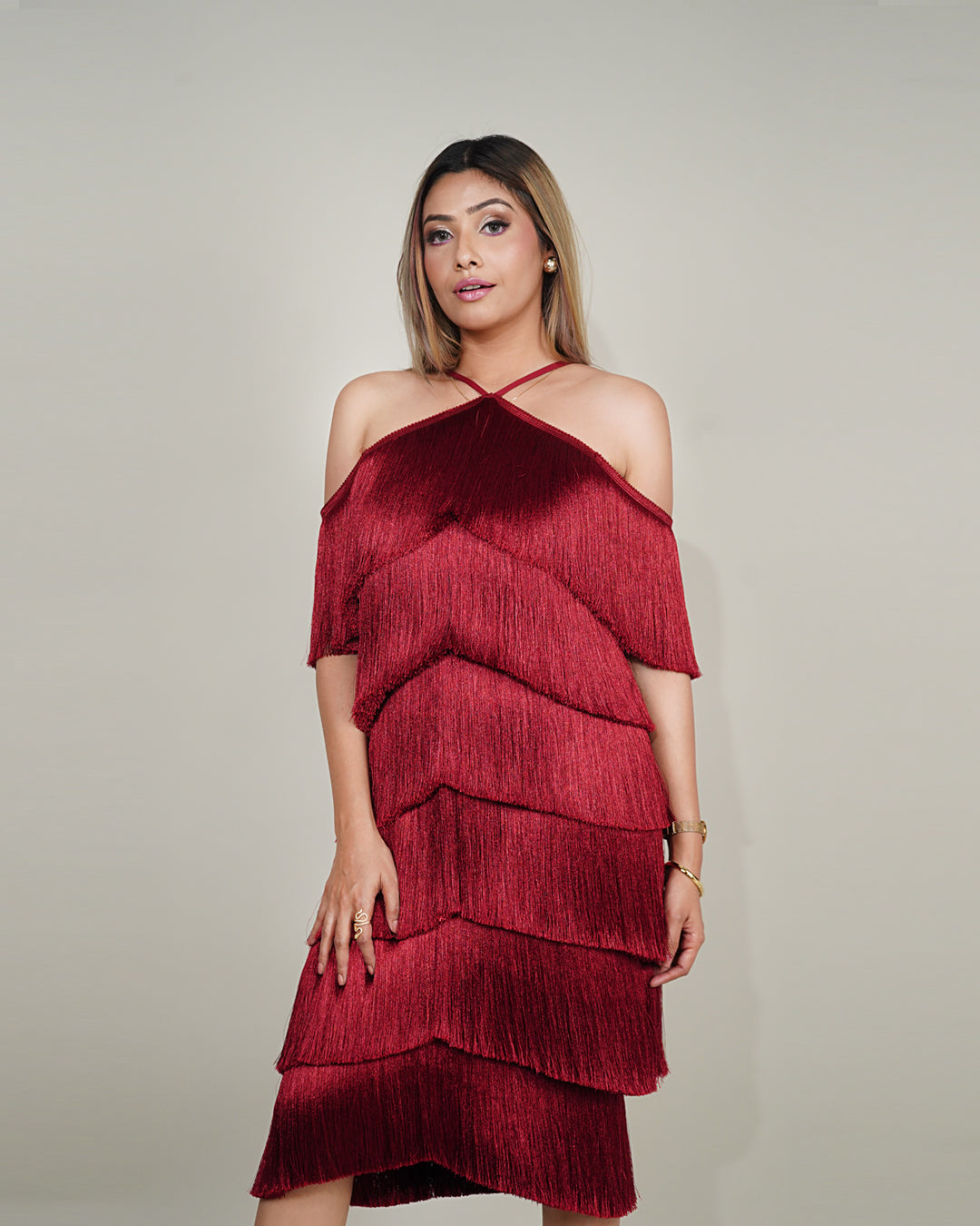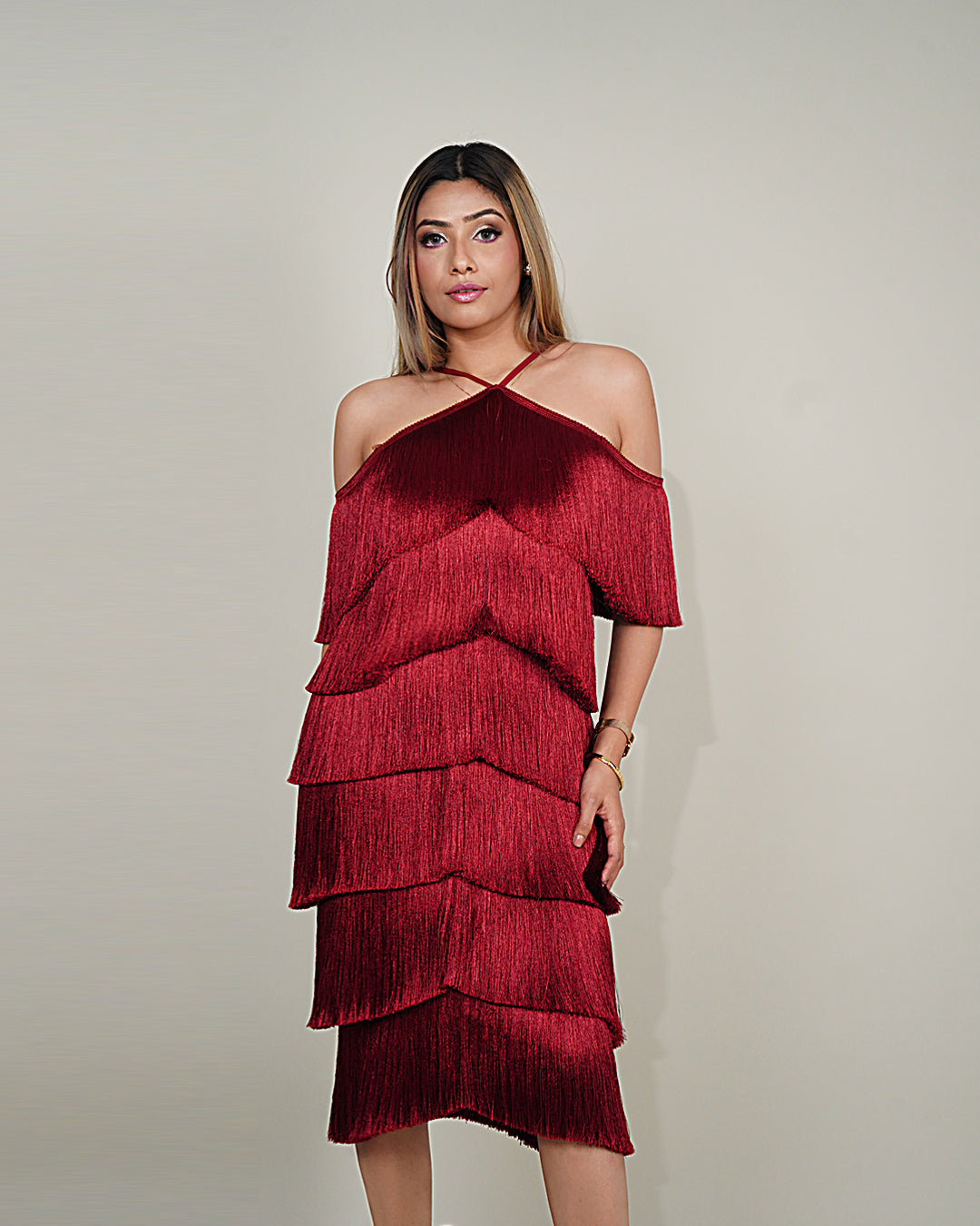 A standout feature of this dress is the meticulously crafted layered fringes that gracefully dance with every step, creating a dynamic and eye-catching movement. These fringe details add texture and dimension and contribute to a sense of movement, ensuring you make a grand entrance at any event.