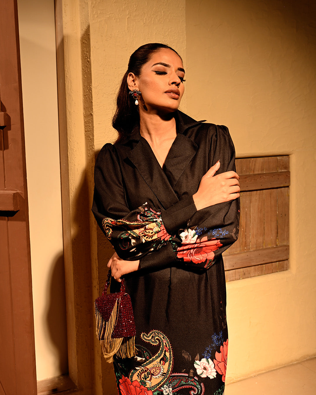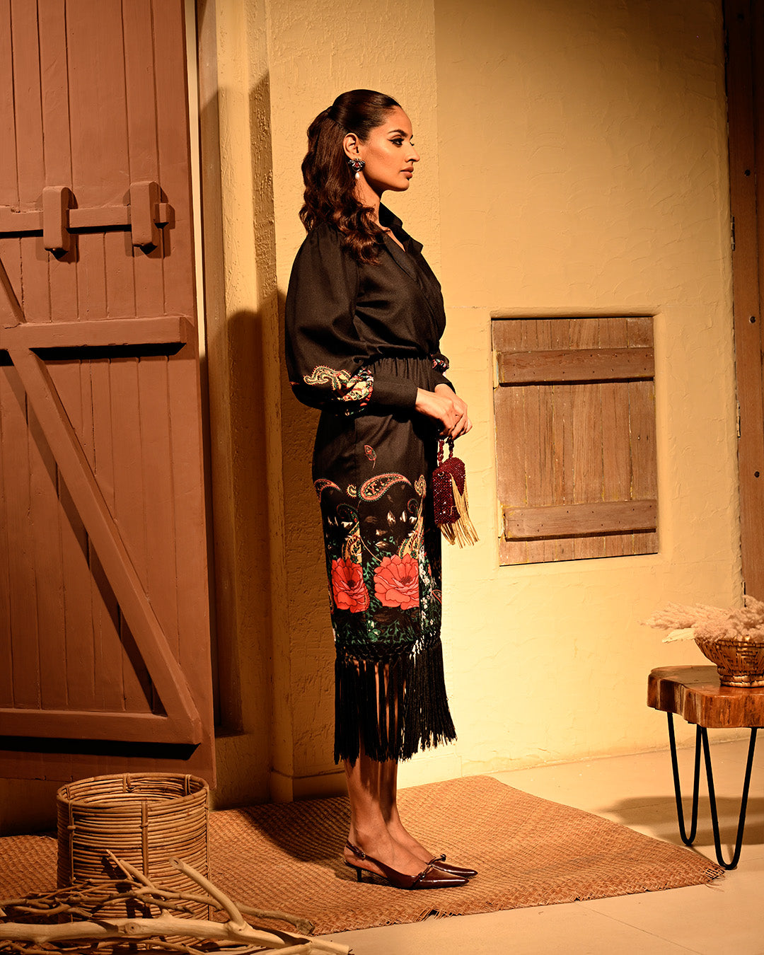 The Rosy Shirt Dress is one of our most flattering silhouettes — crafted in breathable cotton with a straight, non-clingy fall that keeps it easy and breezy, even with full sleeves. The blazer-style collar adds a touch of structure, while the fringe detail and balanced rose print bring in that playful charm. Perfectly poised between formal and festive.
