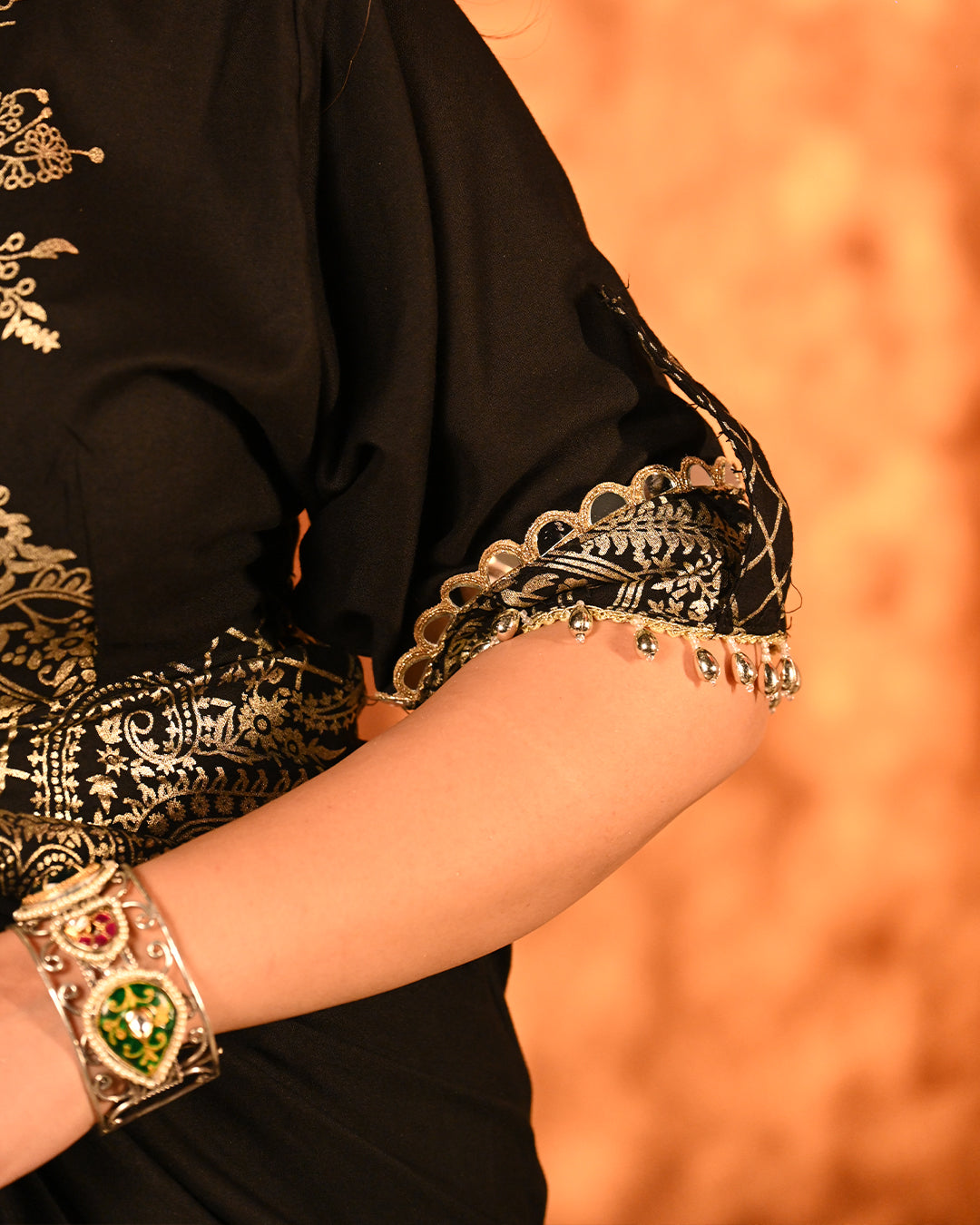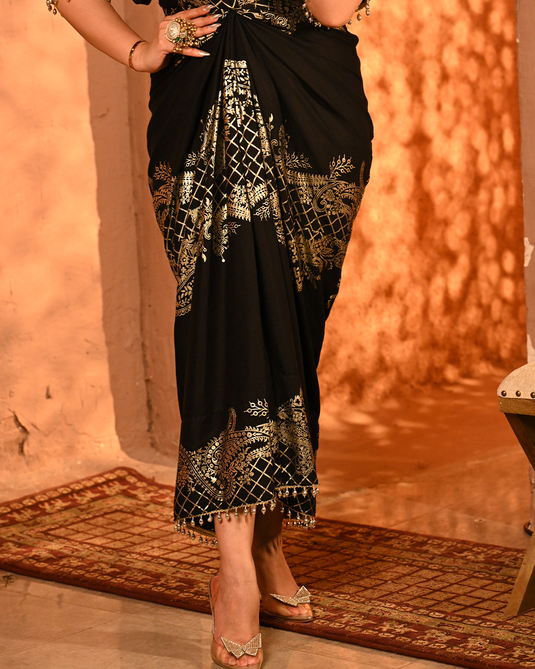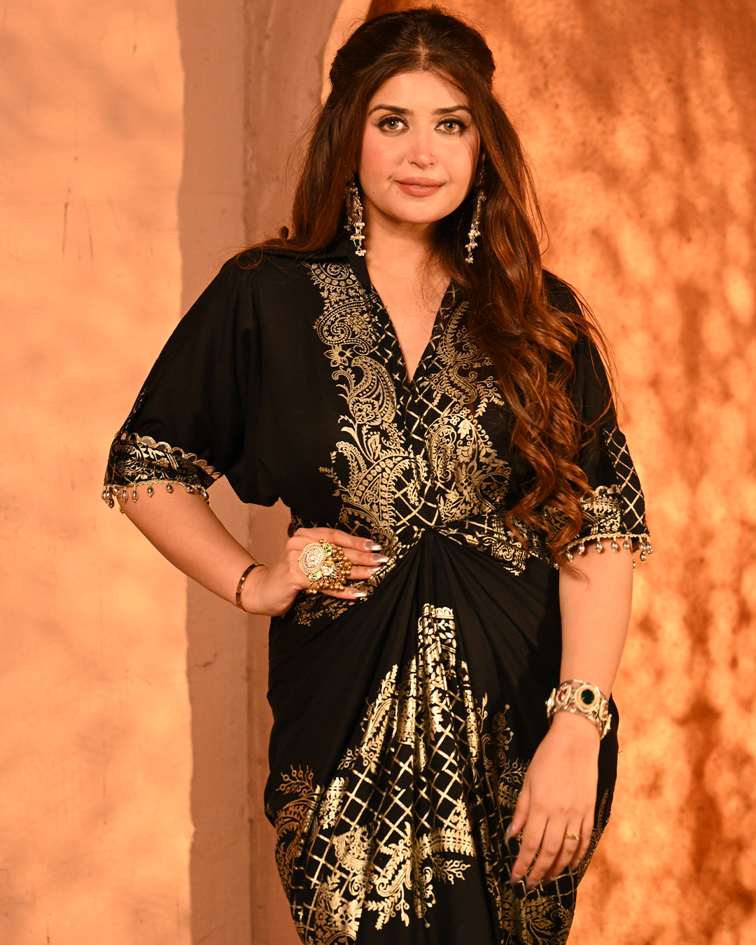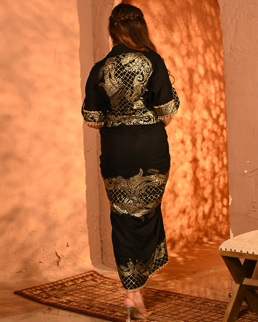 This isn’t your usual shirtdress — it’s a fresh take on one of our best-selling silhouettes, redesigned to stand out. Featuring 3/4th sleeves and a classic collared neckline with a button-down placket on the upper body, it brings the structure of a shirt together with the ease of a dress. What truly sets it apart is its dramatic lower half, which flows into a draped dhoti-style skirt — creating a fluid, layered look that moves beautifully. The entire piece is adorned with intricate printed detailing that’s thoughtfully placed, while the triple-layered foil border adds richness and festive flair without overpowering the silhouette. Lace accents run along key seams, giving it a handcrafted touch that elevates the entire design. This shirtdress is a perfect fusion of structured tailoring and soft draping, making it ideal for festive brunches, intimate get-togethers, or any occasion where you want to be comfortable yet unforgettable.